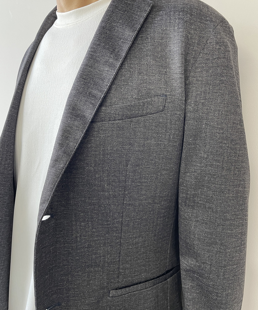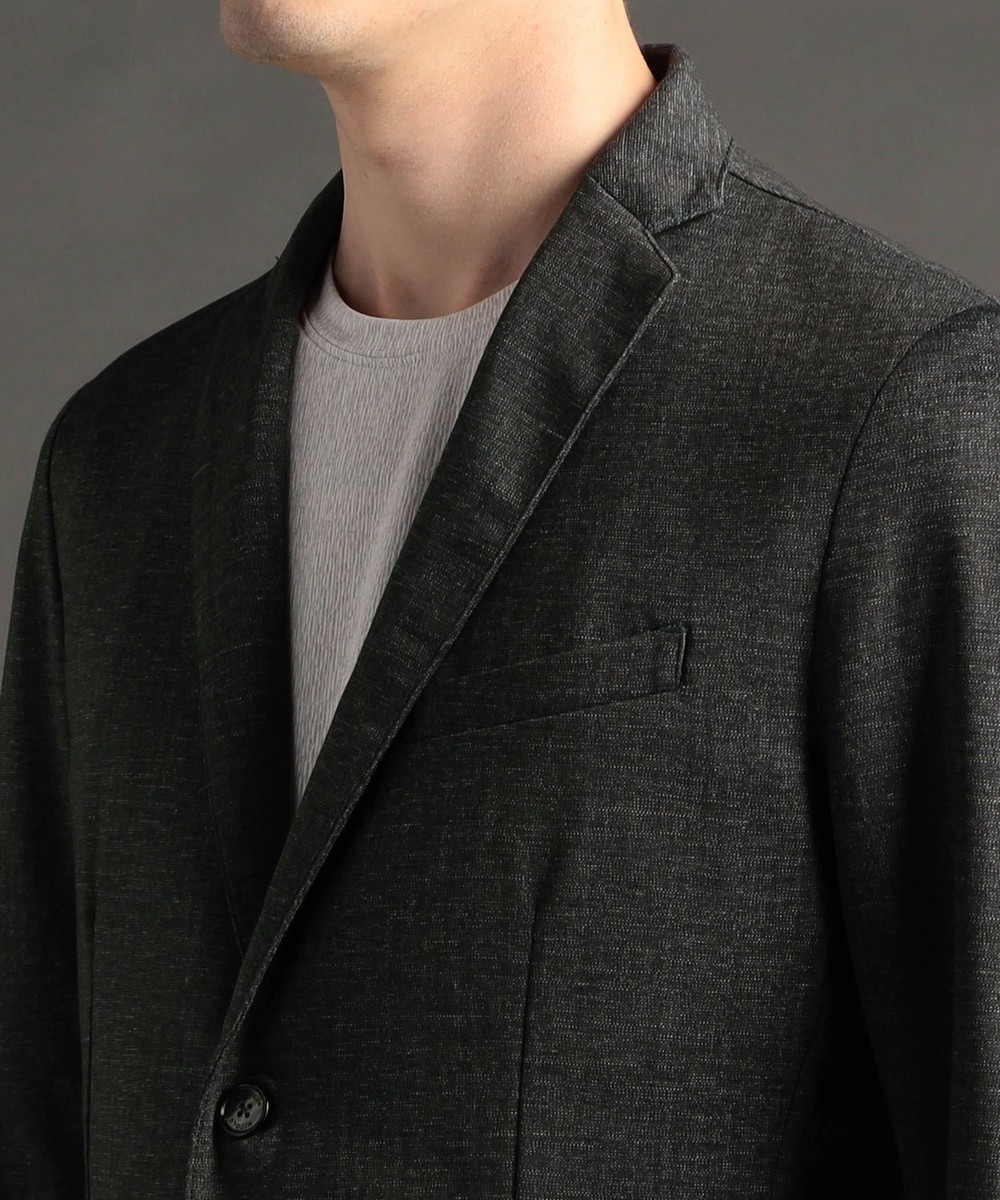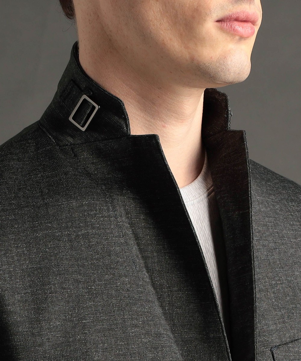 衿裏にタブベルトを装備して、ノーフラップポケットデザインを採用した二つ釦コンバーチブルジャケット。