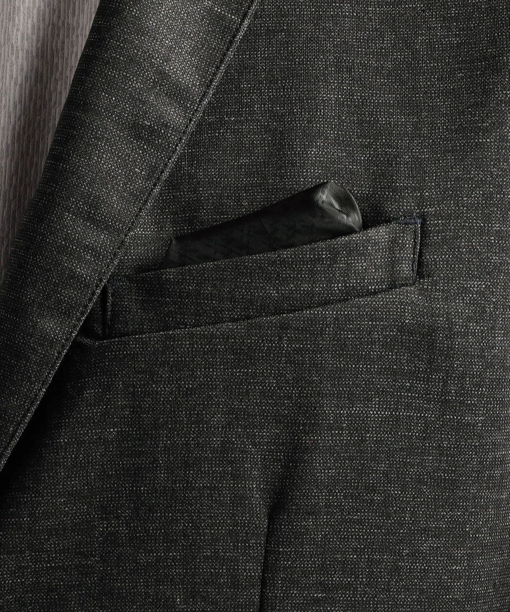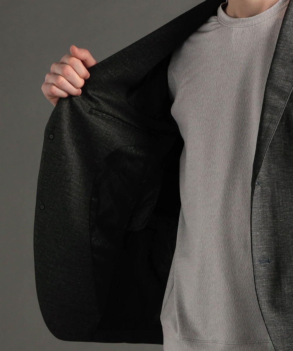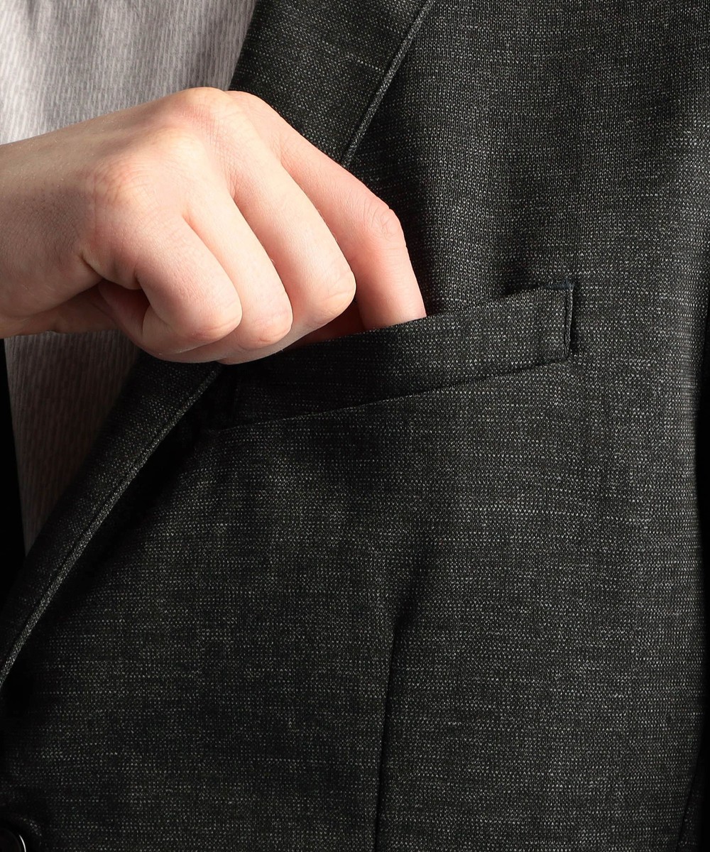 衿裏にタブベルトを装備して、ノーフラップポケットデザインを採用した二つ釦コンバーチブルジャケット。