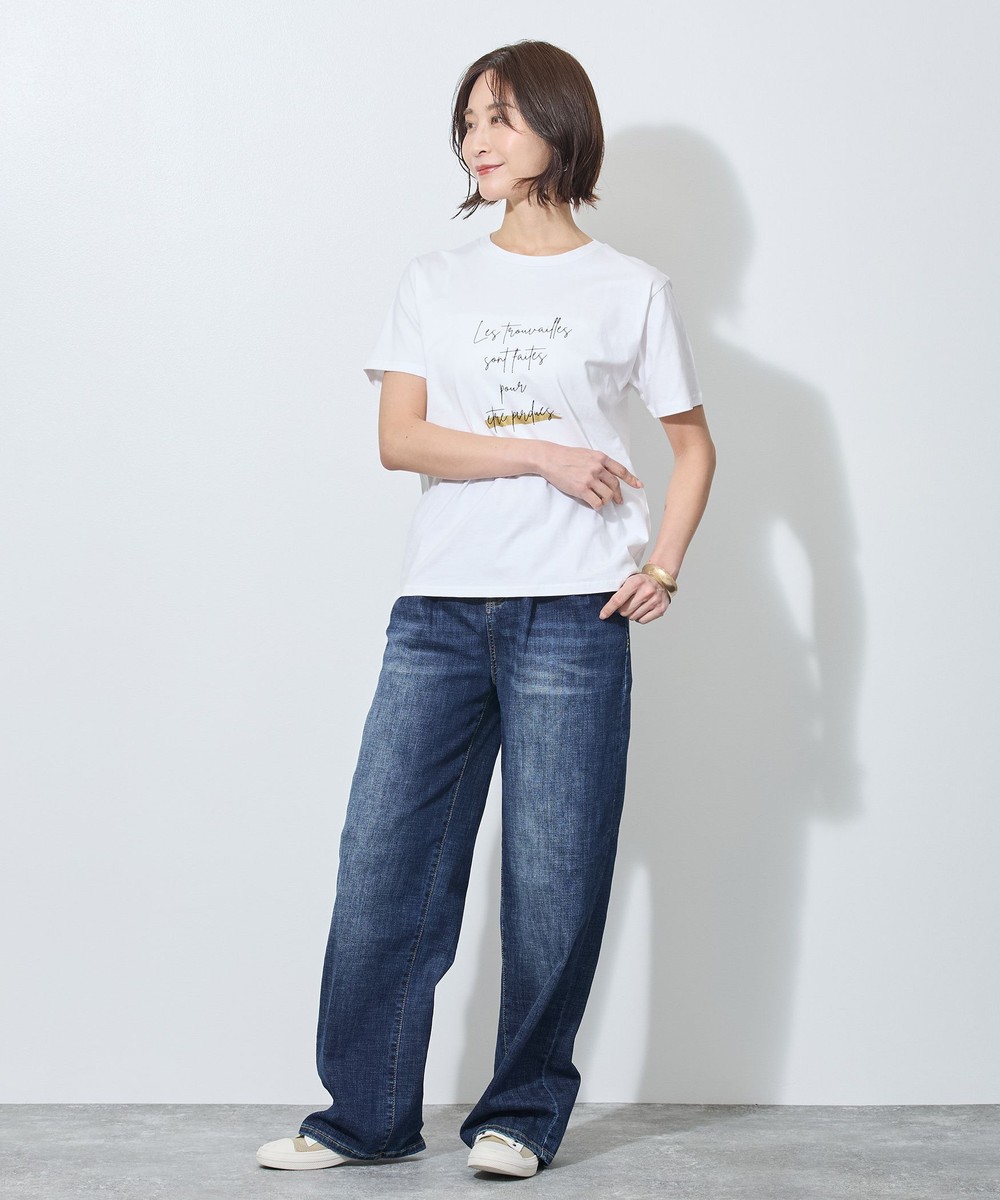 デニムながら、センタープレスが入ることできれい目なスタイリングも可能。