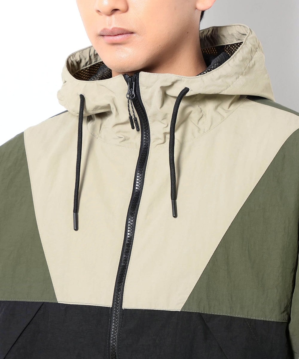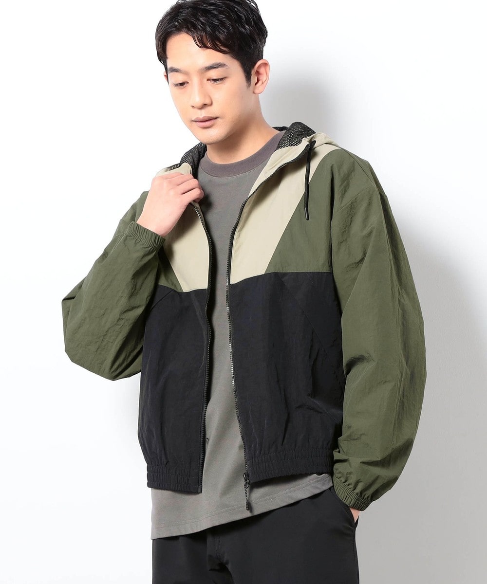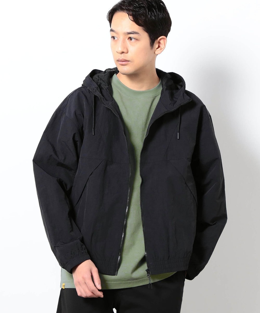 マットで落ち着いた表情のフルダルナイロン素材を使用した、配色切り替えがアクセントのフーディブルゾン。