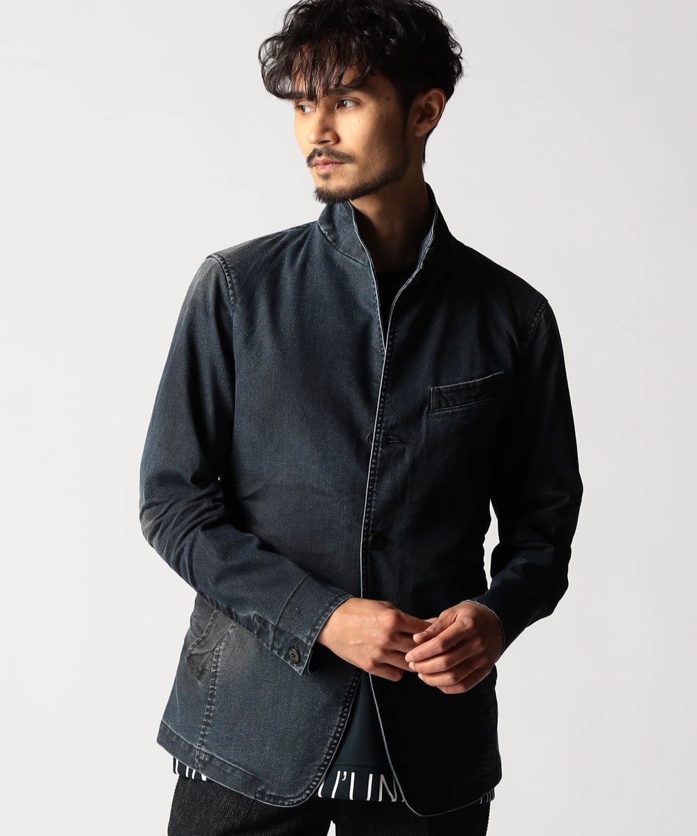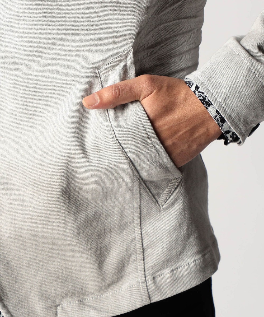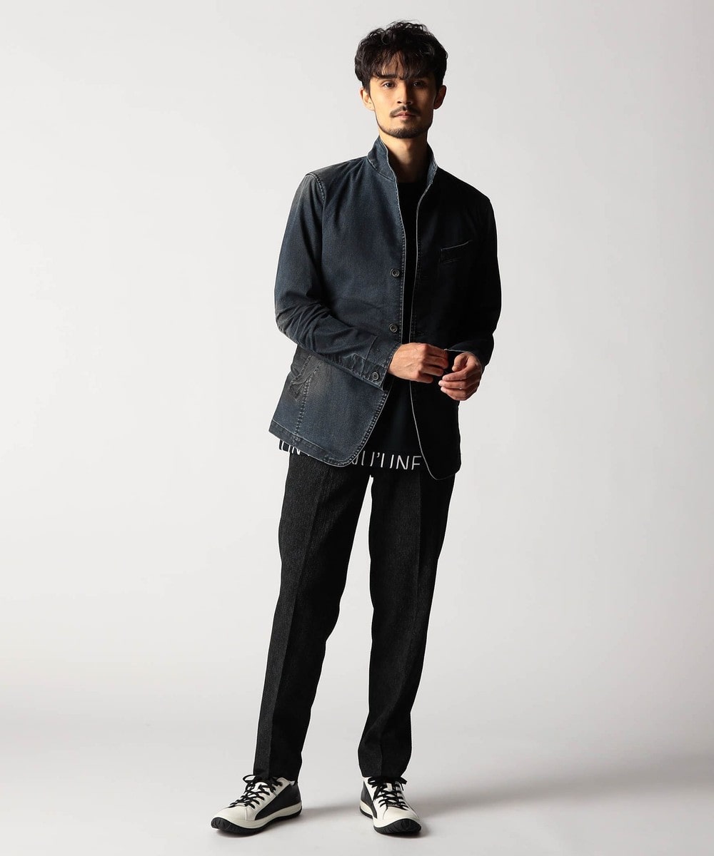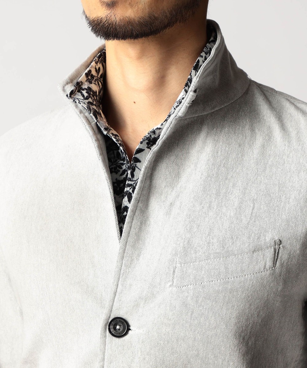 スタンド・イタリアンカラーのカヴァーオールジャケットと、ショートスタンドカラーのGジャンデザインのアラカルト展開。ジャケットは衿は折り返してもラペルとして綺麗に収まる設定、タブで釦止めが出来ます。フロントの一番下の釦は止める設定していませんのでご注意ください。Gジャンは今季新型、細身のシャープなシルエットと衿端にワイヤーを入れたショートスタンドカラーが特徴です。裏側に迷彩柄ジャカード裏地を使用してアクセントにしています。
