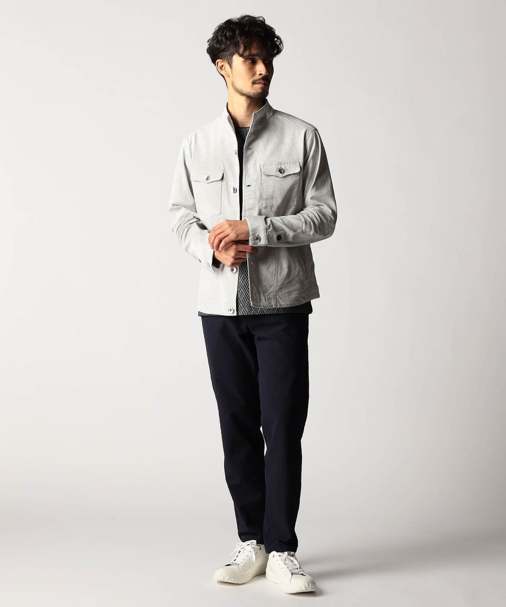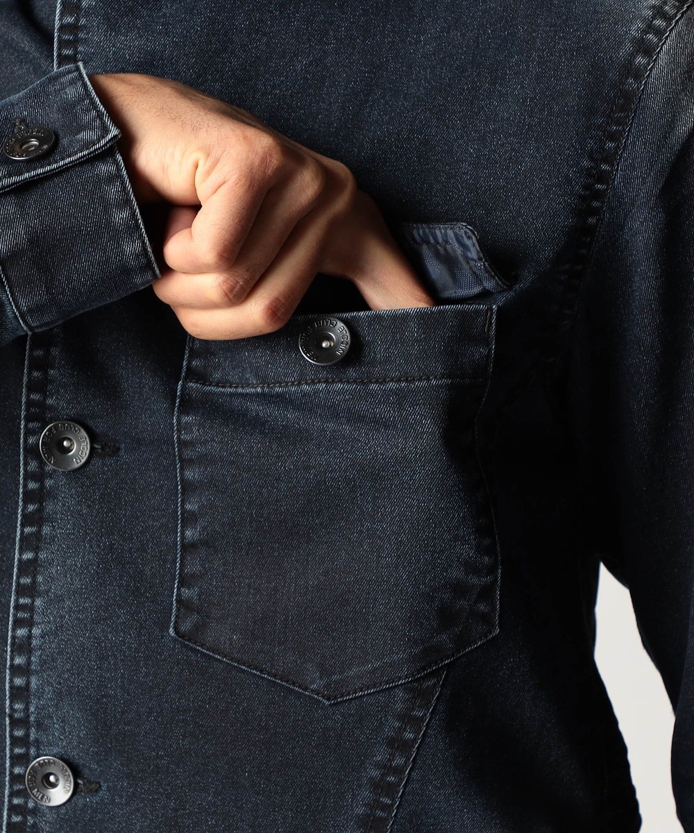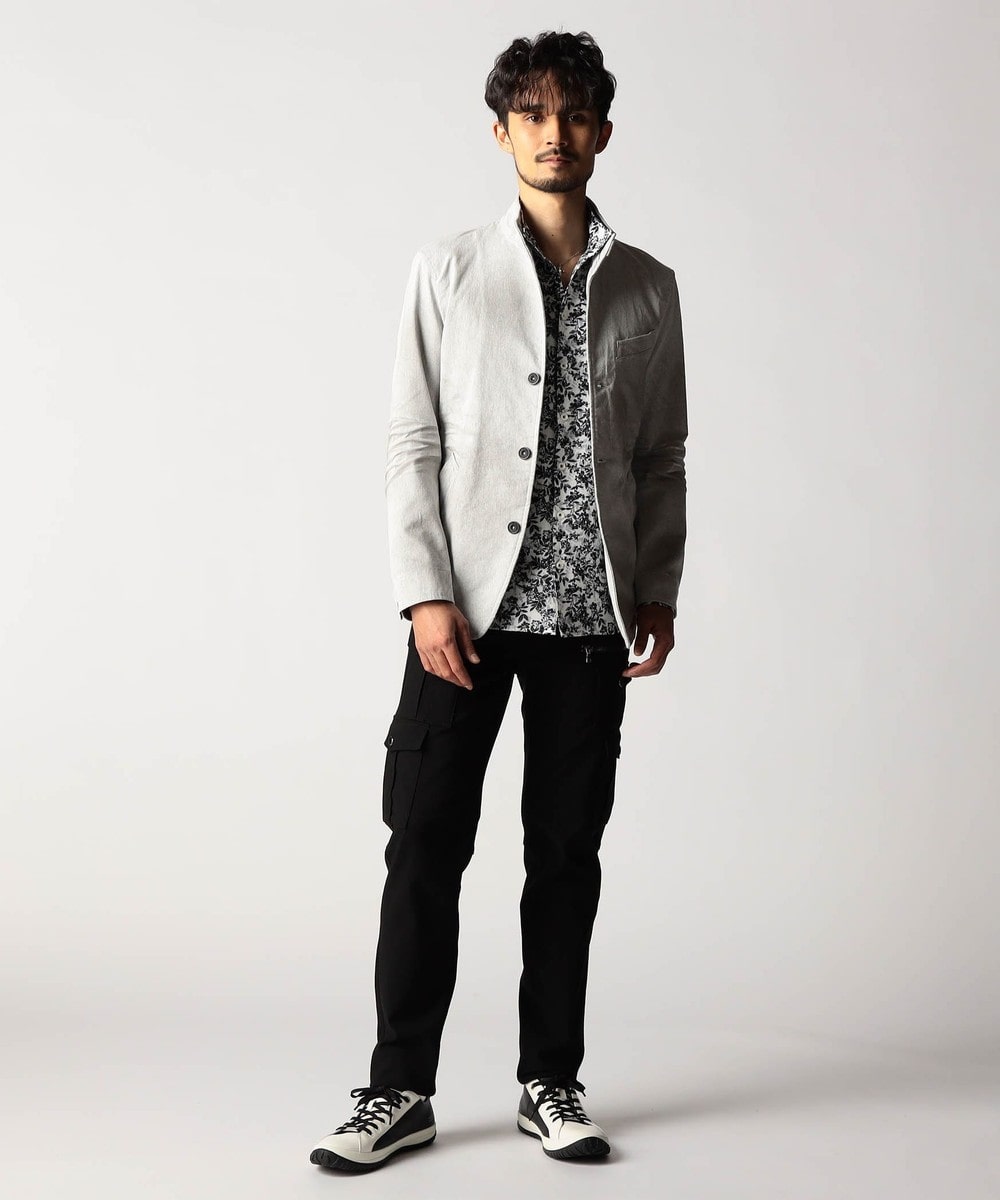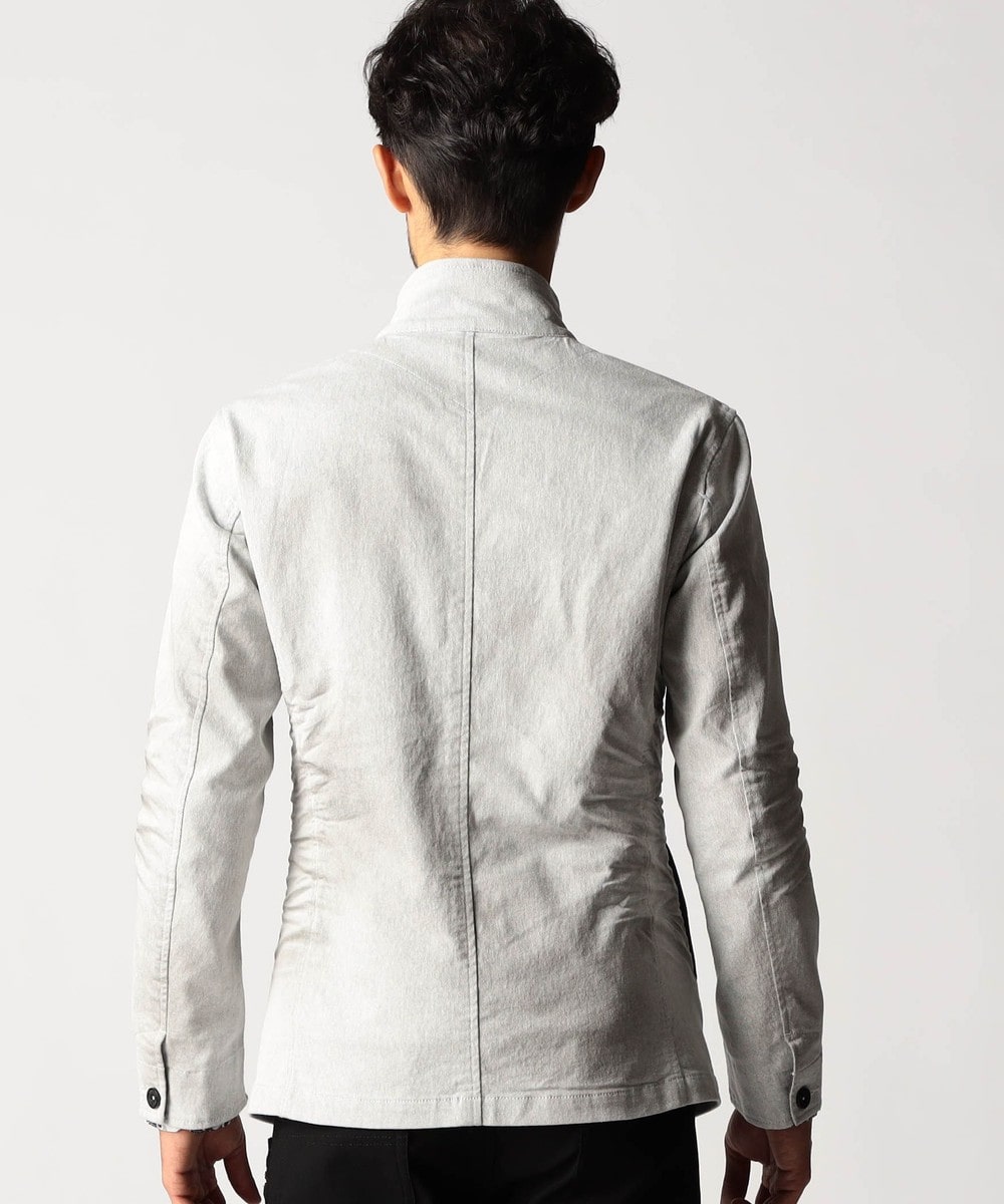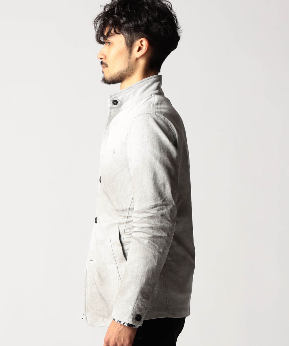 スタンド・イタリアンカラーのカヴァーオールジャケットと、ショートスタンドカラーのGジャンデザインのアラカルト展開。ジャケットは衿は折り返してもラペルとして綺麗に収まる設定、タブで釦止めが出来ます。フロントの一番下の釦は止める設定していませんのでご注意ください。Gジャンは今季新型、細身のシャープなシルエットと衿端にワイヤーを入れたショートスタンドカラーが特徴です。裏側に迷彩柄ジャカード裏地を使用してアクセントにしています。