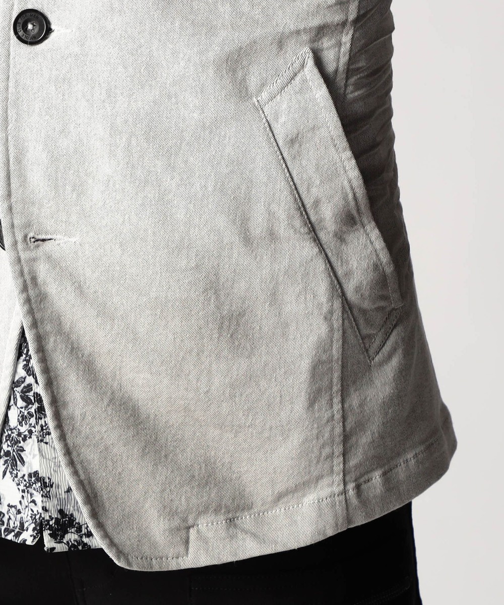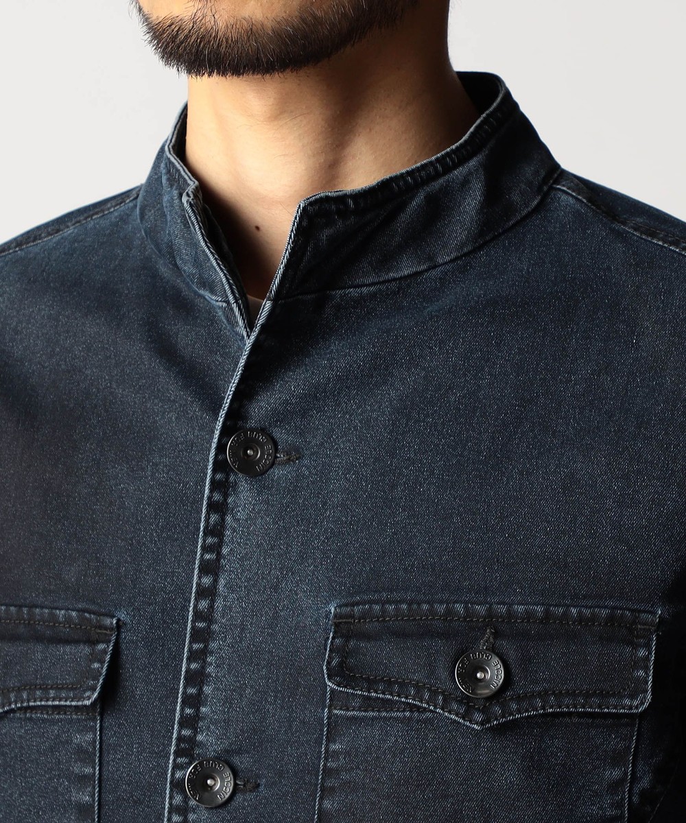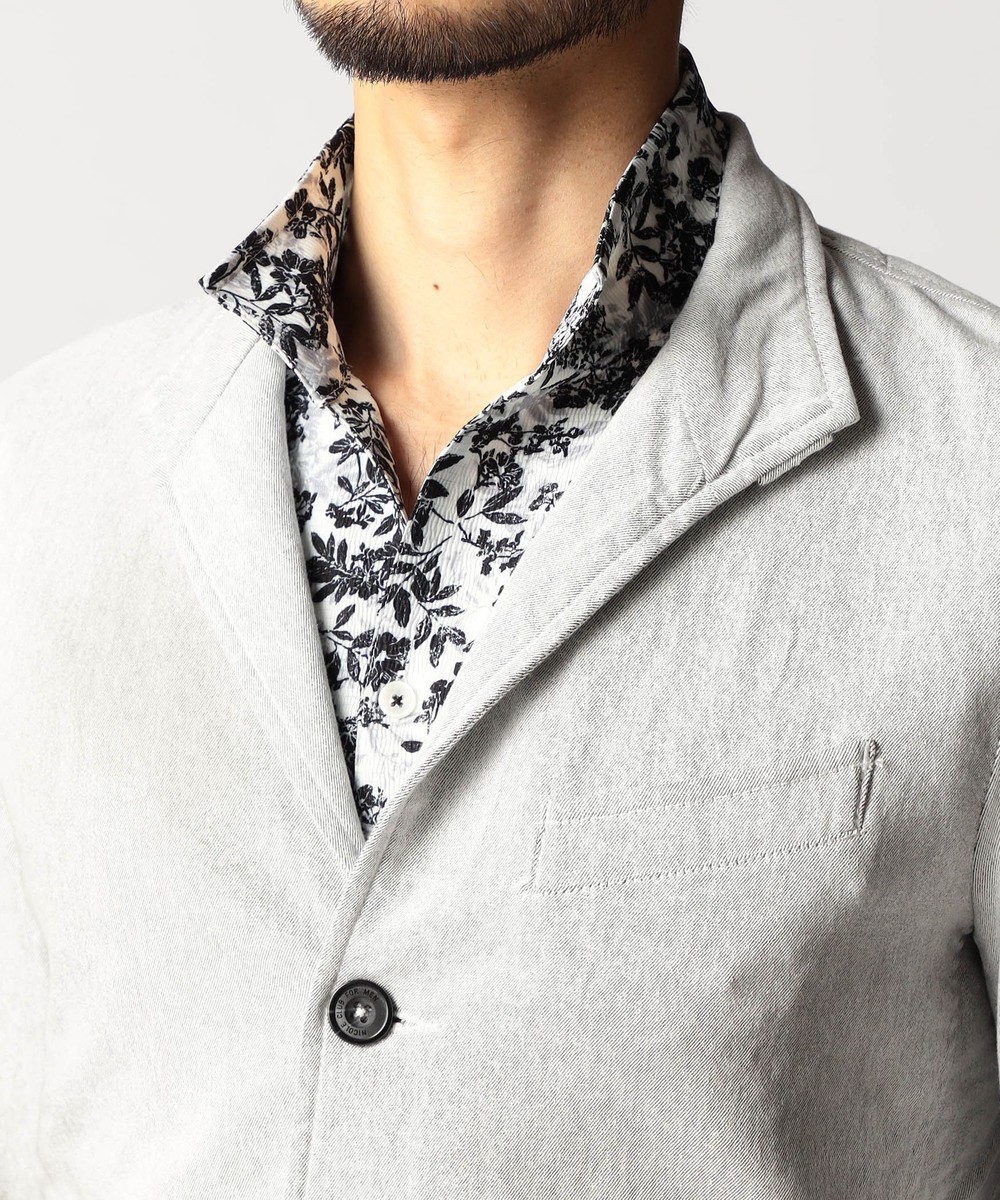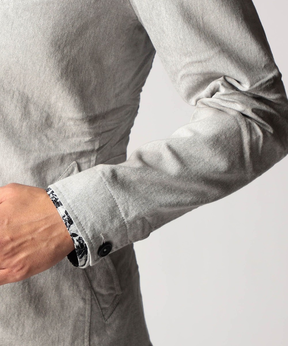 スタンド・イタリアンカラーのカヴァーオールジャケットと、ショートスタンドカラーのGジャンデザインのアラカルト展開。ジャケットは衿は折り返してもラペルとして綺麗に収まる設定、タブで釦止めが出来ます。フロントの一番下の釦は止める設定していませんのでご注意ください。Gジャンは今季新型、細身のシャープなシルエットと衿端にワイヤーを入れたショートスタンドカラーが特徴です。裏側に迷彩柄ジャカード裏地を使用してアクセントにしています。