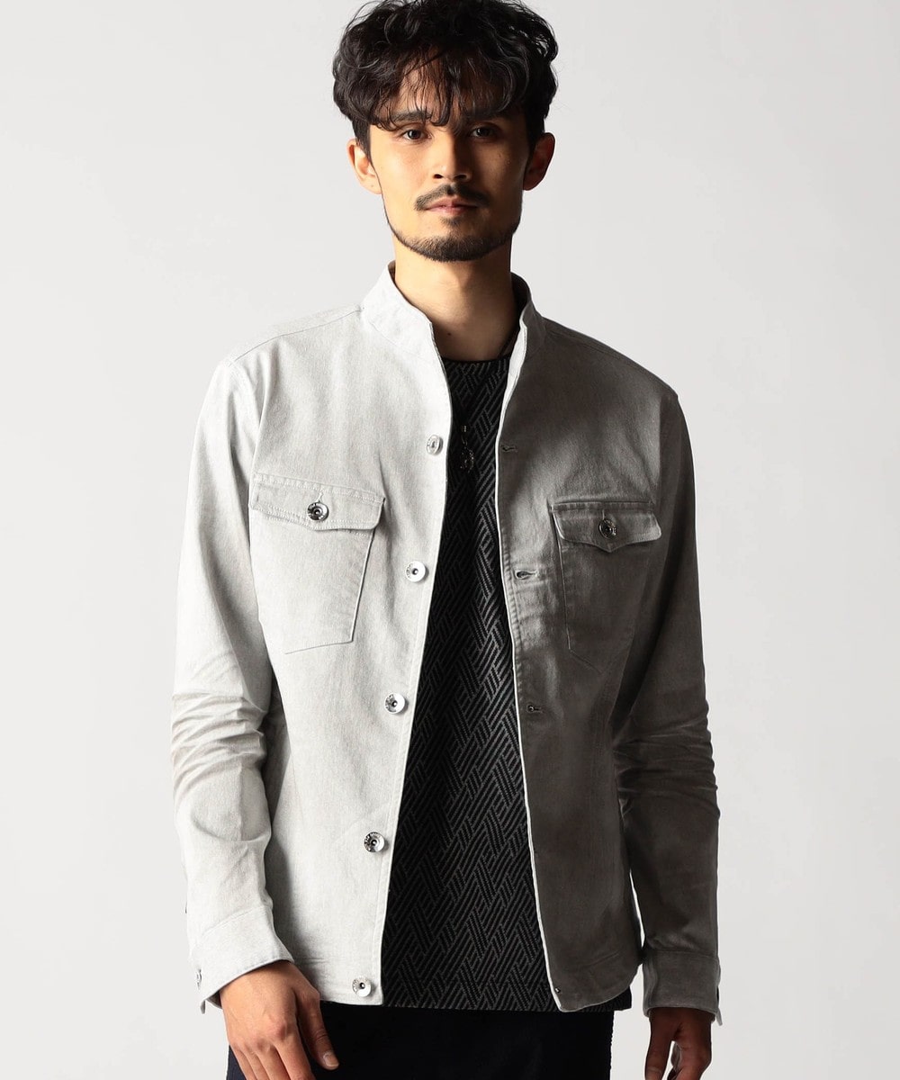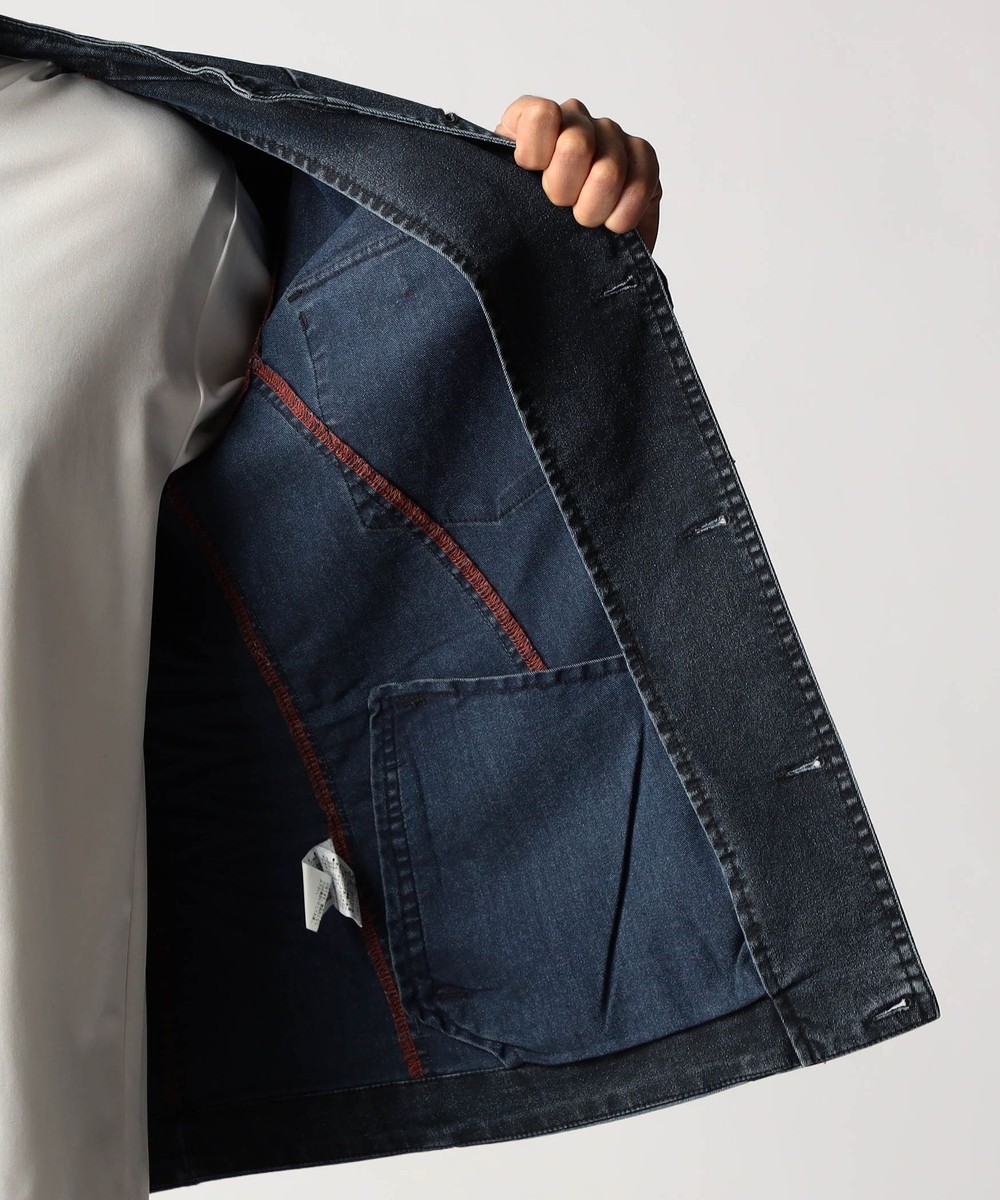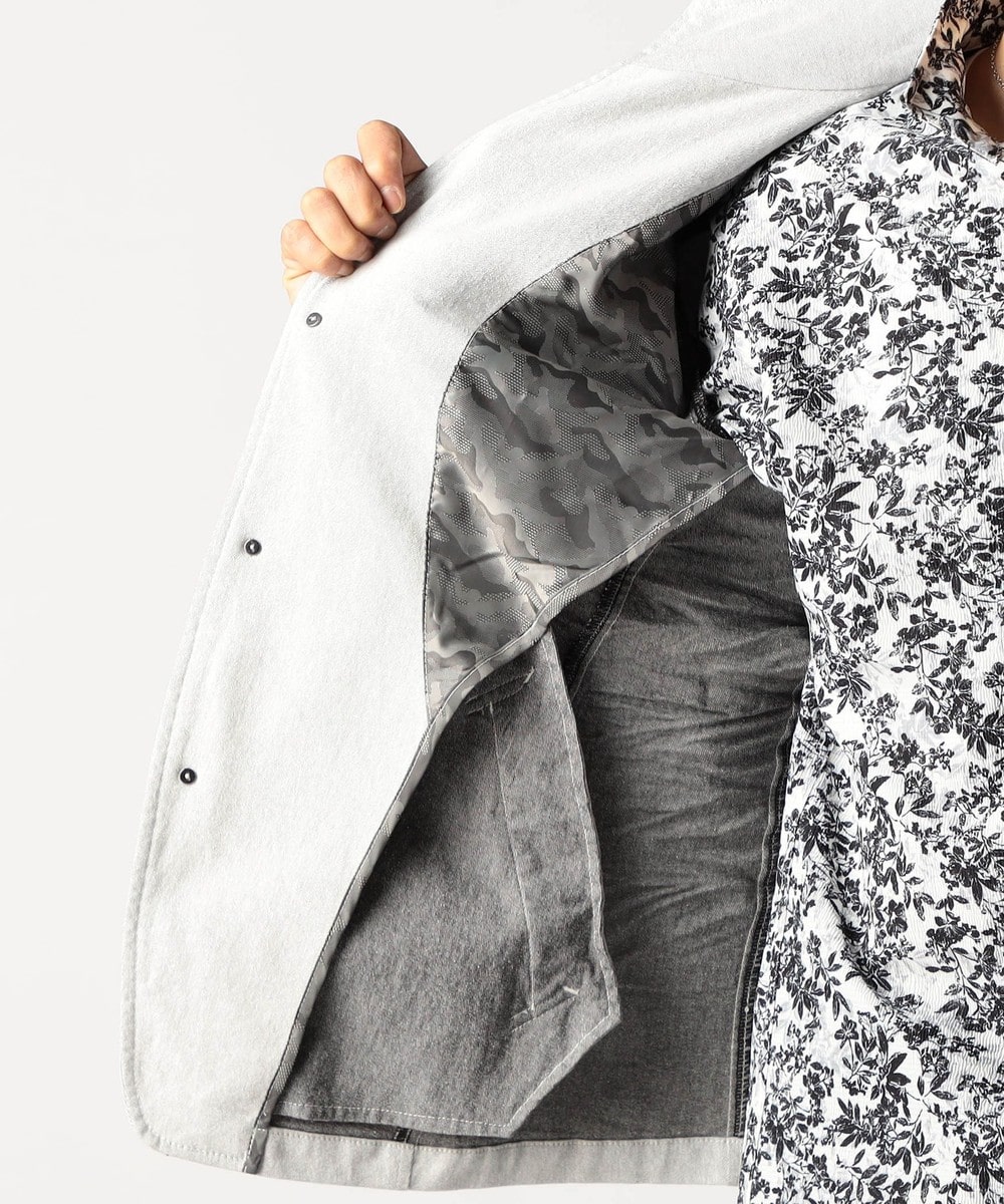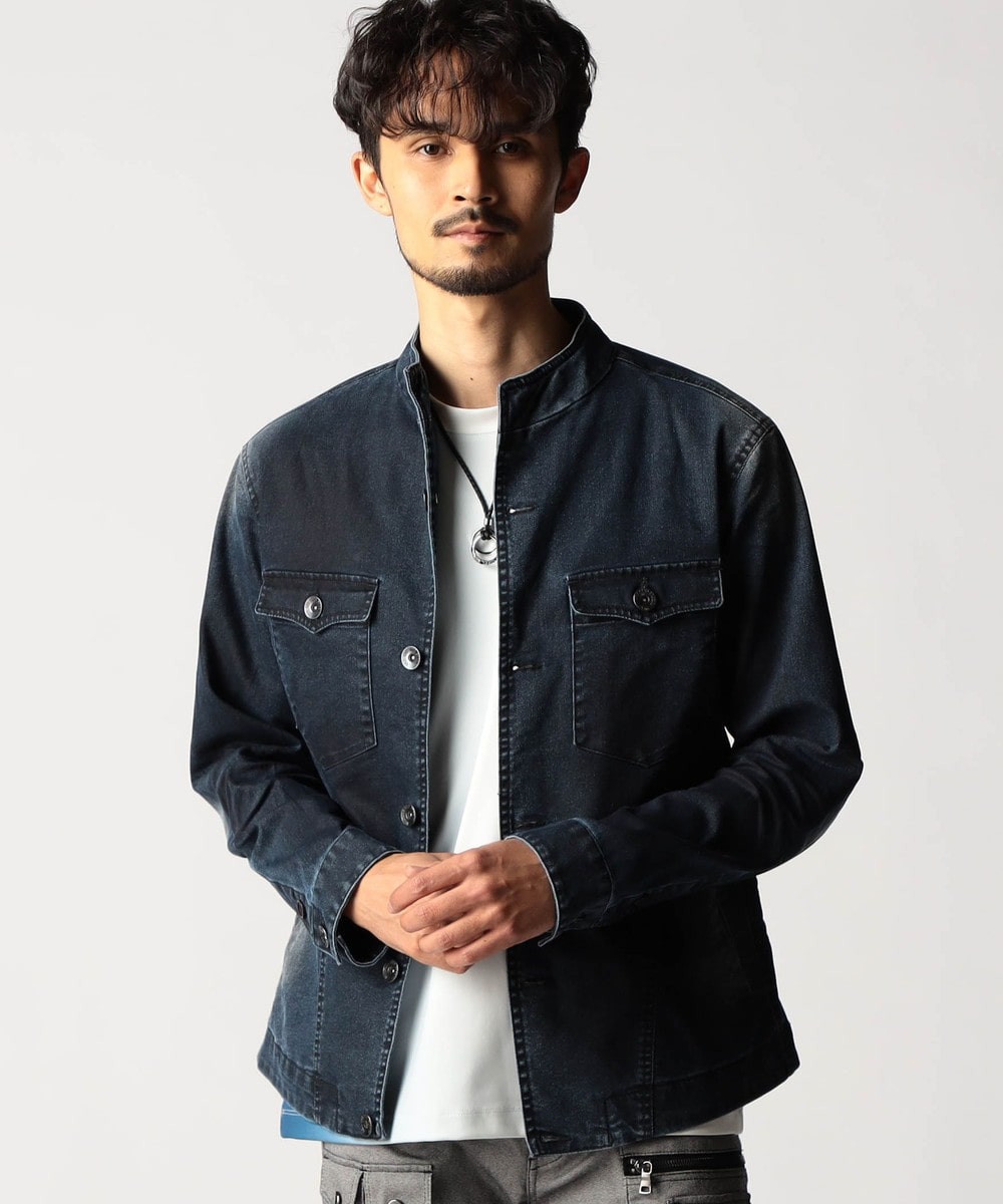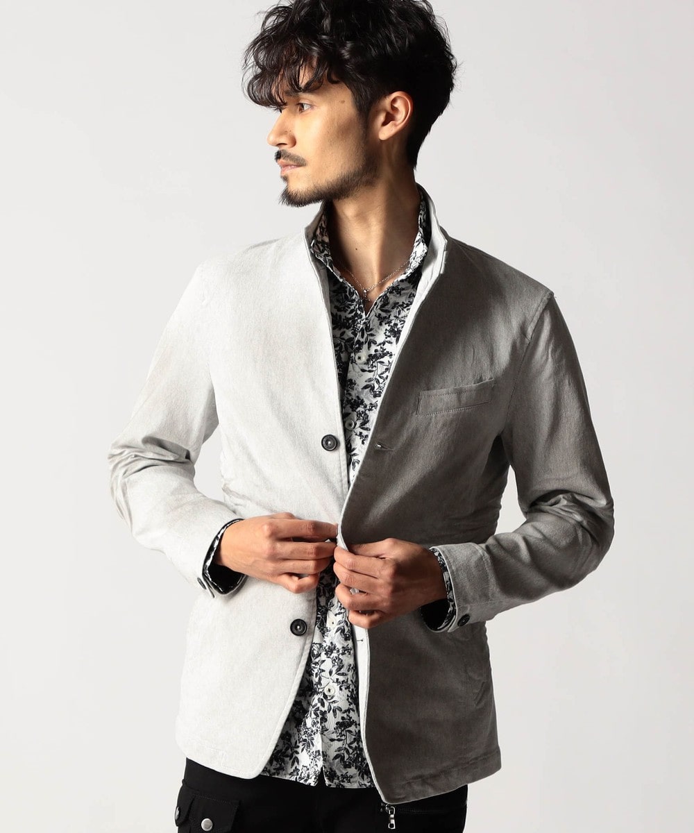 スタンド・イタリアンカラーのカヴァーオールジャケットと、ショートスタンドカラーのGジャンデザインのアラカルト展開。ジャケットは衿は折り返してもラペルとして綺麗に収まる設定、タブで釦止めが出来ます。フロントの一番下の釦は止める設定していませんのでご注意ください。Gジャンは今季新型、細身のシャープなシルエットと衿端にワイヤーを入れたショートスタンドカラーが特徴です。裏側に迷彩柄ジャカード裏地を使用してアクセントにしています。