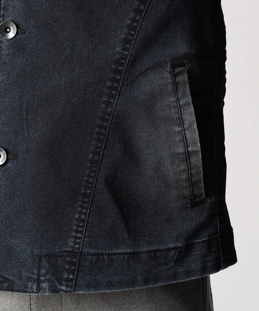 最終の製品加工を岡山のデニム専門の加工所(Wellsウェルズ)に依頼。中国で先にベースのユーズド加工を施し、全体のサイズを縮率調整してから国内にて最終加工を施しています。手作業でリアルな3Dシワ加工を施して形状を固定、更に陰影感が出る様に顔料を薄っすら部分的に吹き付けています。身頃にも軽く顔料を吹き付けてムラ感を出しています。