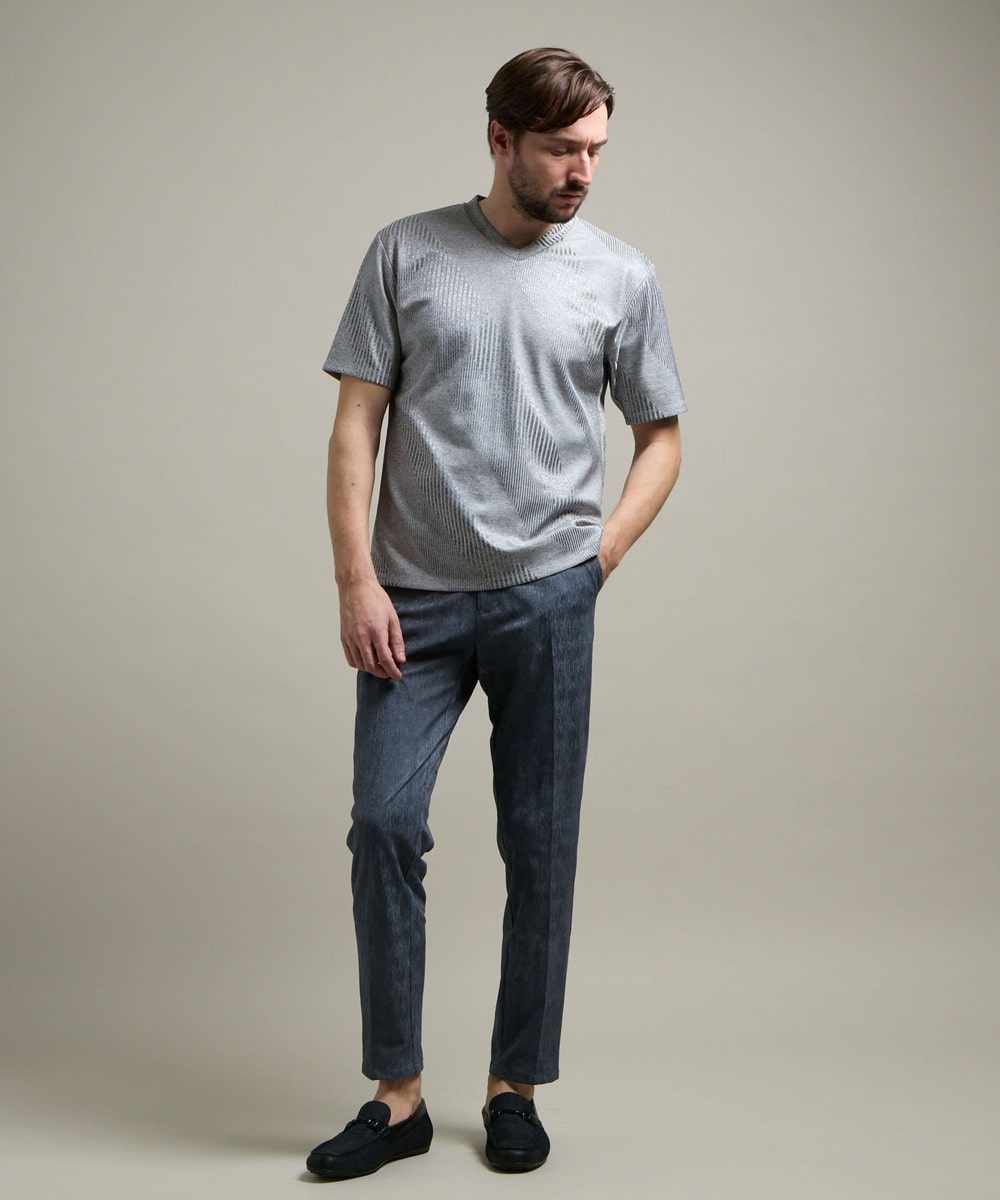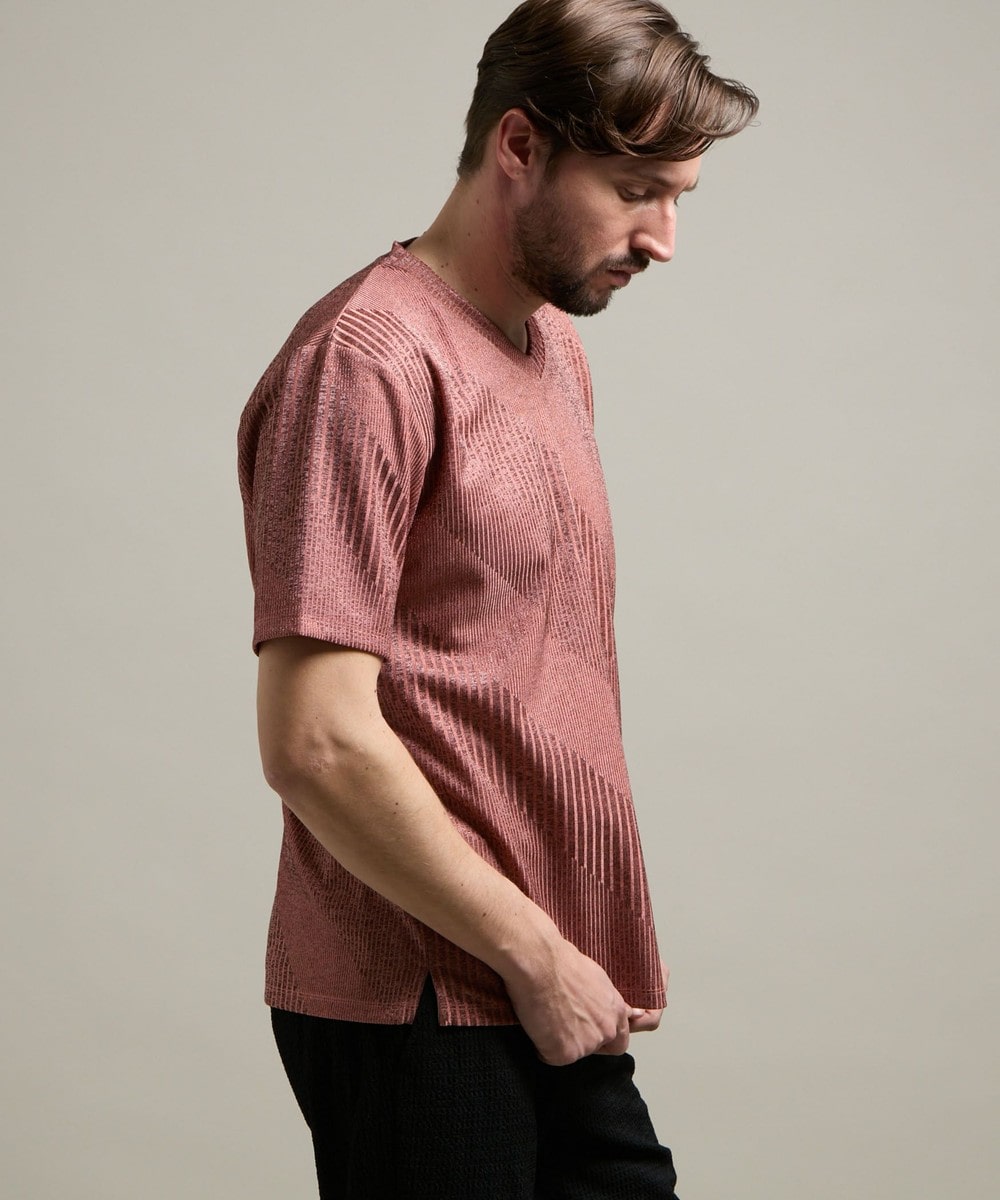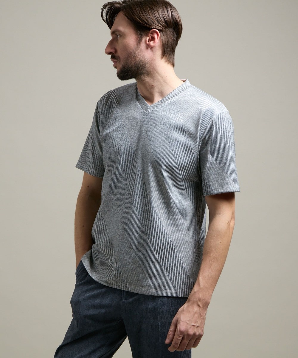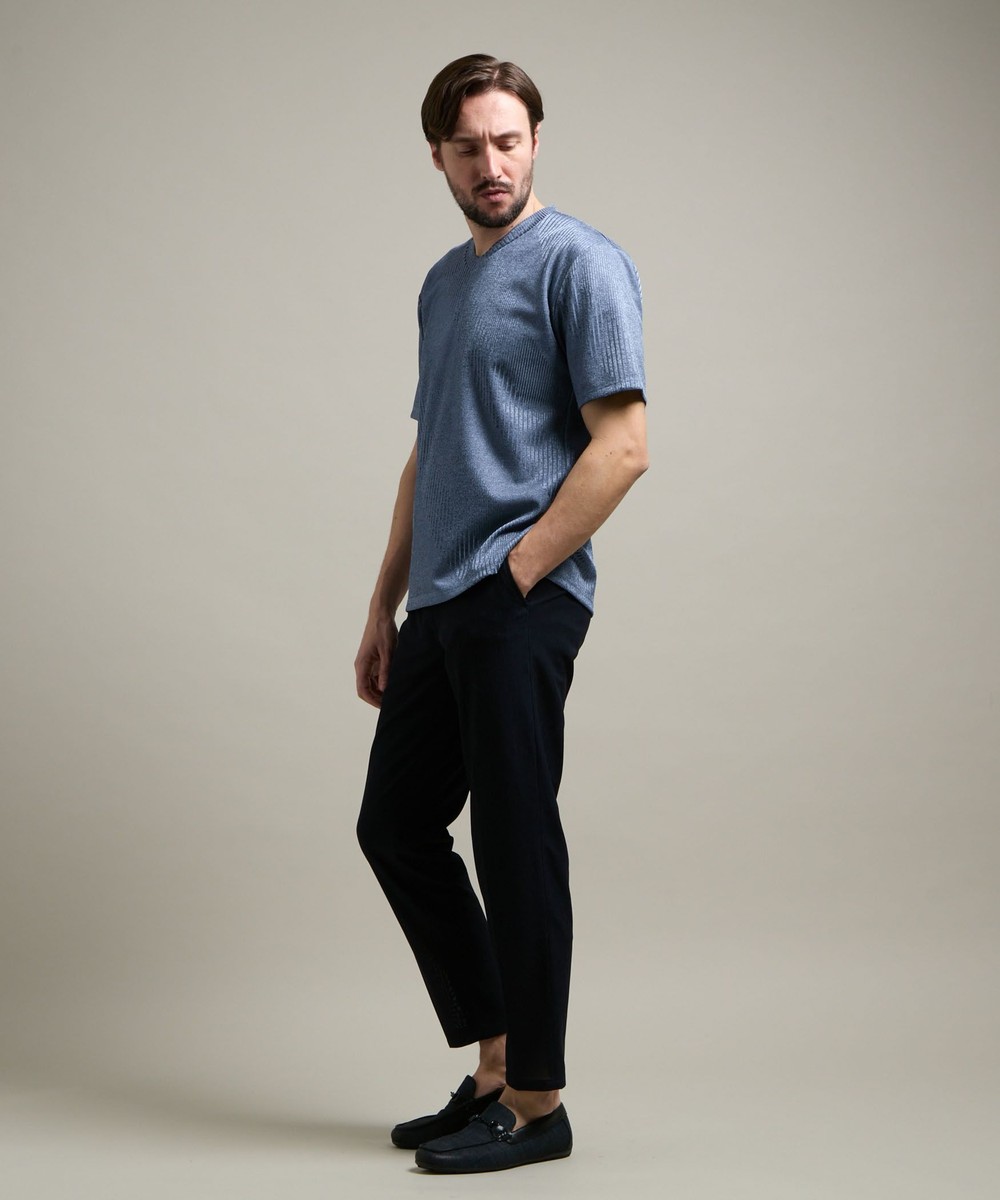 様々なスタイルに合せやすい浅めのVネックとサイドスリットがポイントのシンプルな半袖カットソーです。