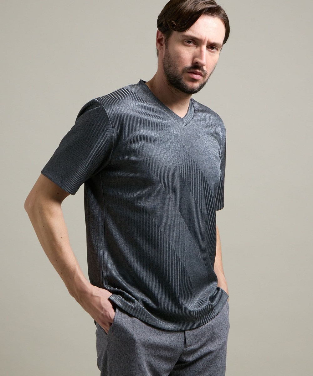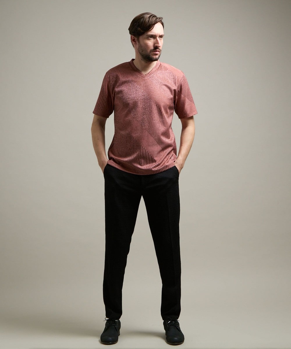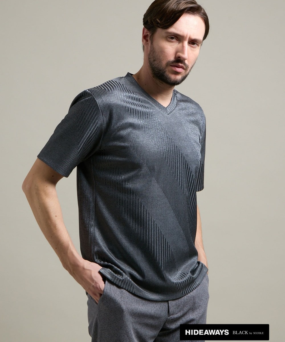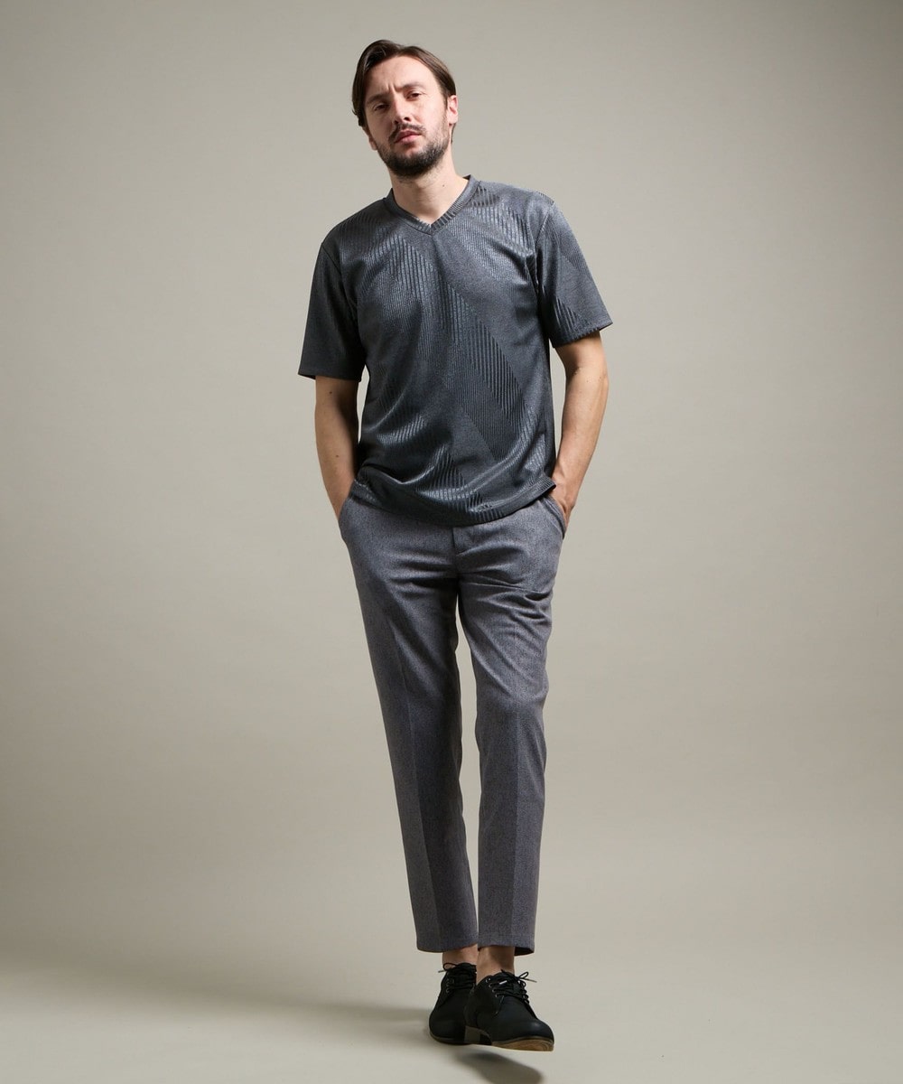 様々なスタイルに合せやすい浅めのVネックとサイドスリットがポイントのシンプルな半袖カットソーです。