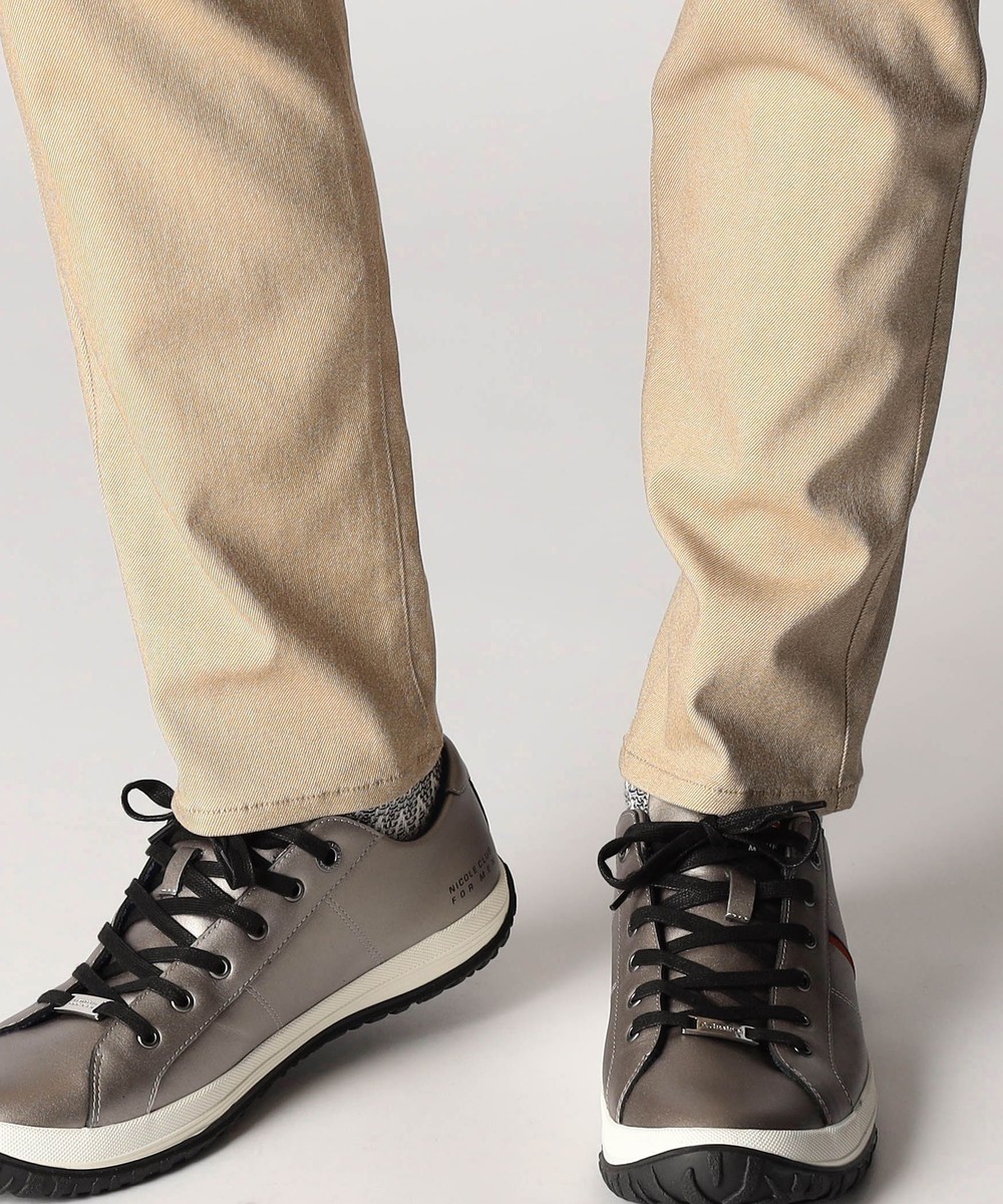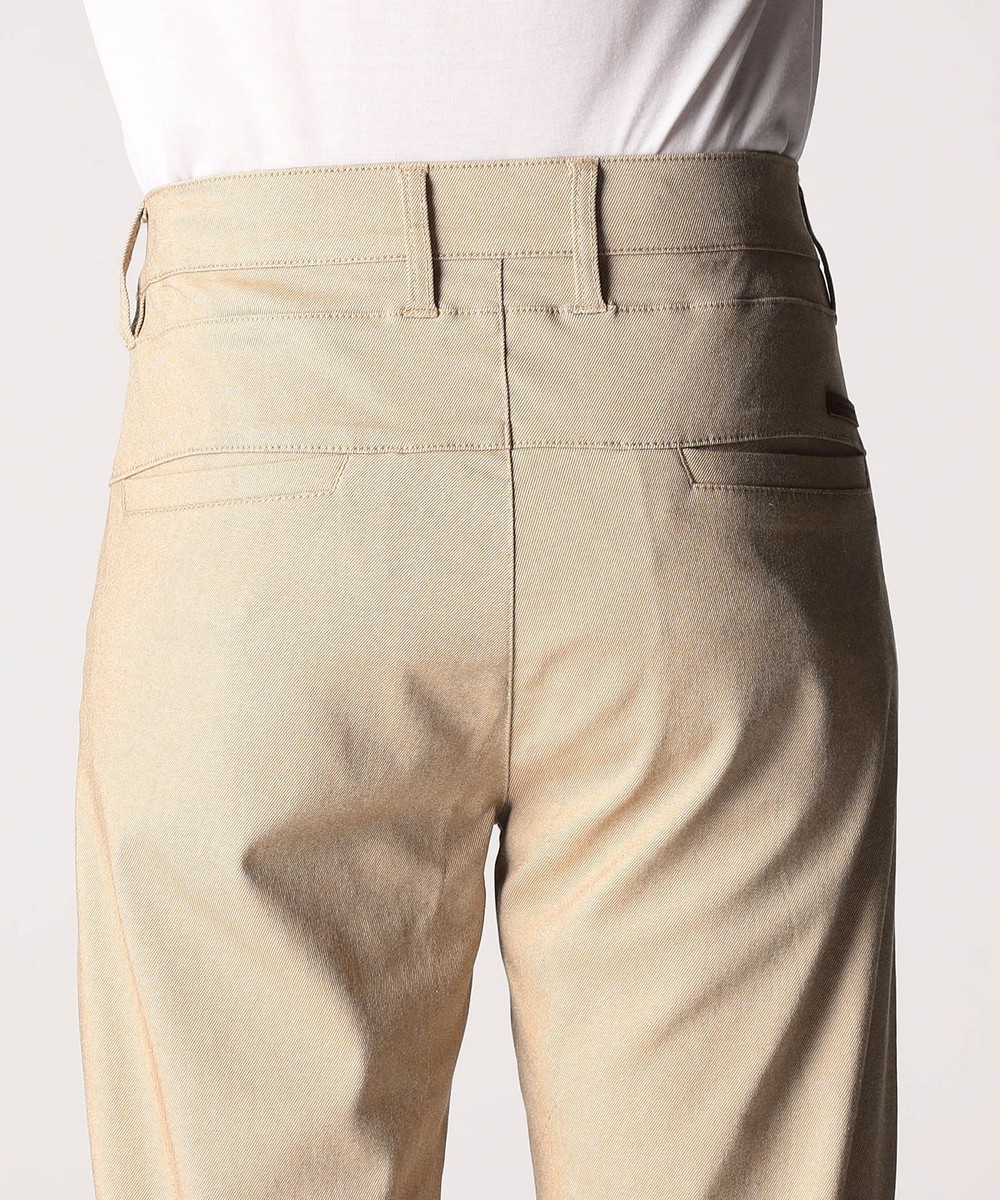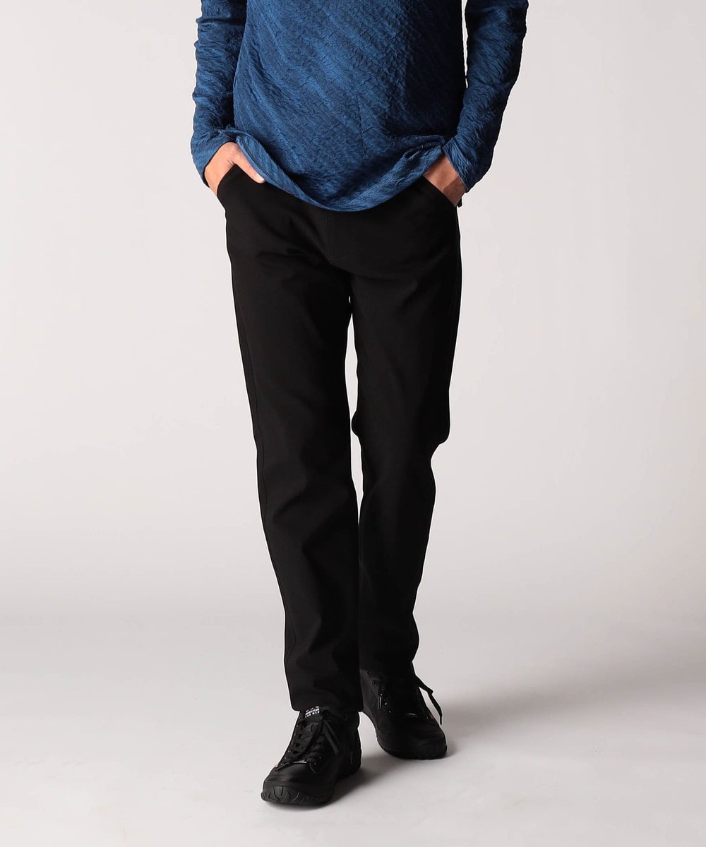 吸湿性の高い再生繊維のレーヨン糸とプリッとしたコシを出すナイロン糸を使用したハイパワーストレッチ素材です。ポリウレタン混の良く伸びてキックバックが利いたストレッチ感、シャリみのあるタッチ感は肌触りも抜群です。汚れが付きづらい撥水加工をプラスしています。