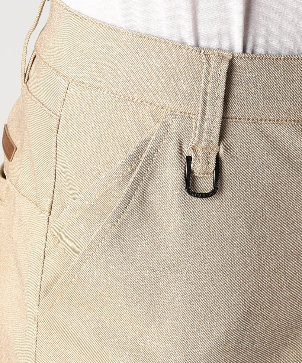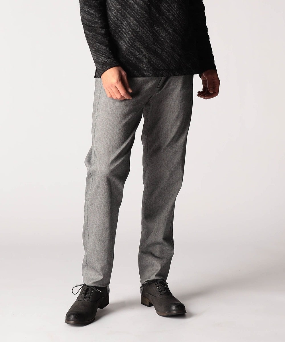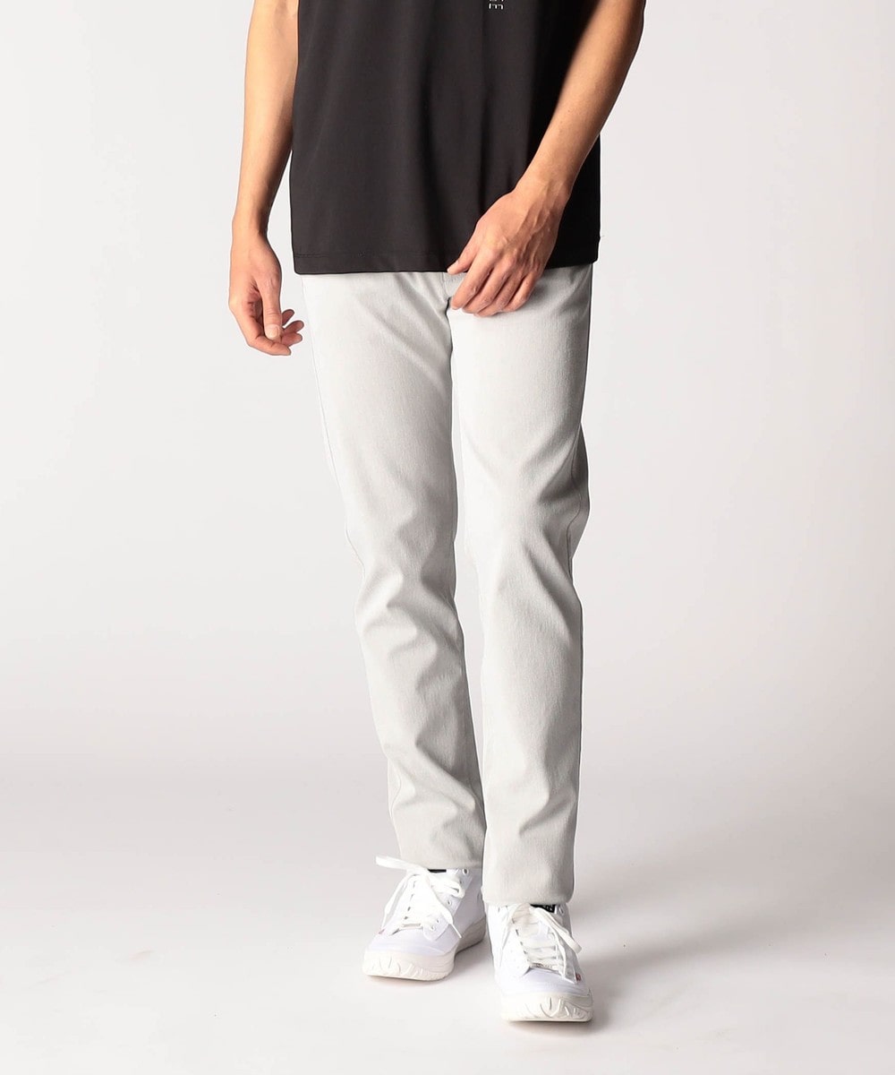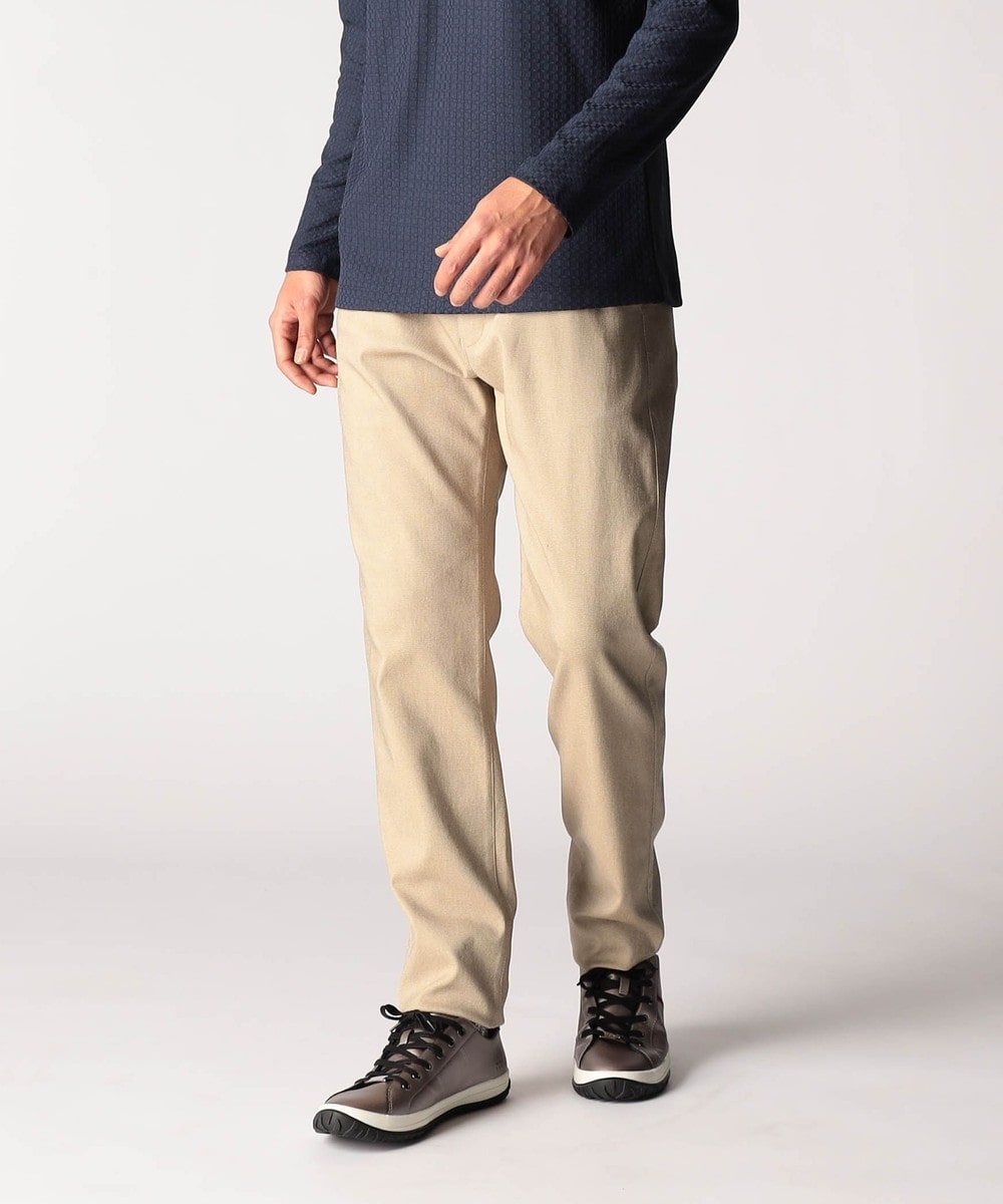 吸湿性の高い再生繊維のレーヨン糸とプリッとしたコシを出すナイロン糸を使用したハイパワーストレッチ素材です。ポリウレタン混の良く伸びてキックバックが利いたストレッチ感、シャリみのあるタッチ感は肌触りも抜群です。汚れが付きづらい撥水加工をプラスしています。