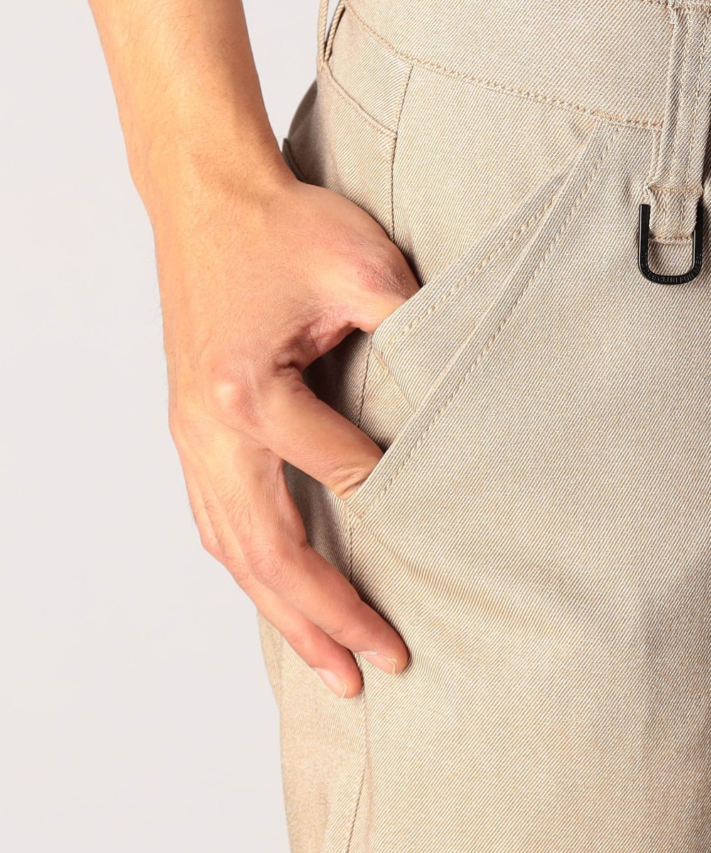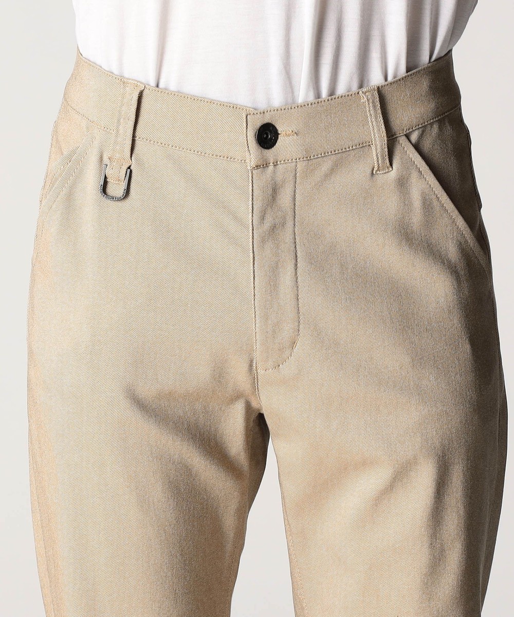 シンプルなデザインの5ポケットパンツ。スラックスを意識した直線的なデザインがポイントの綺麗めパンツです。素材にあわせてウエストベルトも少し伸びる様に縫製しています。ストレッチ裏地を別布に使用していますので穿き着心地も抜群です。オリジナルのタックボタンやDカン、腰裏の刺繍や革ネームをアクセントにしています。尻から内股にかけて伸びすぎ防止の補強布を当てて強度を高めています。