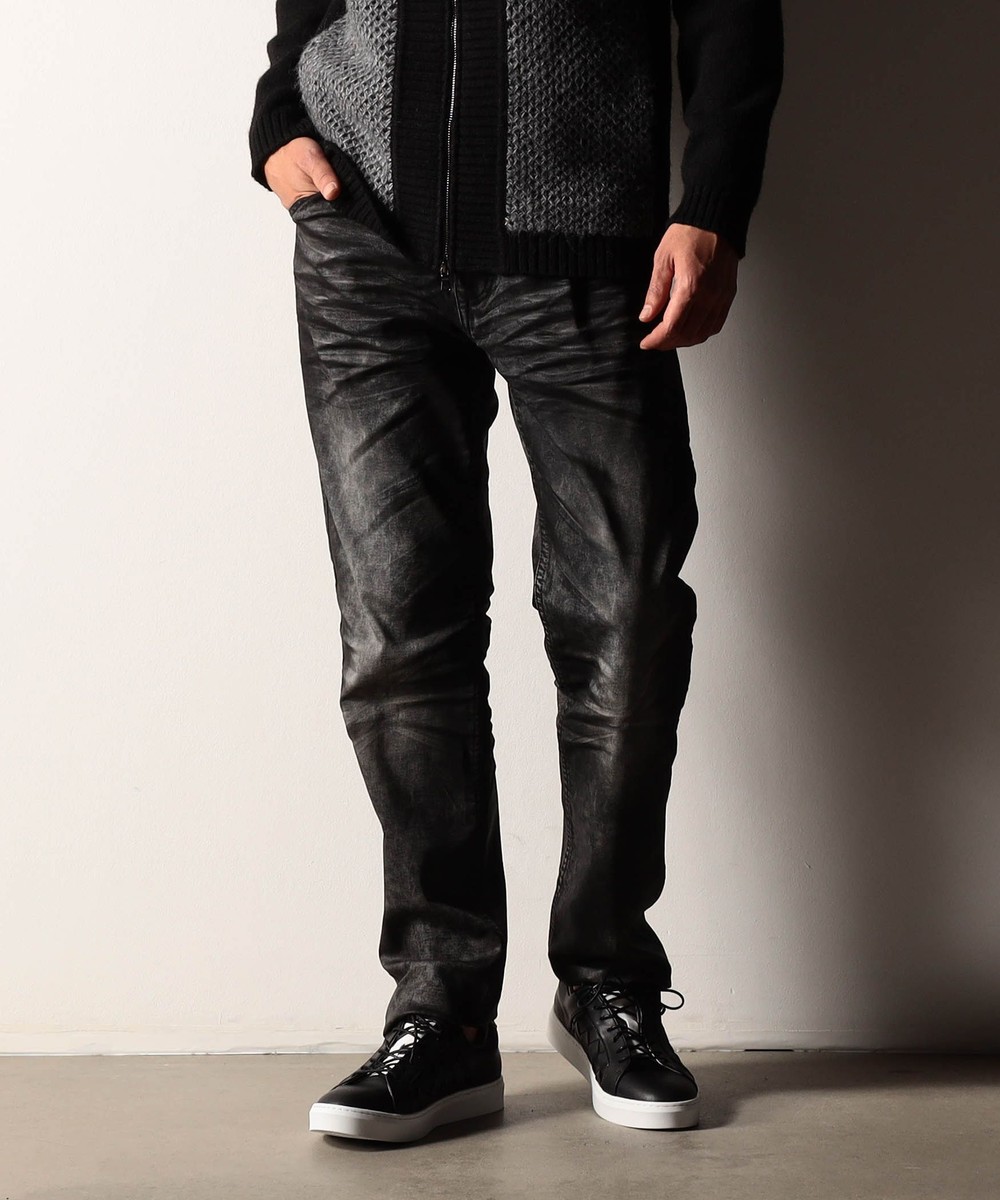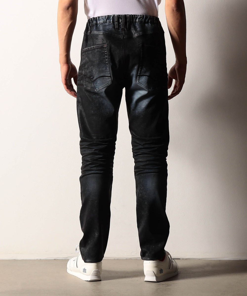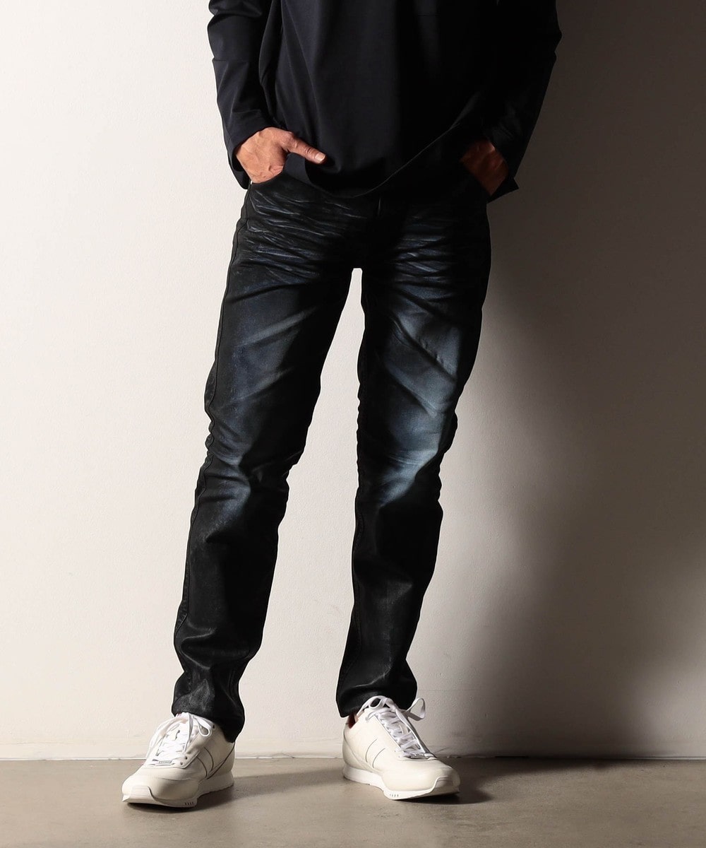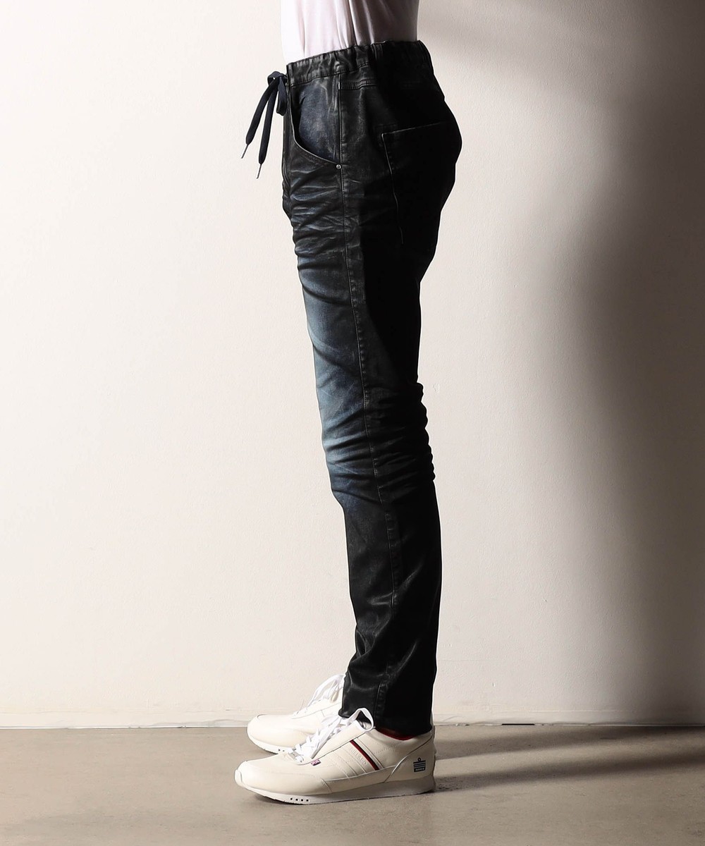 顔料を混ぜた樹脂コーティング剤を部分的吹き付け、所々アイロンでしっかり抑える事で縫い代の厚みがある部分や平たい部分に光沢を出して革パンの様な深い色味に仕上げます。