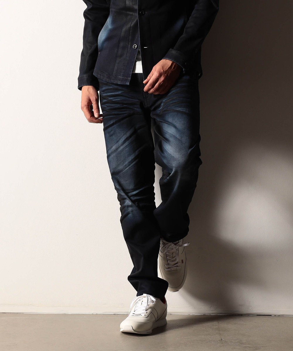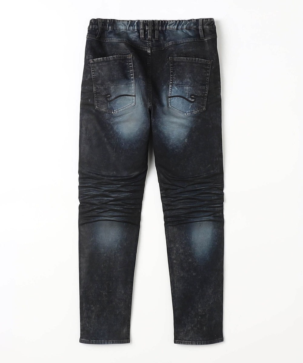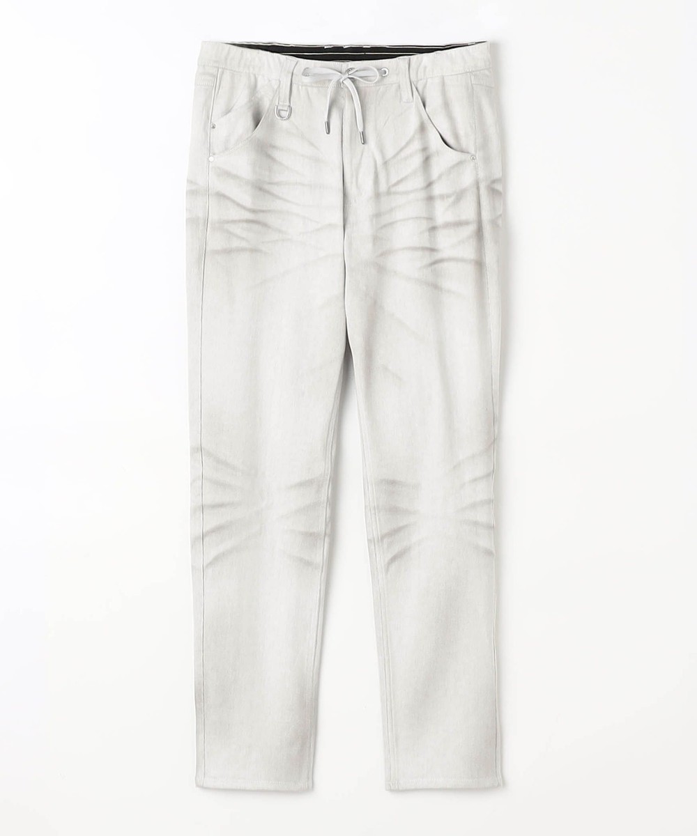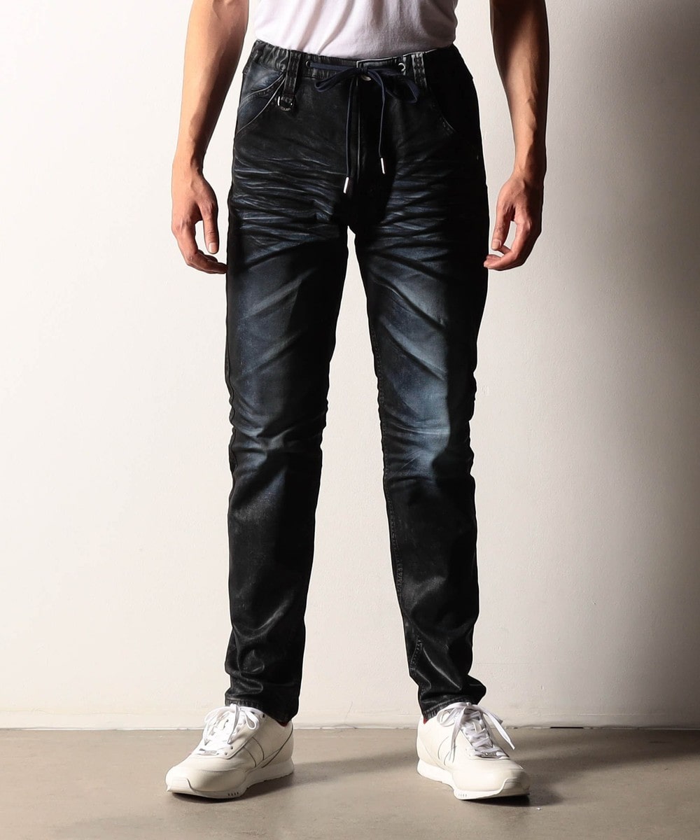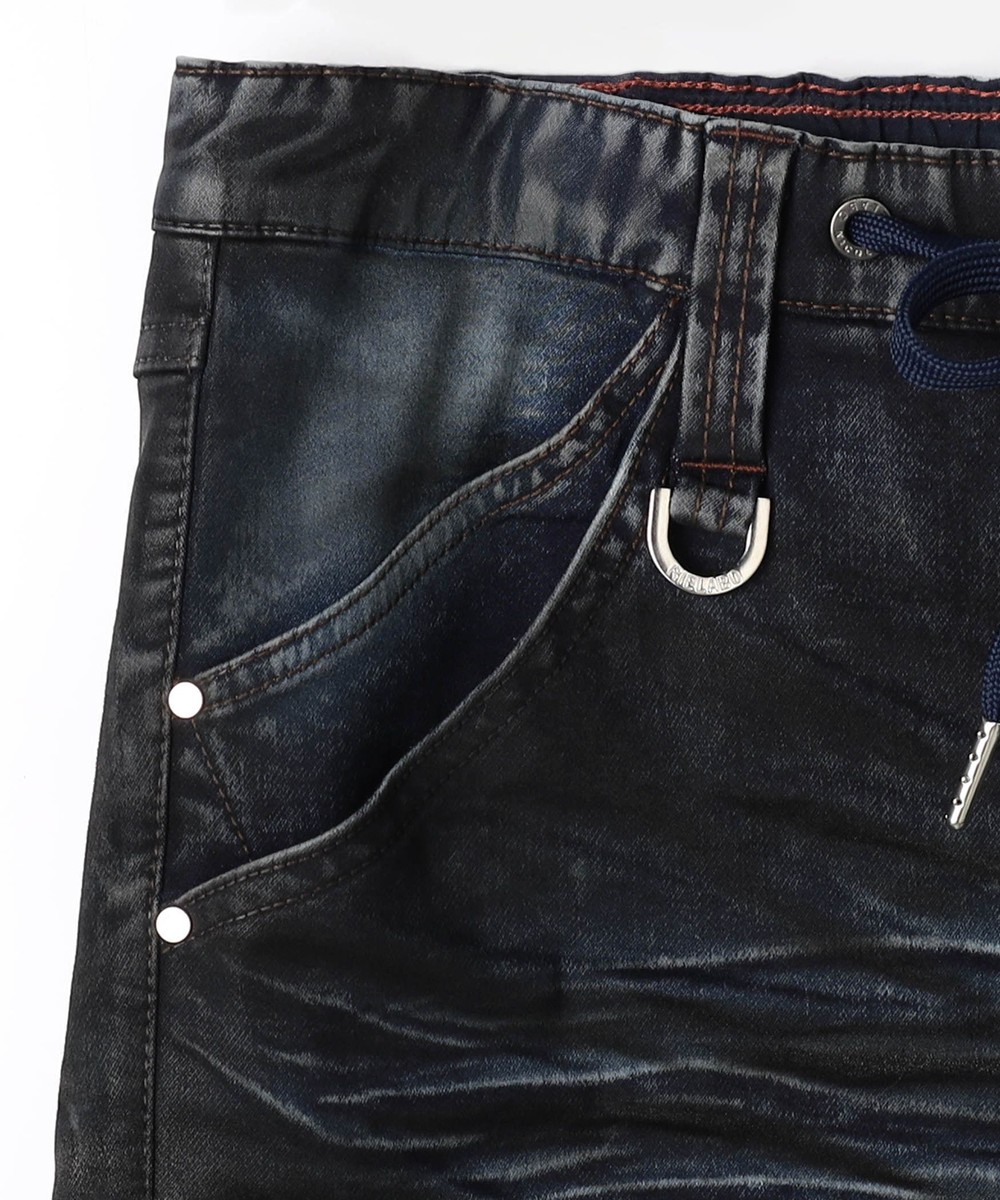 顔料を混ぜた樹脂コーティング剤を部分的吹き付け、所々アイロンでしっかり抑える事で縫い代の厚みがある部分や平たい部分に光沢を出して革パンの様な深い色味に仕上げます。