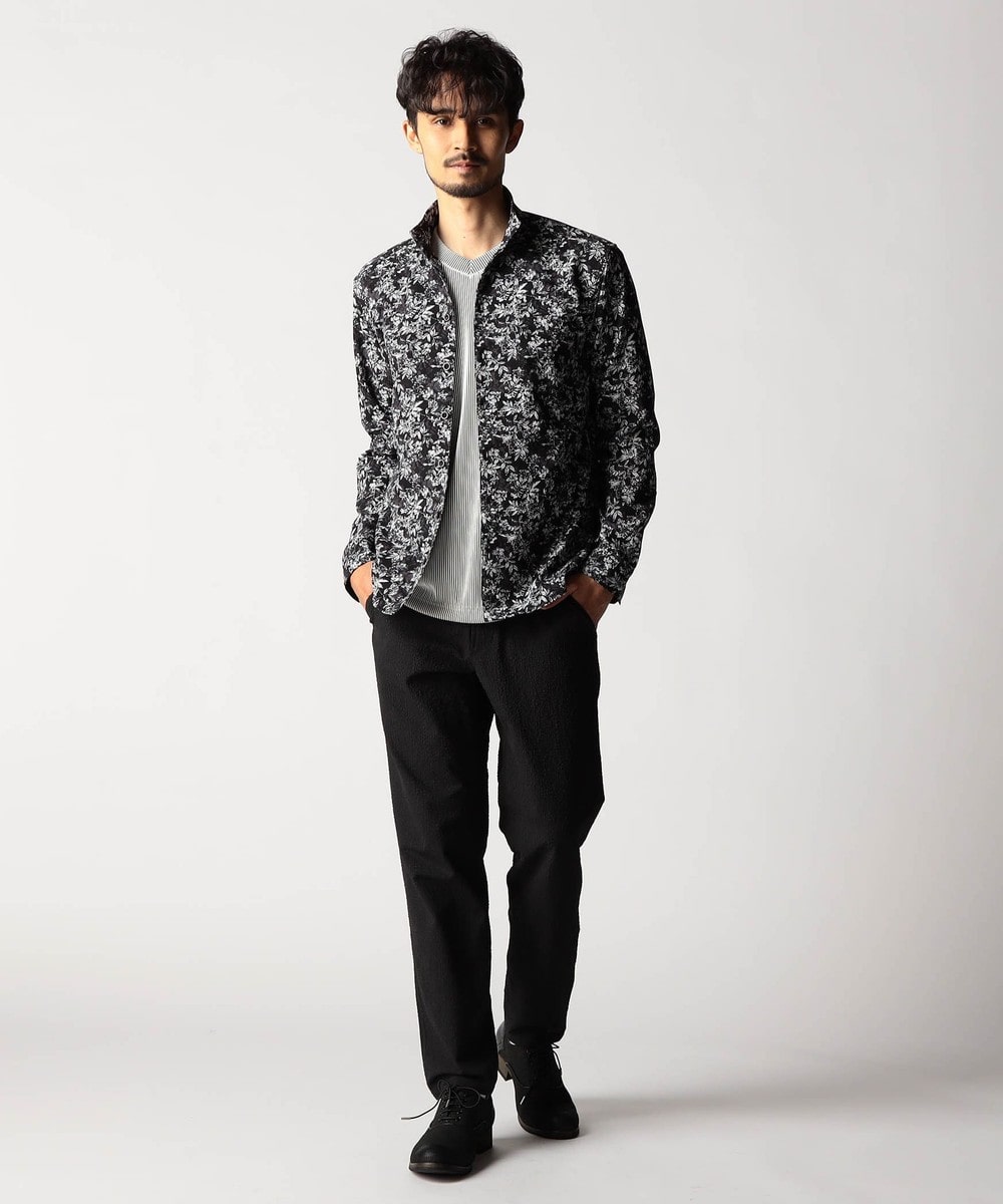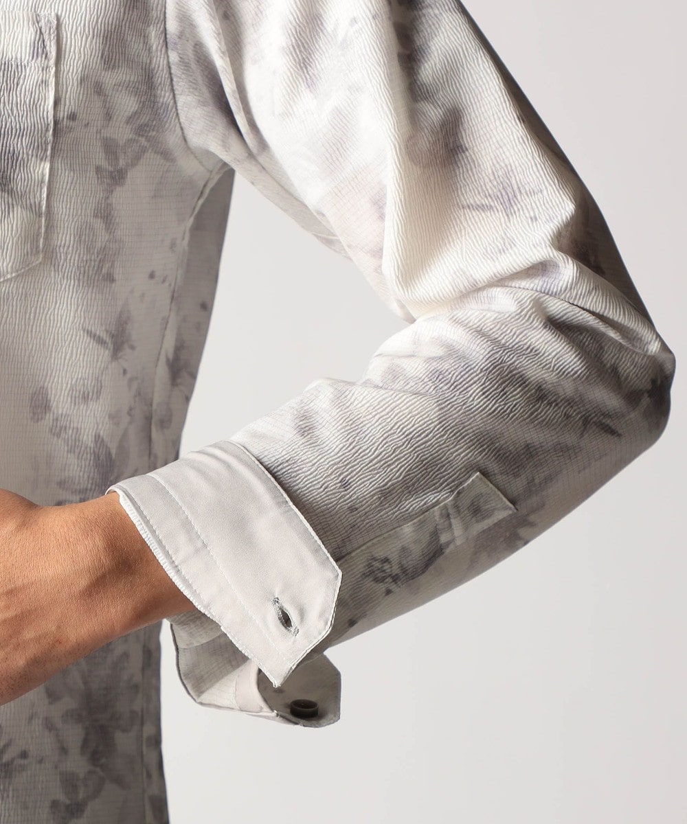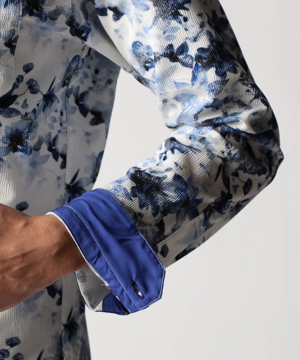 衿端にワイヤ-を仕込んだスタンド・イタリアンカラ-シャツ。ヨーク裏やカフス裏など無地配色のストレッチ裏地を使い、アクセントになる様にしています。生地のプリント配色とリンクした釦や付け糸も、ちょっとしたアクセントになっています。