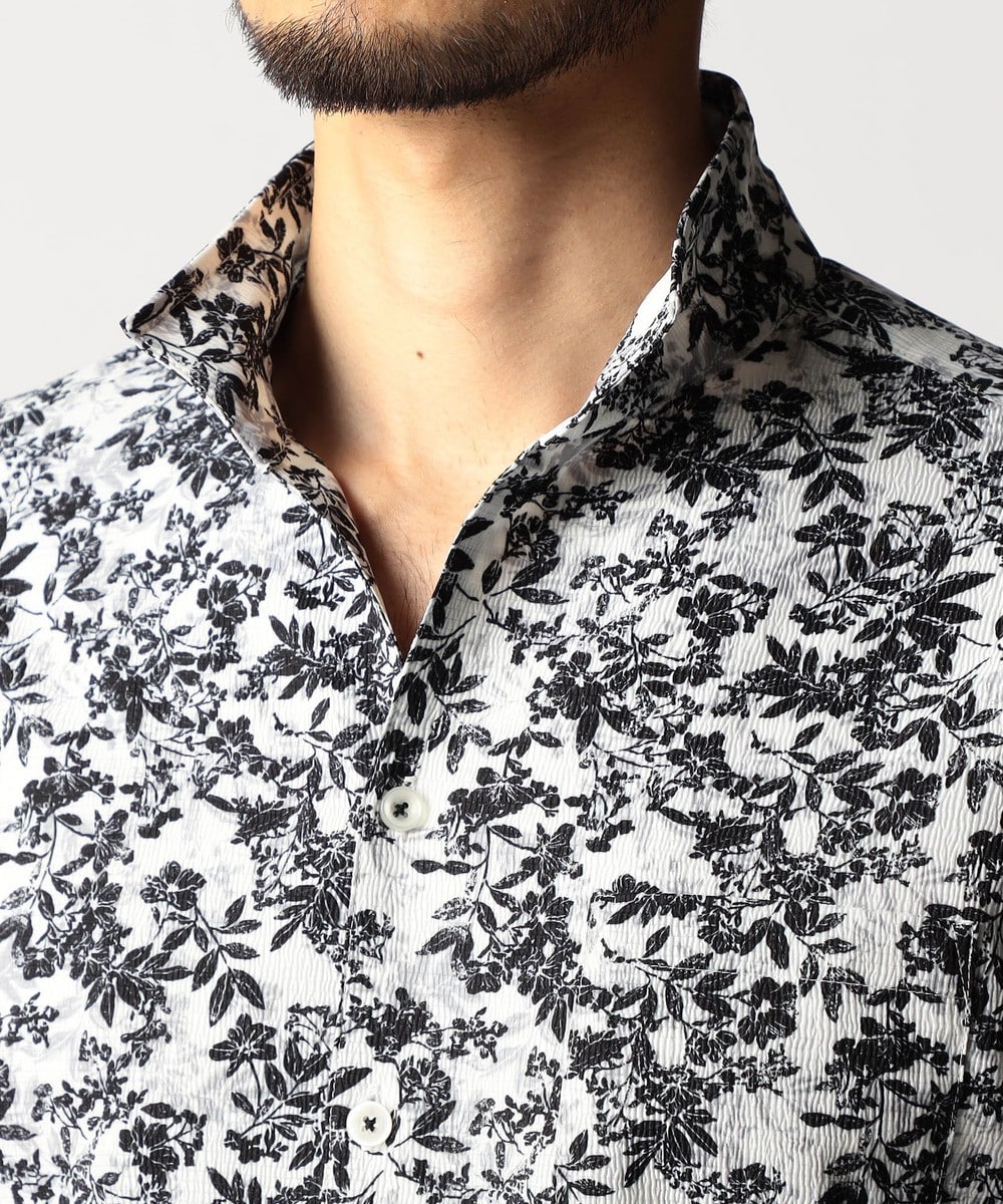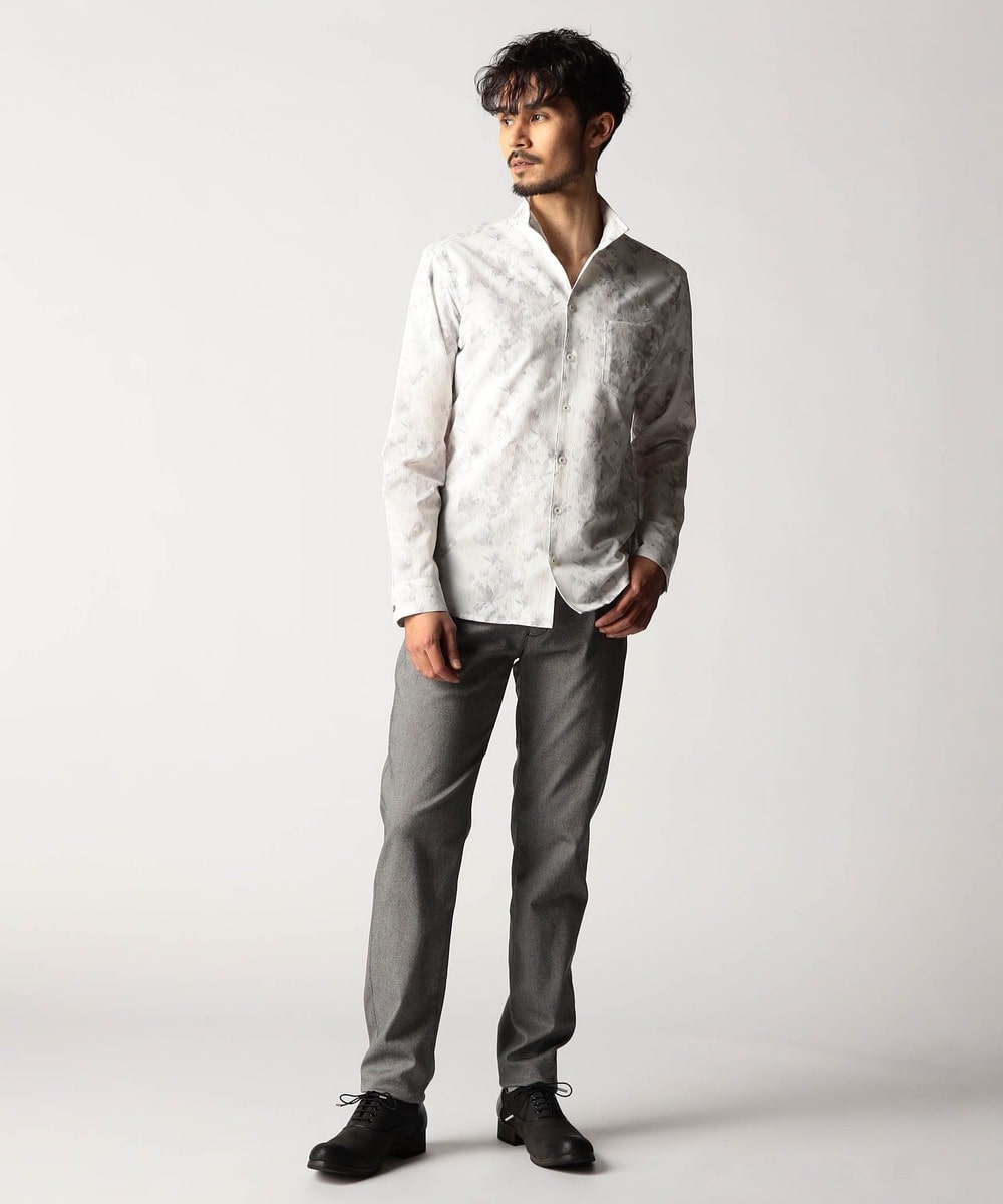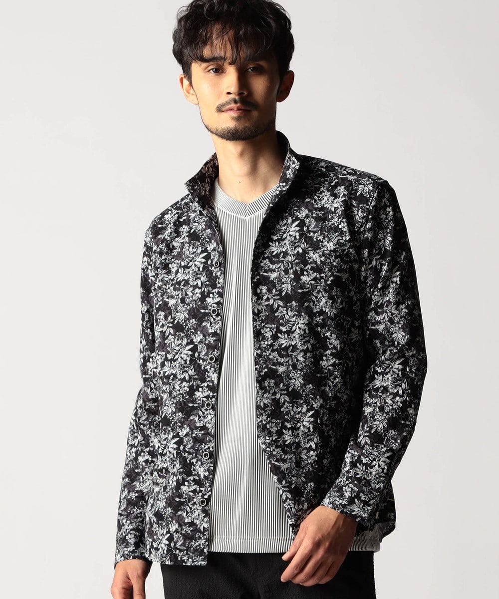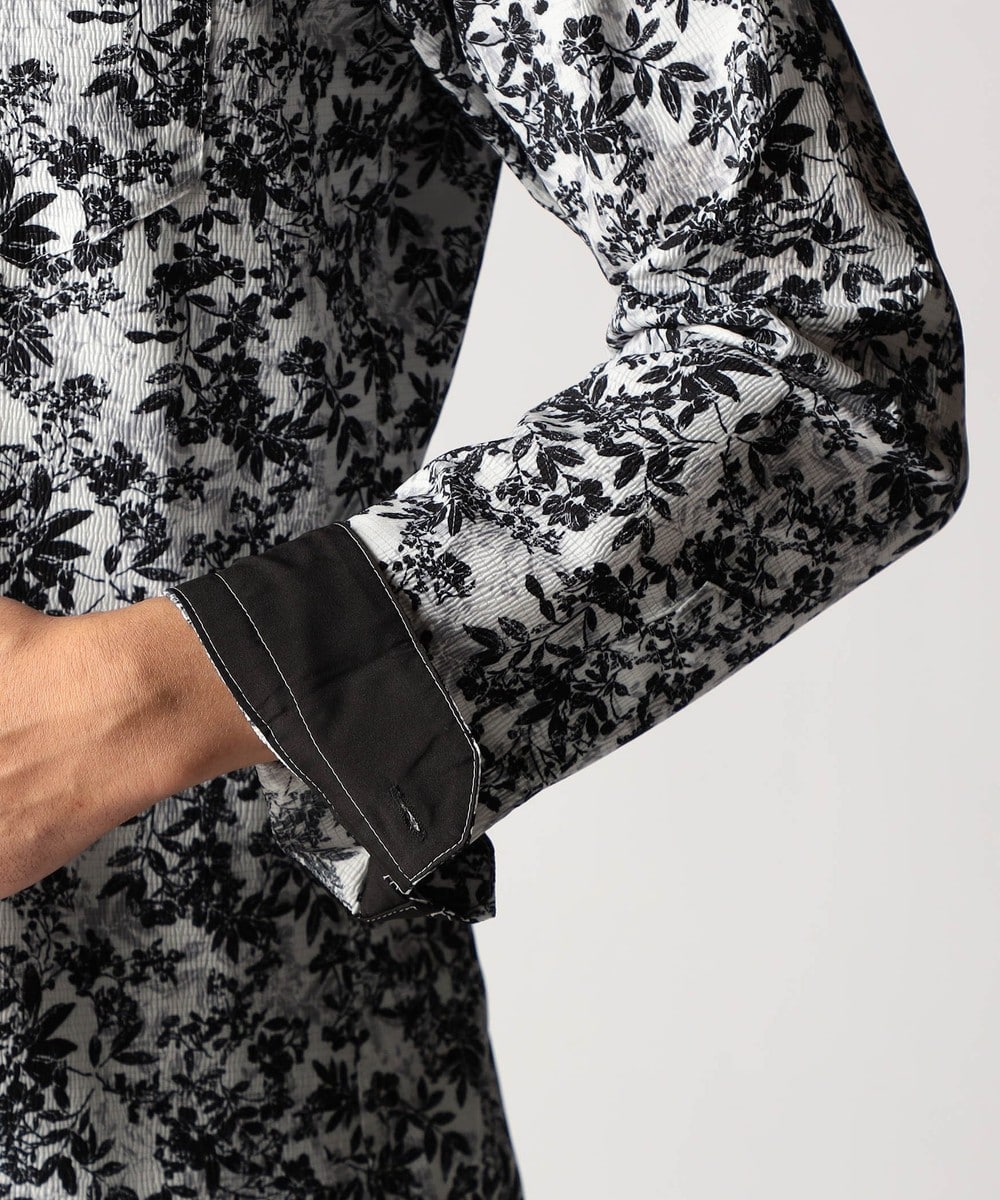 衿端にワイヤ-を仕込んだスタンド・イタリアンカラ-シャツ。ヨーク裏やカフス裏など無地配色のストレッチ裏地を使い、アクセントになる様にしています。生地のプリント配色とリンクした釦や付け糸も、ちょっとしたアクセントになっています。