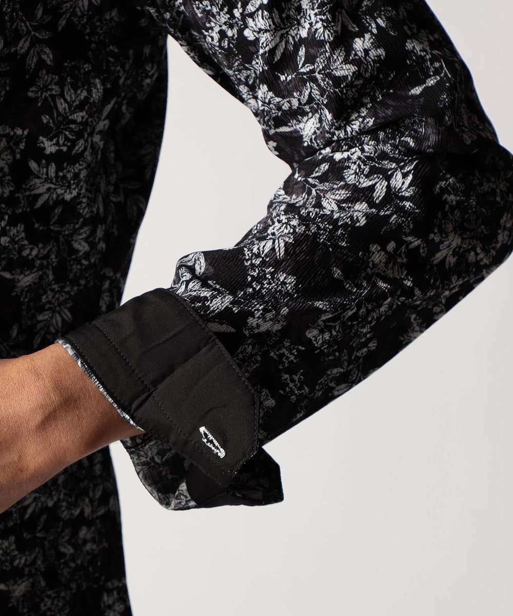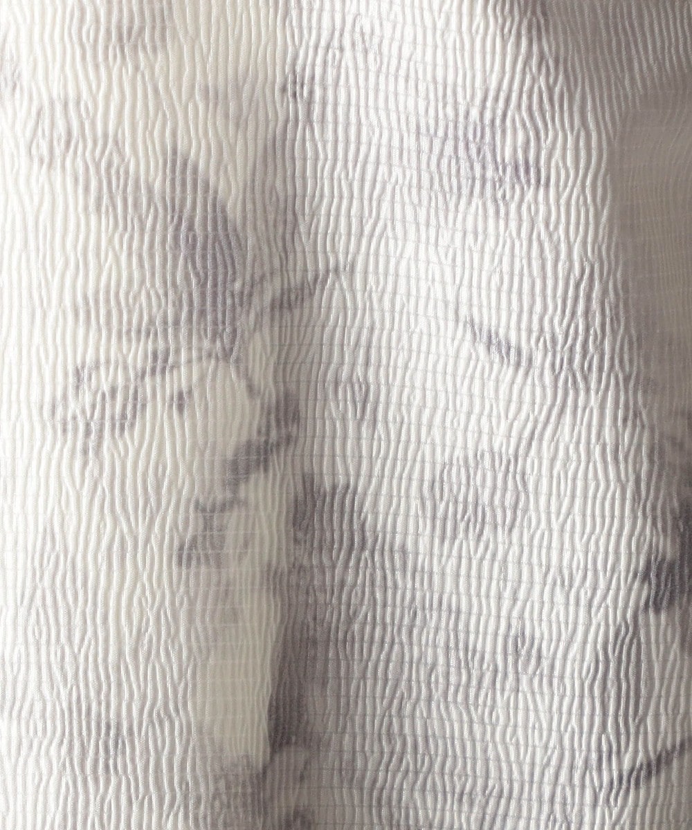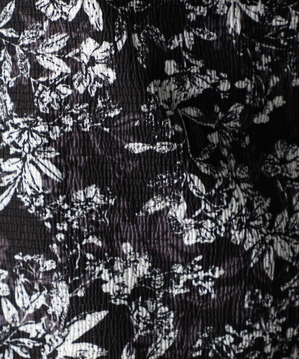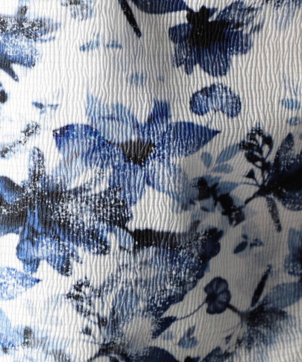 マイクロメッシュのポリエステル素材に細かいリップル(シワ)加工を施した生地がベース。09オフ?グレー/60オフ?ブルーは、掠れさせたボタニカル柄の同色系プリント、91その他2オフ?ブラック/92その他3ブラック?オフは、掠れた小花柄プリント柄の配色展開です。92その他3は、白場を目立たせたいので、柄全体を少し大きくして、見た目にこだわっています。ベース素材のナチュラルなワッシャー感にサラッとした清涼感、程良いマルチストレッチが特徴です。