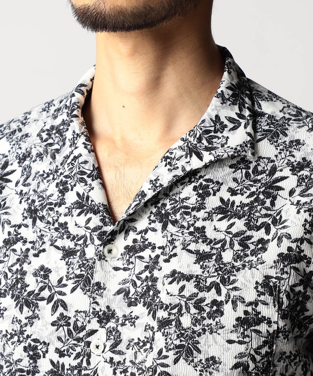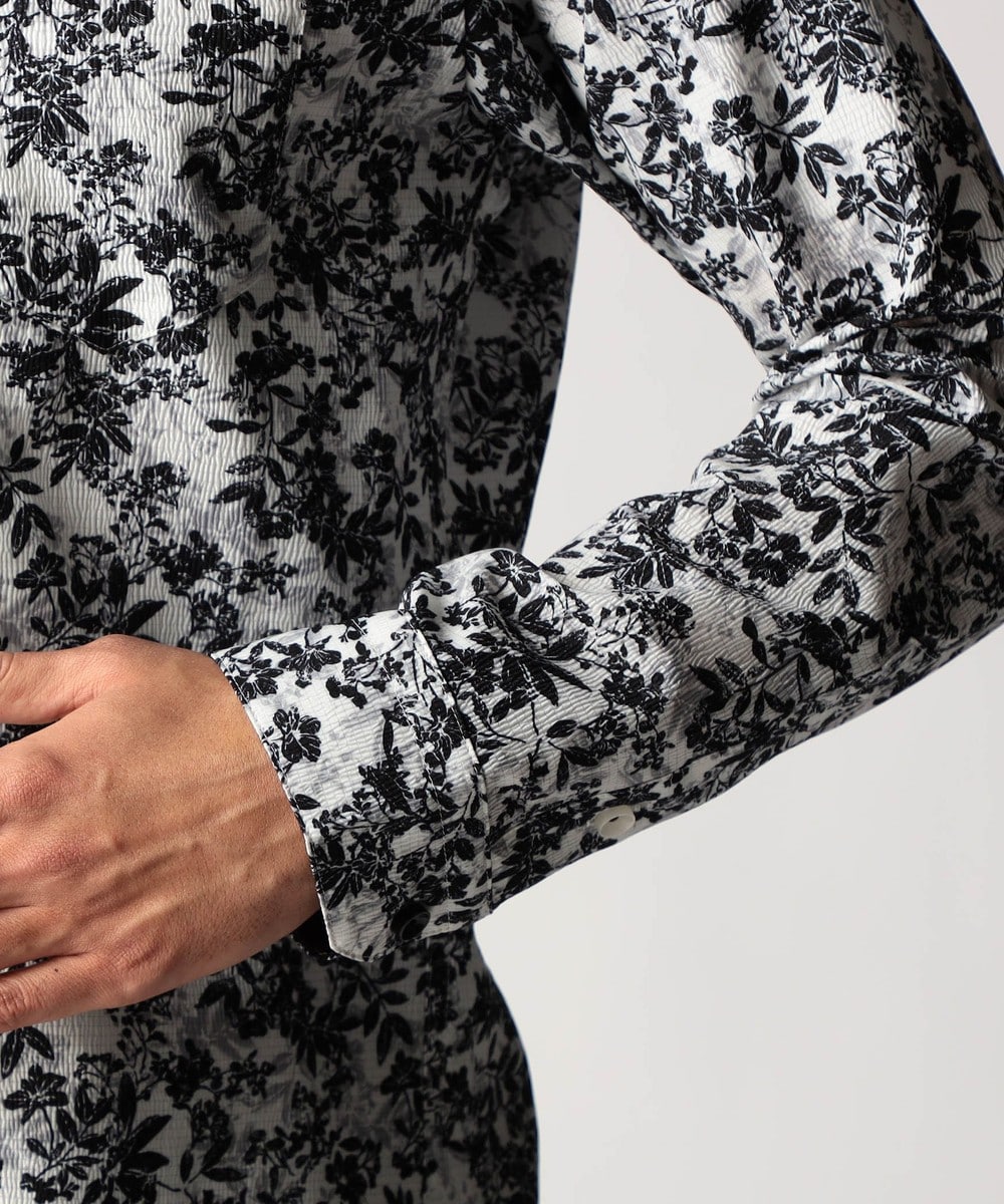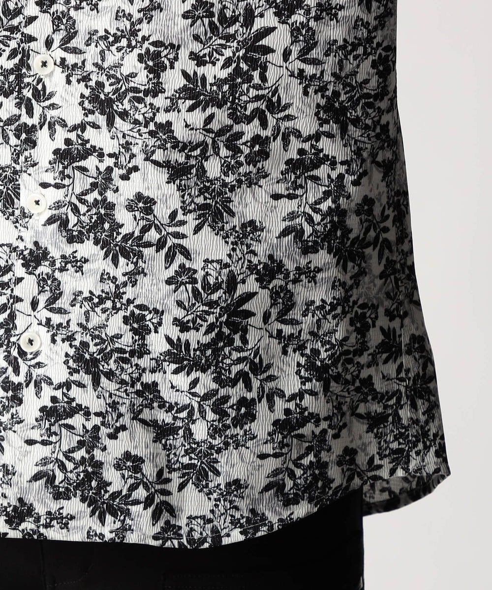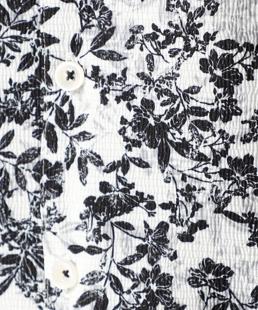 マイクロメッシュのポリエステル素材に細かいリップル(シワ)加工を施した生地がベース。09オフ?グレー/60オフ?ブルーは、掠れさせたボタニカル柄の同色系プリント、91その他2オフ?ブラック/92その他3ブラック?オフは、掠れた小花柄プリント柄の配色展開です。92その他3は、白場を目立たせたいので、柄全体を少し大きくして、見た目にこだわっています。ベース素材のナチュラルなワッシャー感にサラッとした清涼感、程良いマルチストレッチが特徴です。