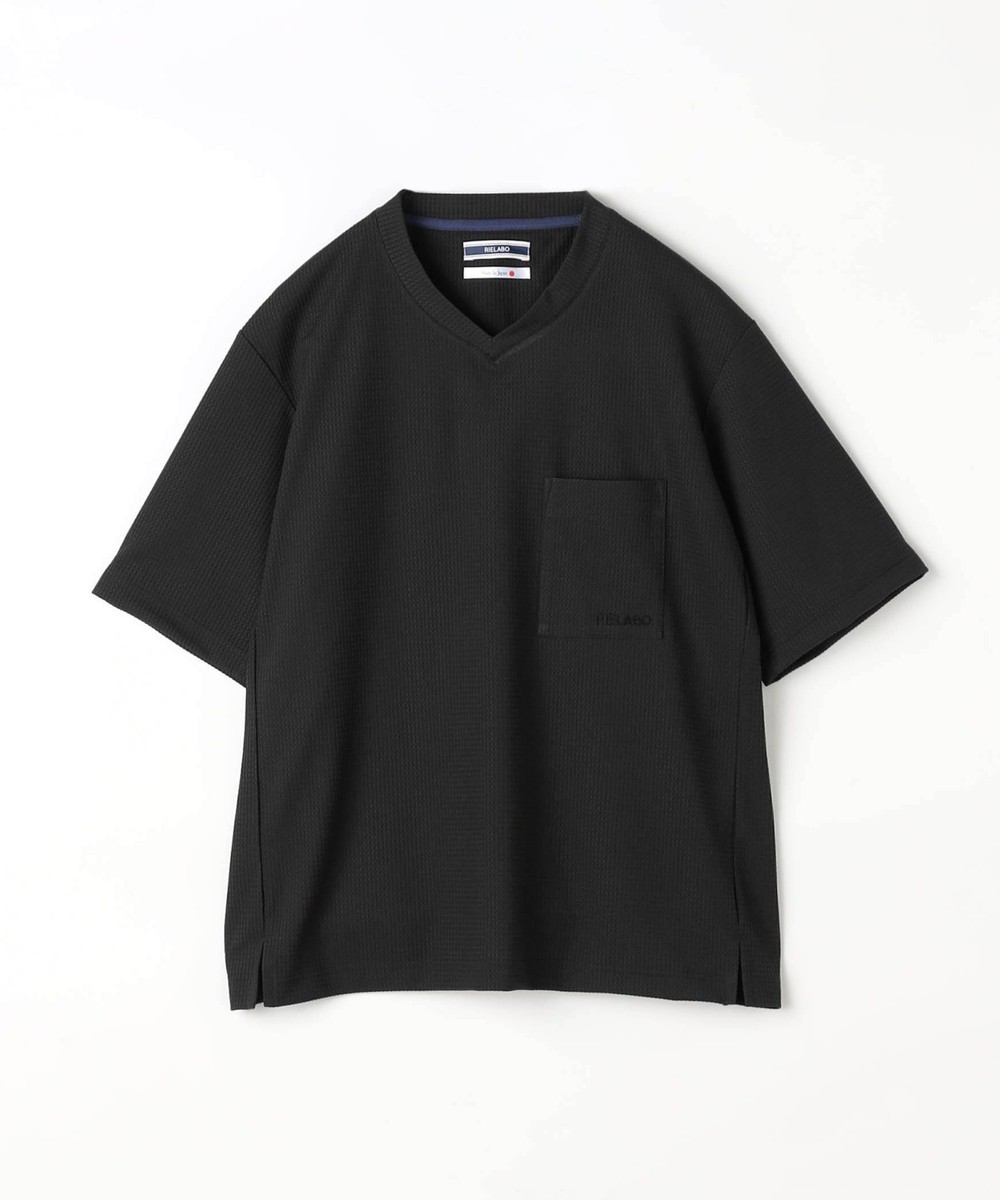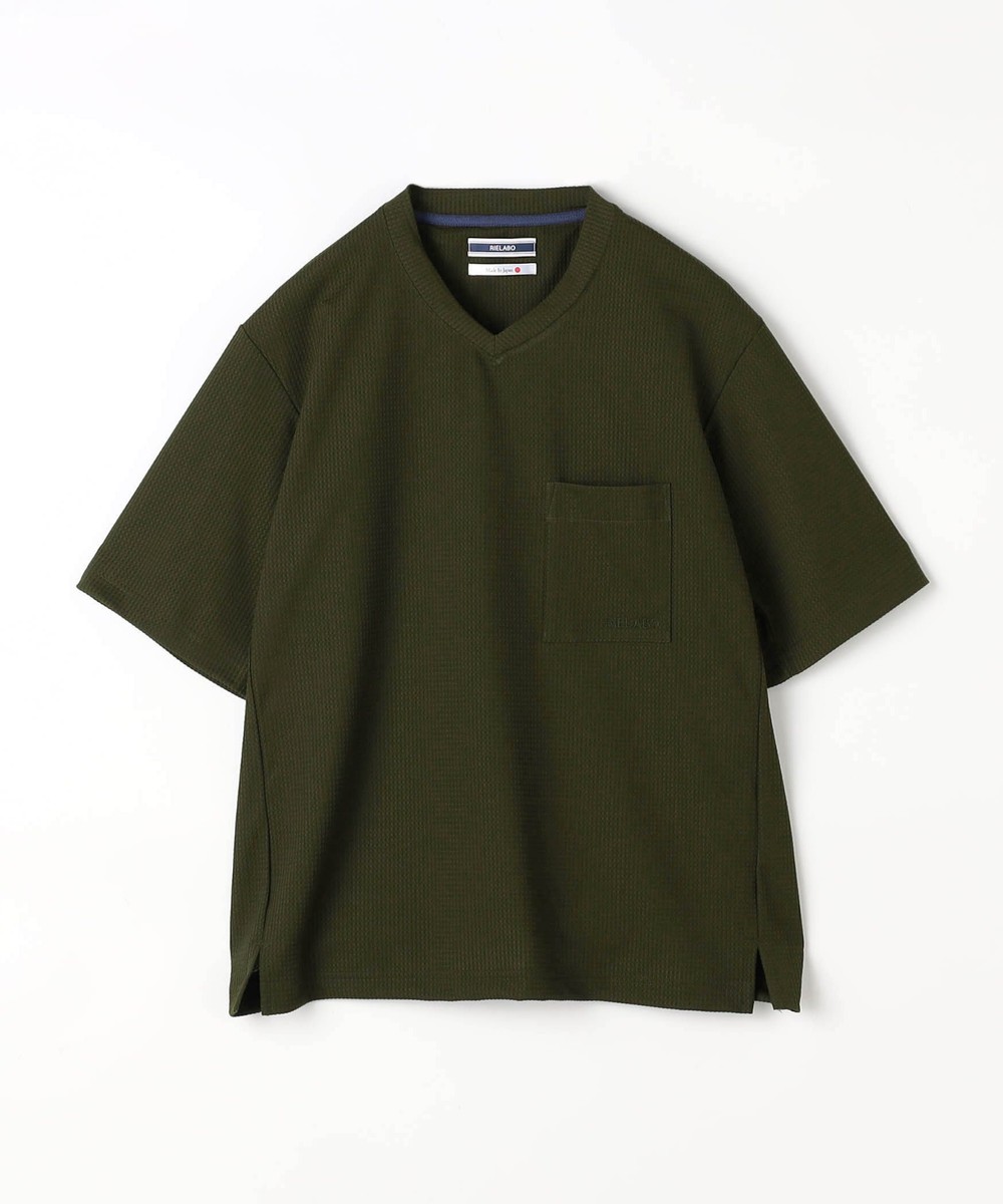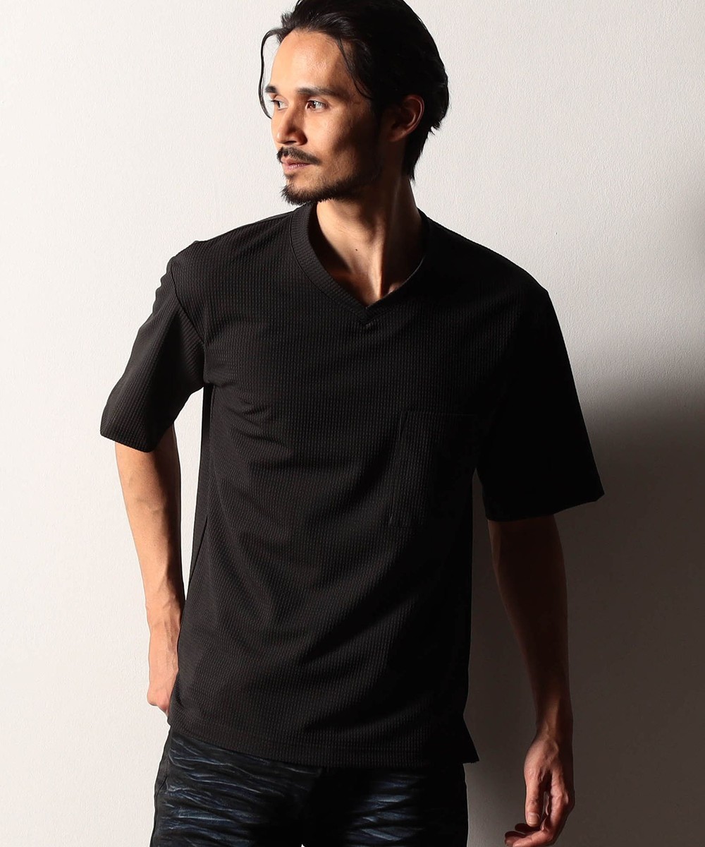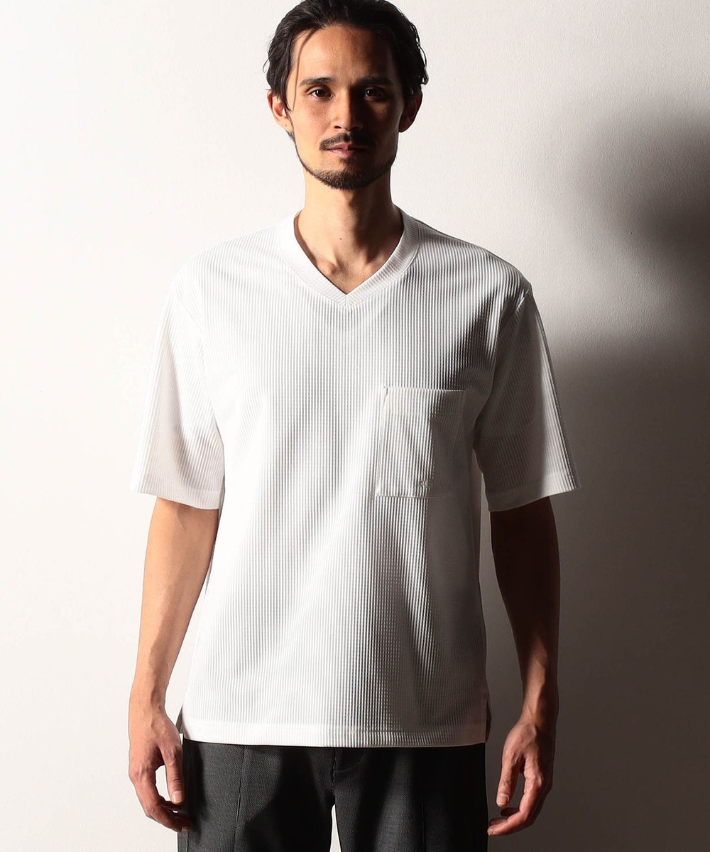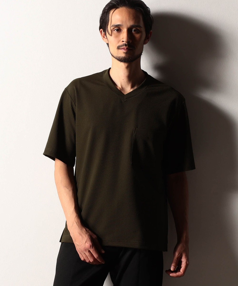 浅めのネックデザインにフロントのパッチポケットで遊びを効かせたVネックカットソー。