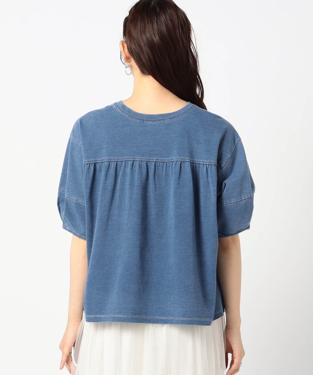 後ろヨークの切替から細かいギャザーが入り、ふんわりとした印象にまとまっていますが、カジュアルなインディゴの素材感が甘さを押さえ、絶妙なバランスに仕上がっています。