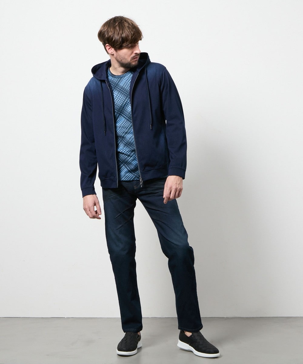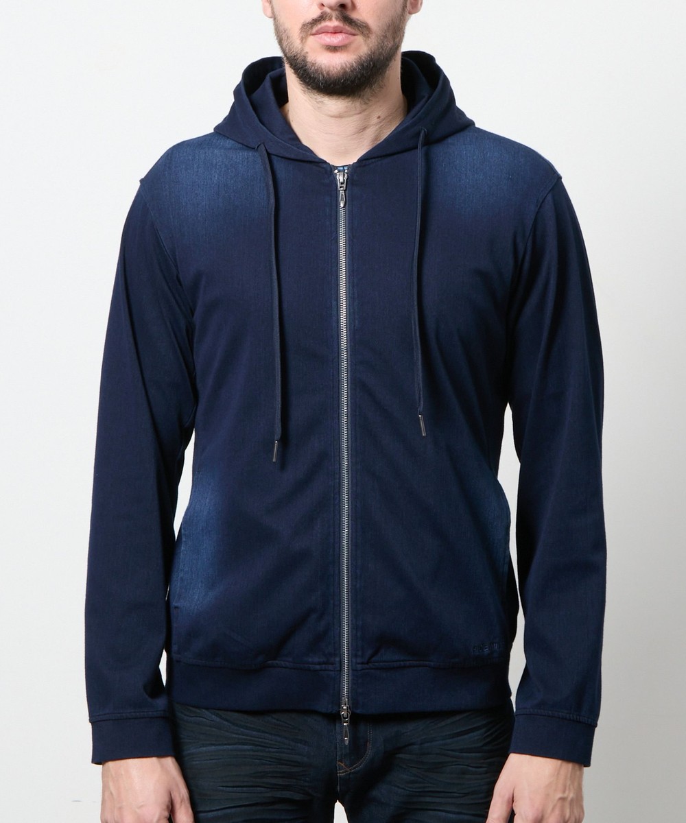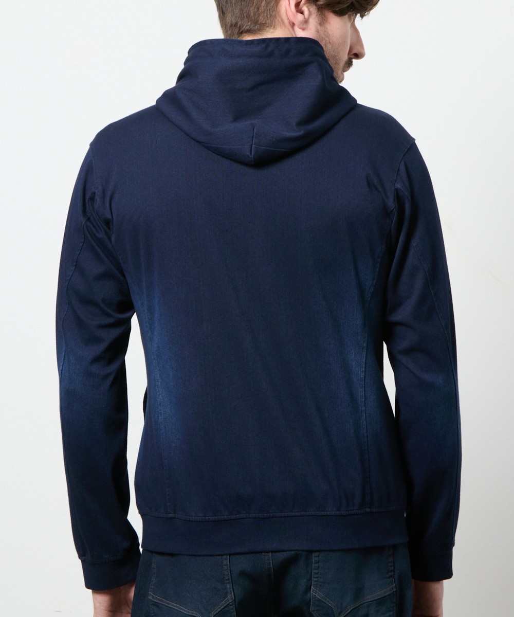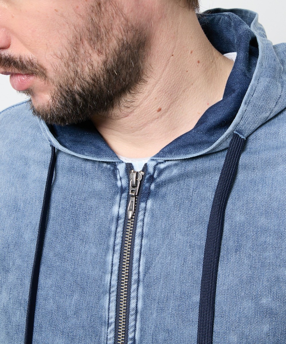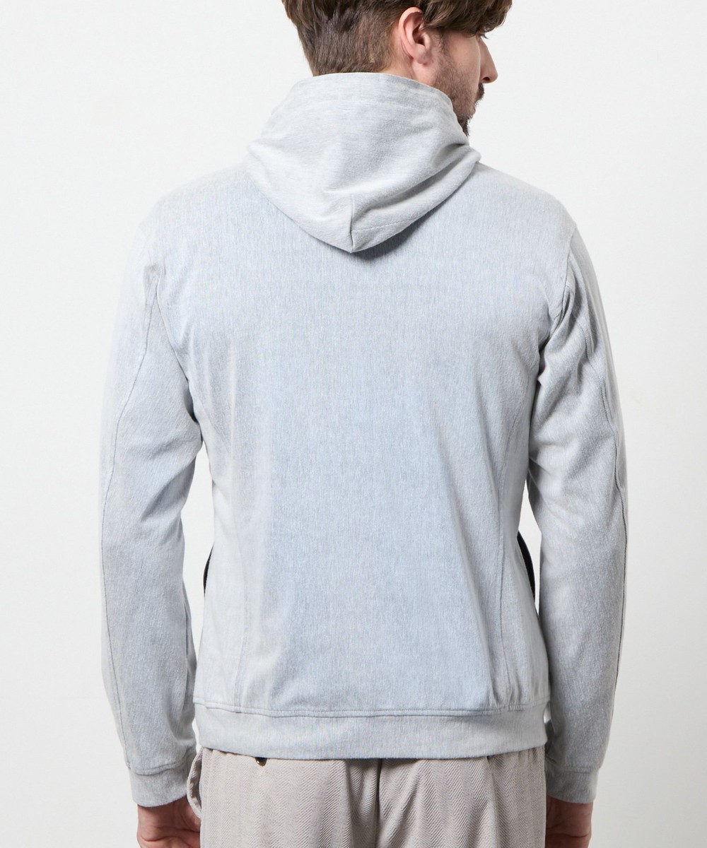 一重のジップアップパーカー。細腹をとり、袖も2枚接ぎにする事で普通のパーカーとは一線を画す綺麗なシルエットに仕上げています。切替を活かしたシームポケットはスッキリしたデザインで、左裾にブランドロゴの同色刺繍を入れています。フロントの逆開ファスナーや、フードを2重にする事で立ちが良く小顔見え効果も図っています。春から初夏に向けてTシャツの上に羽織るのに丁度よい肉厚感とサイズ感で、上にアウターを着用しても着ぶくれしないスッキリしたシルエットです。