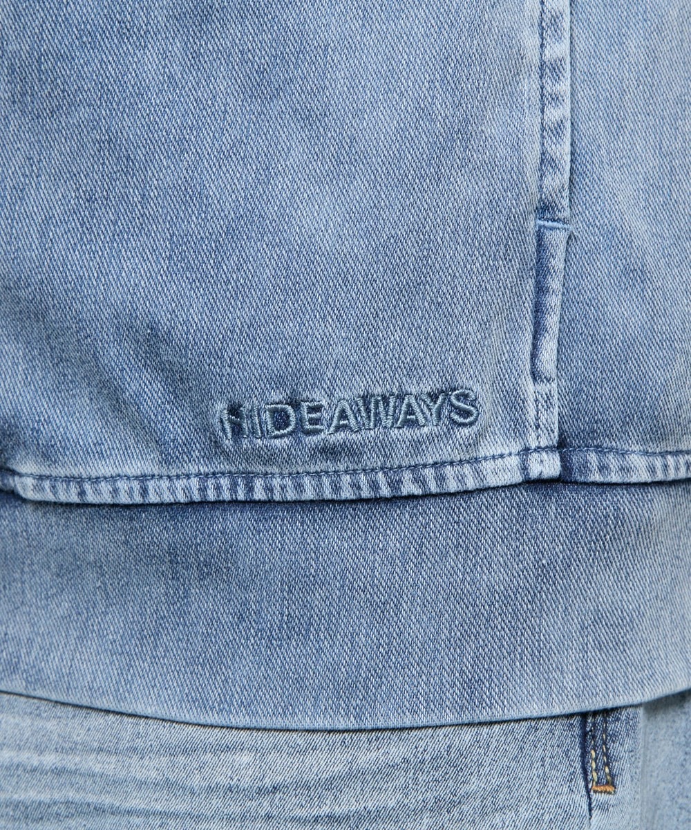 6オンスくらいのヘビーオンスの天竺素材同等のジャージ素材です。09ホワイトは、ヨコ黒調の組織で薄いグレーに見えます。64サックスと67ネイビーは濃色のインディゴ染めのジャージデニム。ジャージ素材ならではのテンションのあるストレッチ性と、しっかりした張り感のある風合いなので加工栄えするのが特徴です。