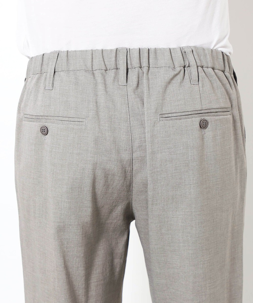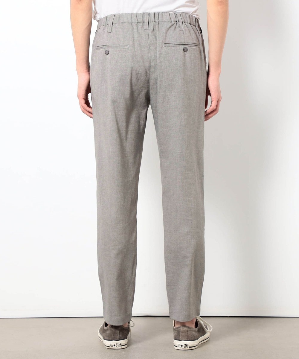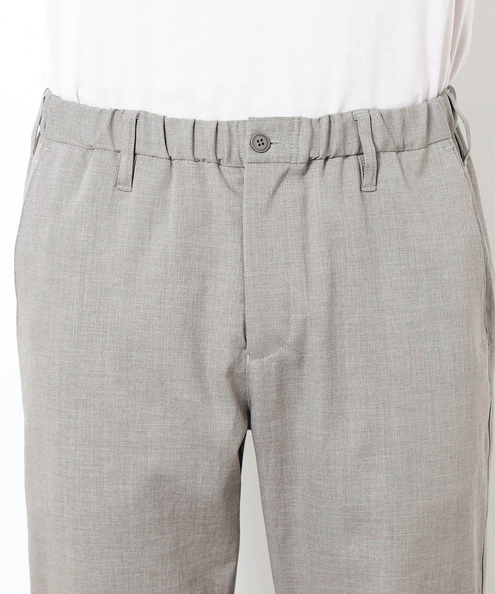 麻のような清涼感ある肌触りと表面感を、扱いやすいポリエステル素材で表現したリネンライクテーパードパンツ。