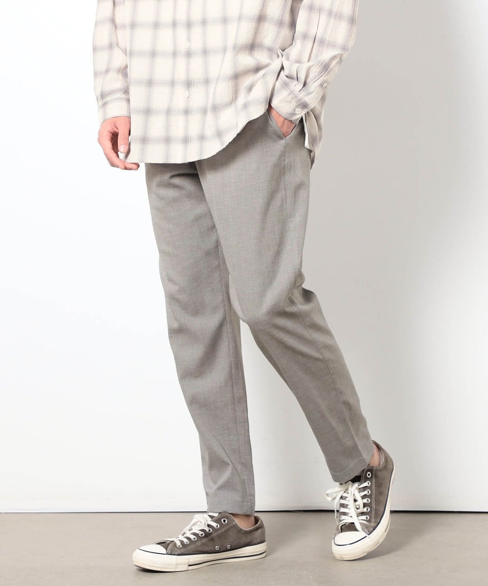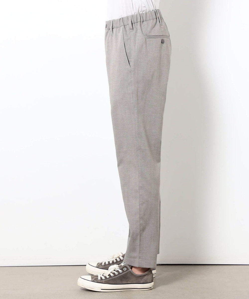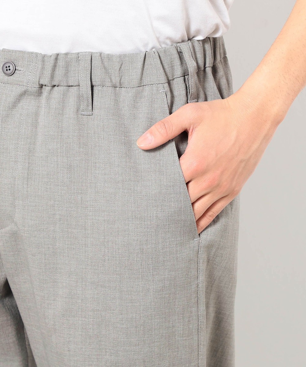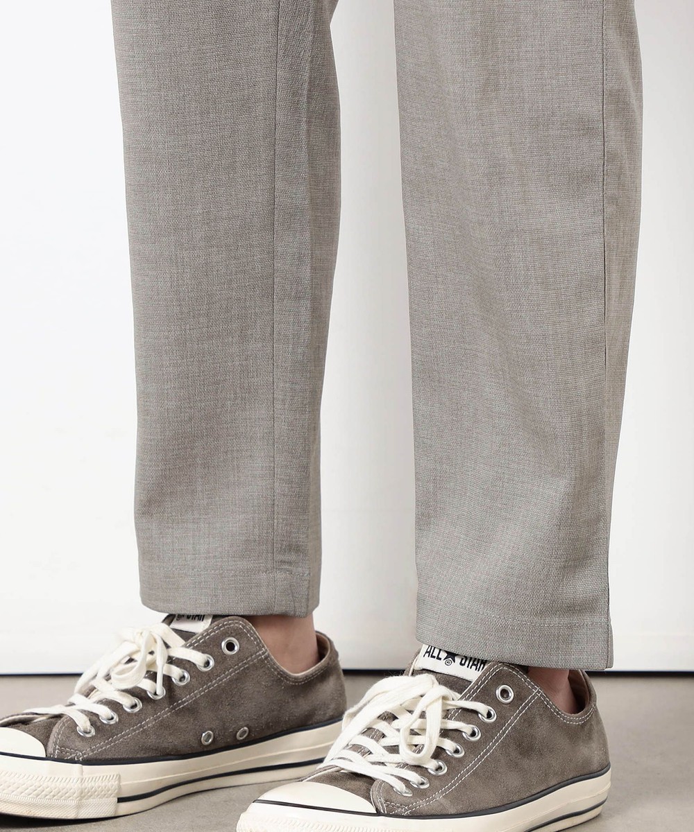 麻のような清涼感ある肌触りと表面感を、扱いやすいポリエステル素材で表現したリネンライクテーパードパンツ。