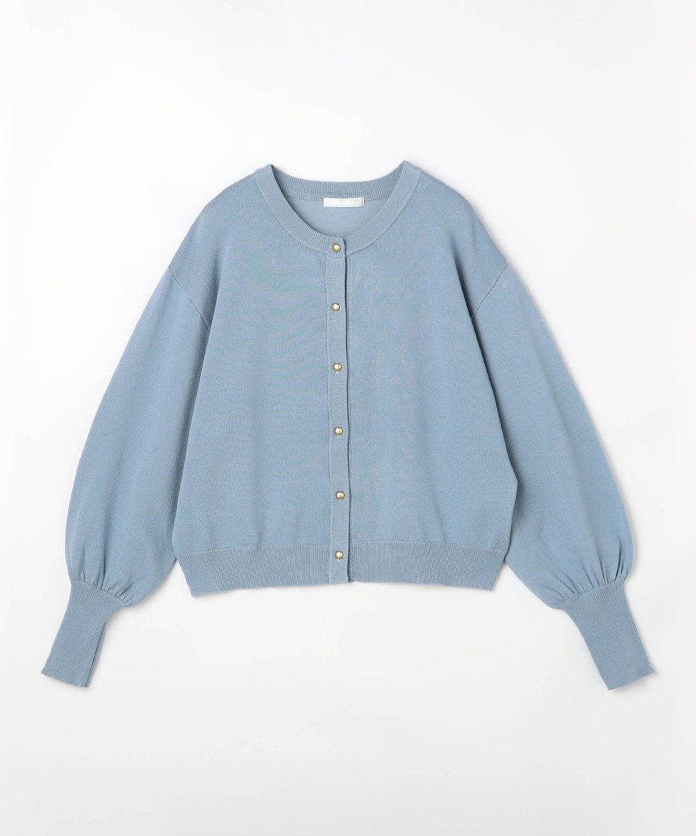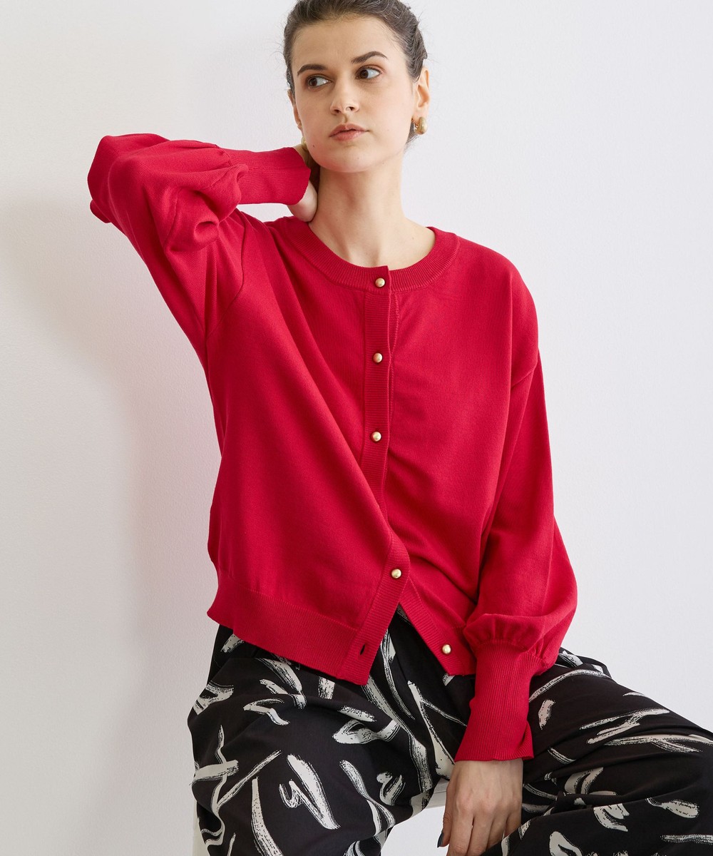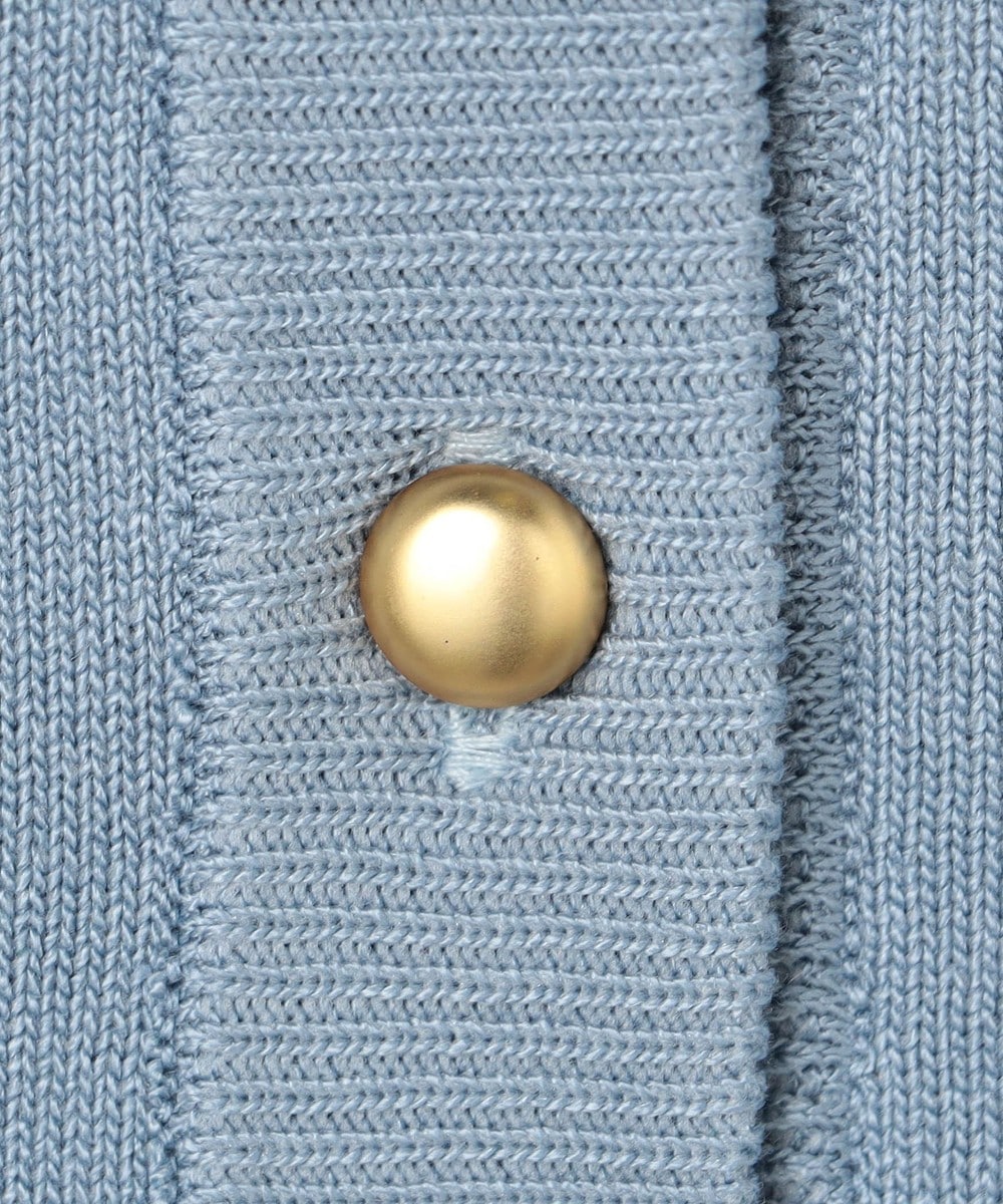 シンプルなクルーネックに金ボタンがアクセントになったニットカーディガン。