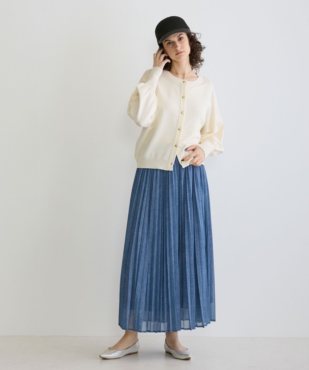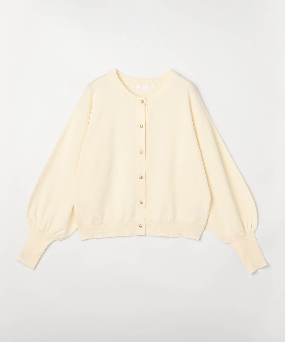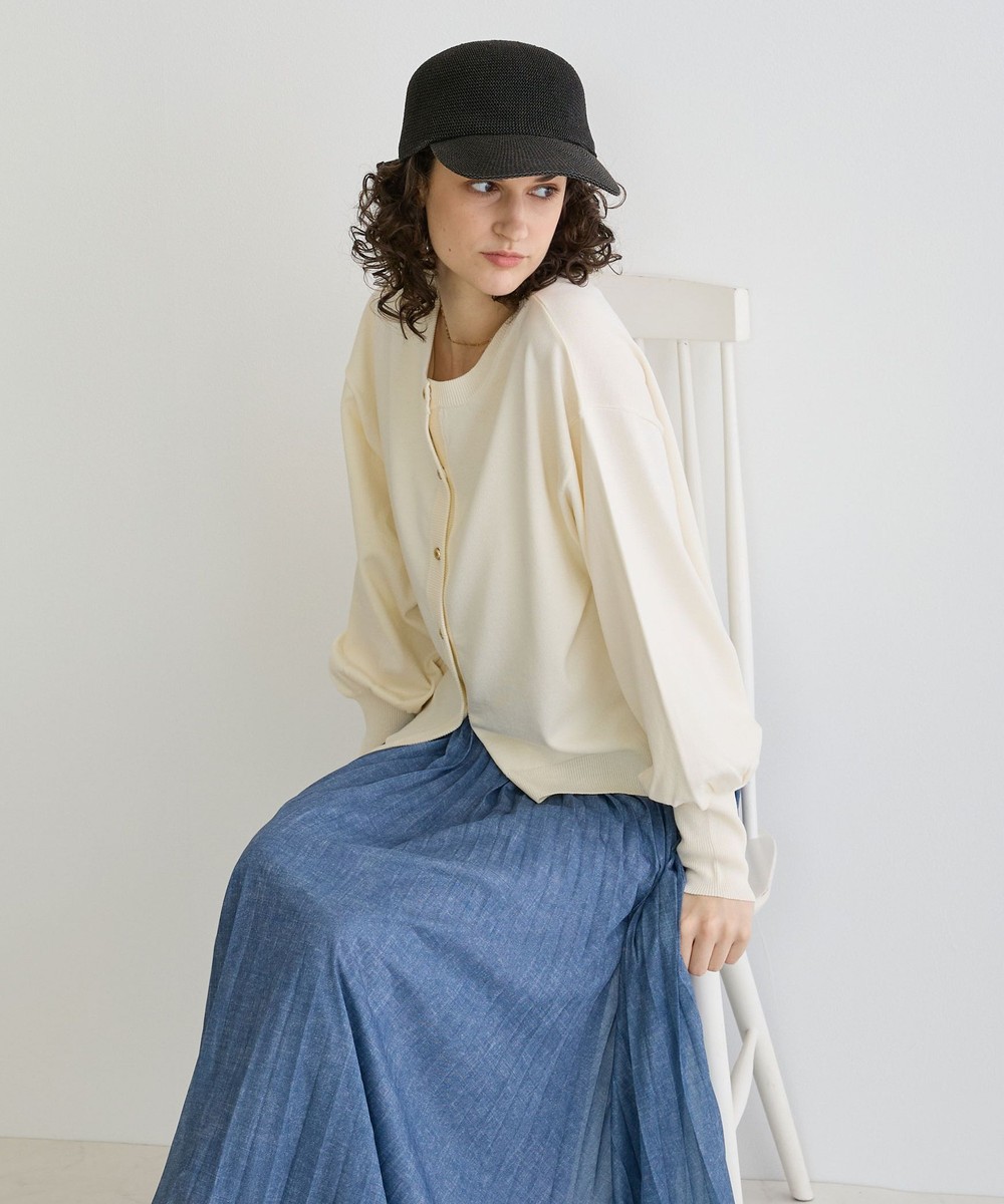 シンプルなクルーネックに金ボタンがアクセントになったニットカーディガン。