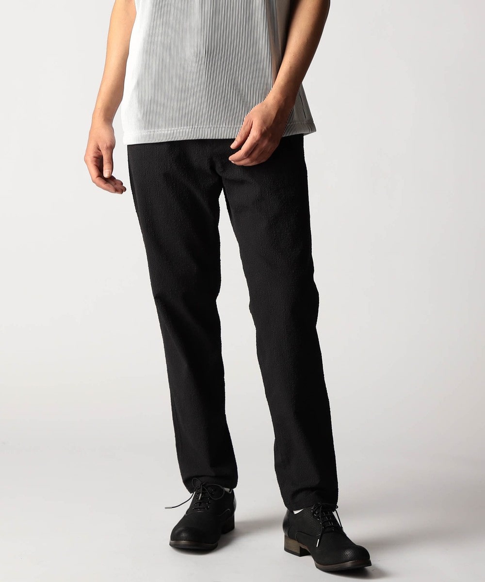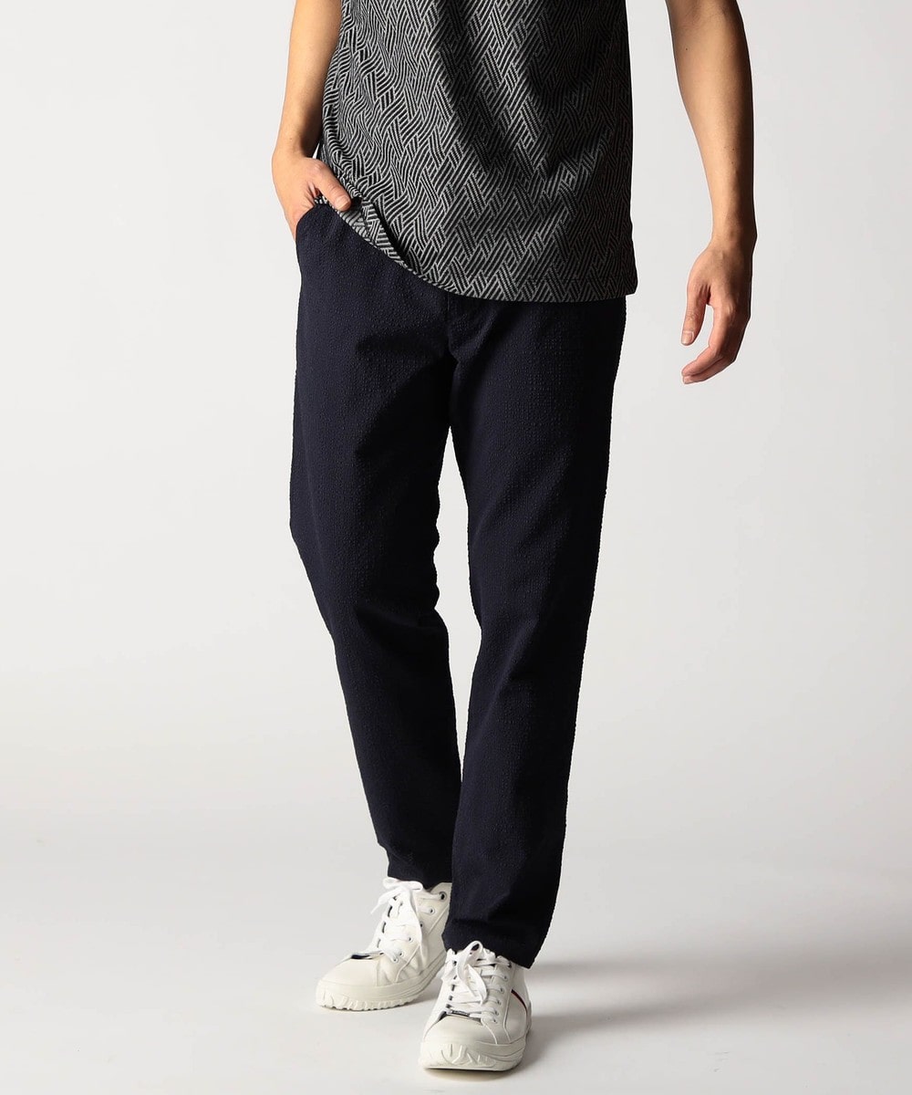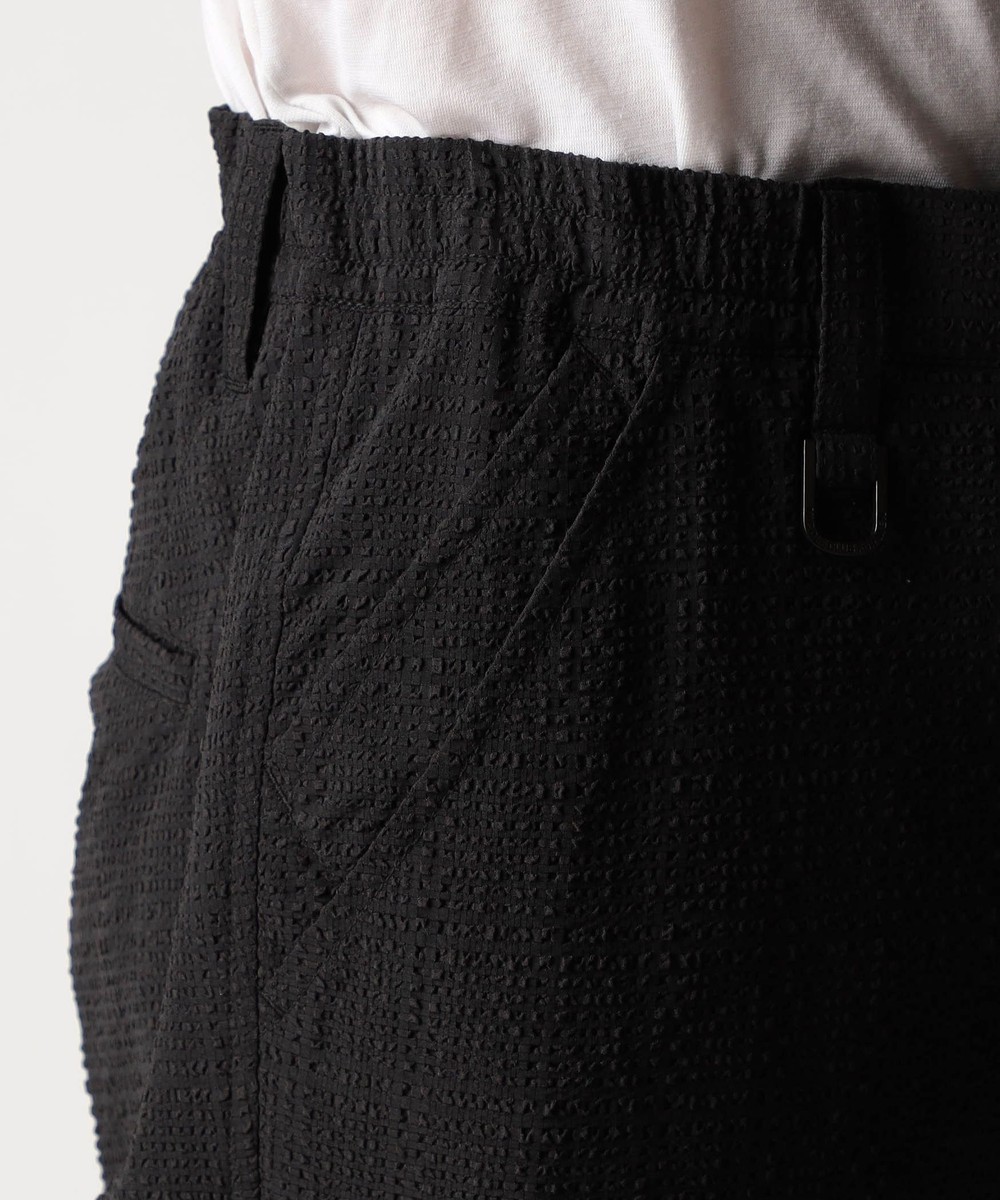 ウエスト、イージー仕様のスラックスデザインパンツ。ウエストベルトには平ゴムとスピンドルを通しています。ベルト裏にはジャカード裏地をアクセントに使用、内側の袋布などストレッチ裏地を使用して表地に追従するストレスフリーな穿き心地、清涼感を高めます。ロゴ入り釦やオリジナルDカンを採用して差別化を図っています。