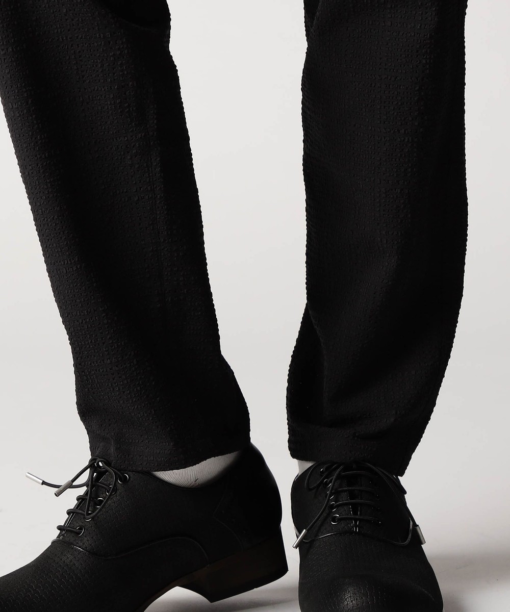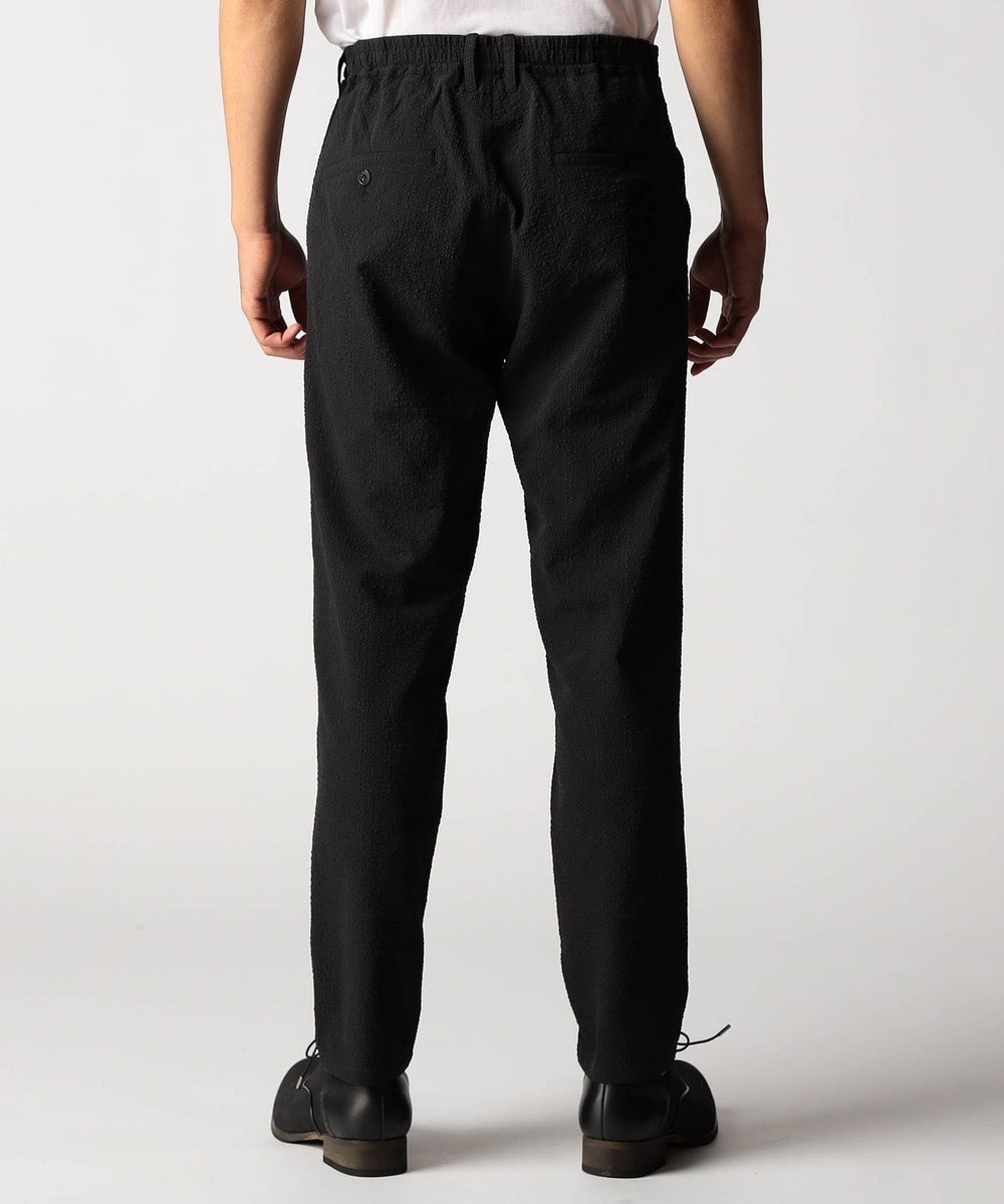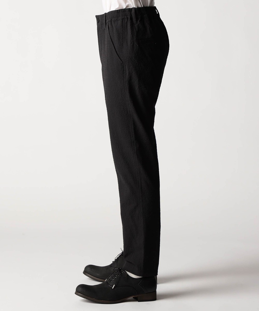 ウエストベルトの中に平ゴム入れ、更にスピンドルを通していますのでサイズ調整しやすいイージーパンツ仕様です。ヒップ周りから渡り幅を細くして裾口にかけてテーパードさせたシルエットのノータックパンツになります。股下サイズは8分丈の短めの設定です。