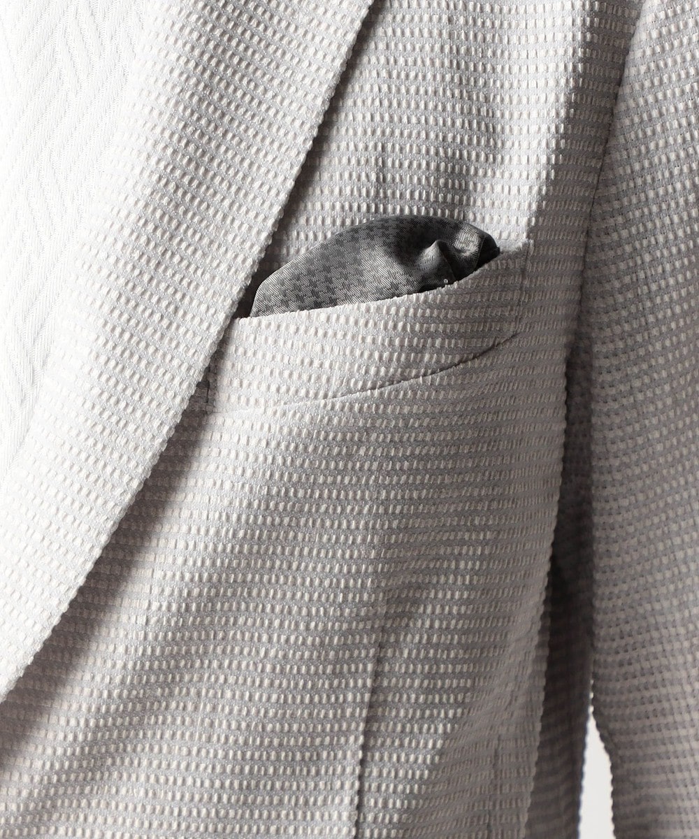 ノッチドラペルの2Bジャケット。腰ポケットは少し斜めのスラントポケットにする事で、ウエストシェイプのある綺麗なXラインのシルエットを強調しています。極力ステッチも入れずシンプルに作りました。左胸はフェイクチーフ仕様、大身返しの半裏仕様で軽く作り、ジャカード裏地を採用して内ポケットを両身に設ける事で高級感ある見え方にしています。フロントの一番下の釦は止める設定になっていませんのでご注意ください。
