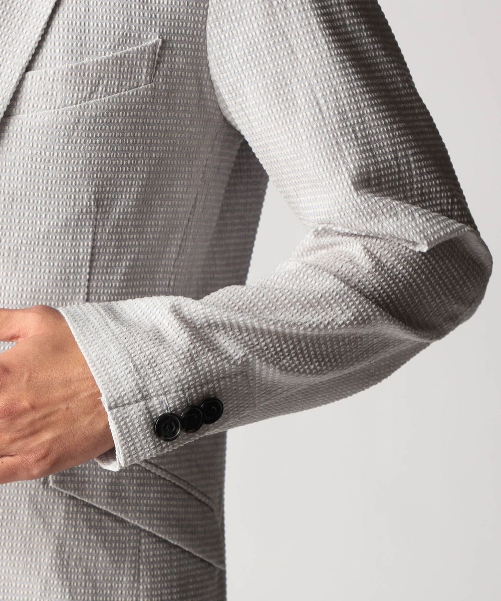薄手シアーメッシュのポリエステルシアサッカー素材がベース。更に掠れ柄のムラプリントを施しています。程良いマルチストレッチ性がとても着やすく、ソフトな風合いとメッシュの様な通気孔による高通気性、ポコポコしたオウトツ感は肌離れが良く、夏でもサラッとした快適な着心地を提供してくれます。家庭洗濯出来て、シワになり辛く、乾きやすいイージーケア性も魅力の素材です。