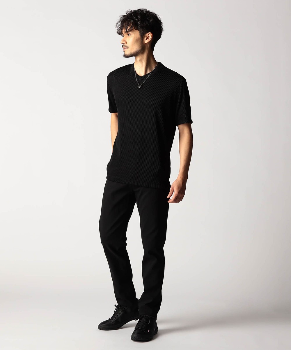 落ち感のあるタックボーダー素材をストライプ使いしたVネックカットソー。