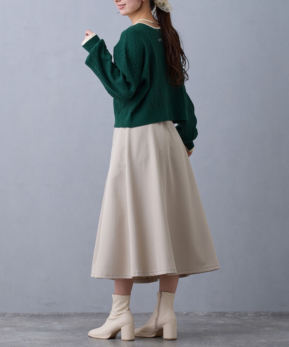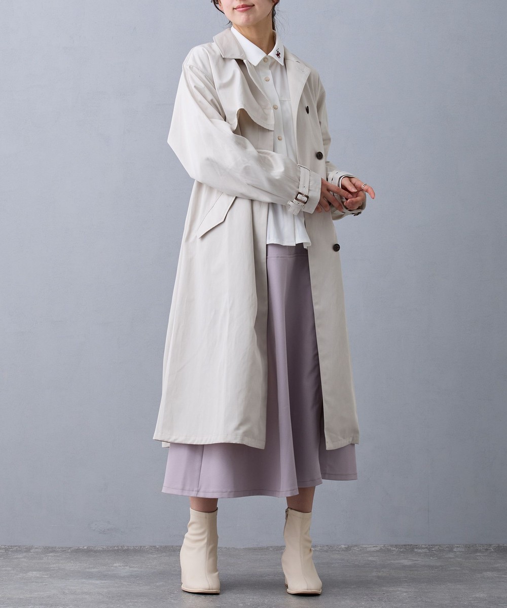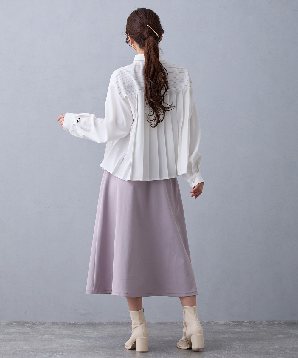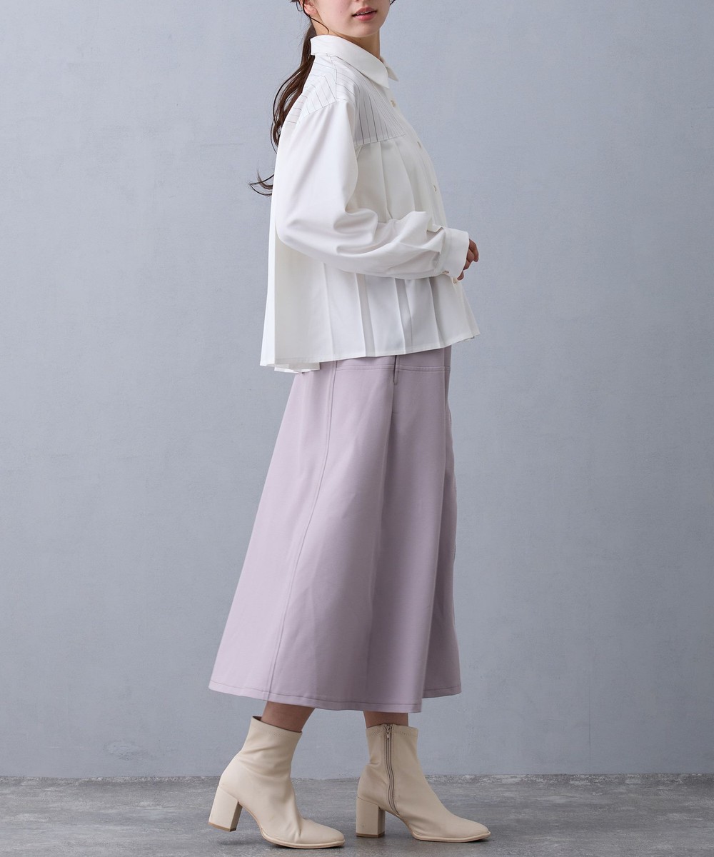 ヨーク切り替えで腰周りをすっきり見せつつもフレア分量をたっぷり取っており、歩く度揺れる裾周りが上品な印象に。