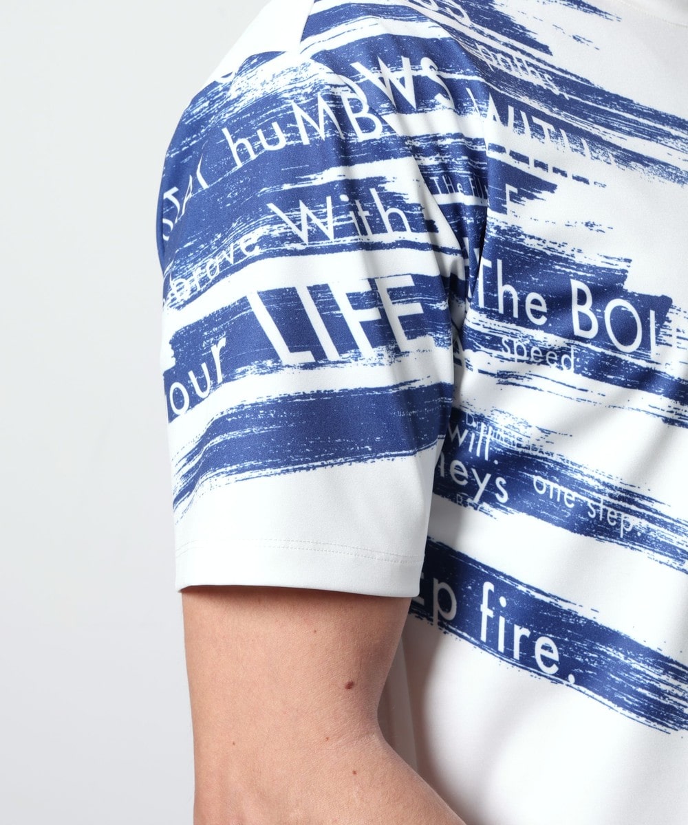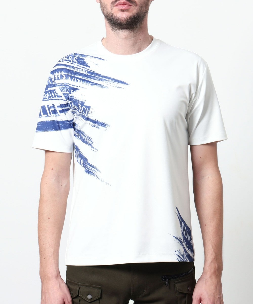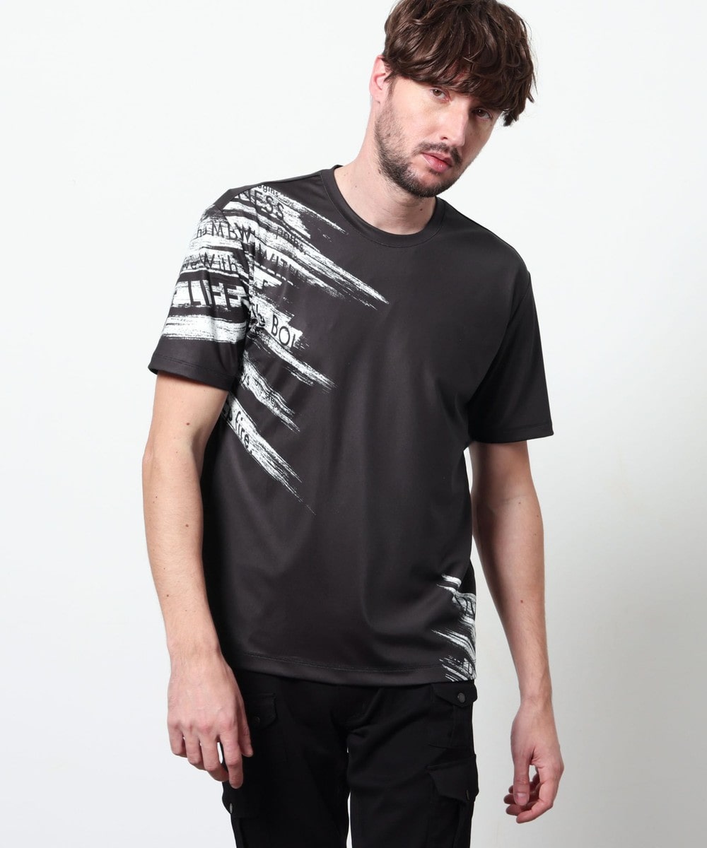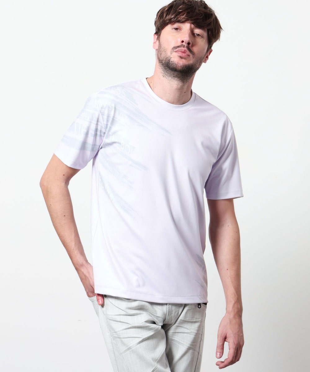 ポンチ素材にバイヤスハケメ×ロゴ柄を昇華転写でプリントした一際目を惹く、クルーネック半袖プルオーバーになります。