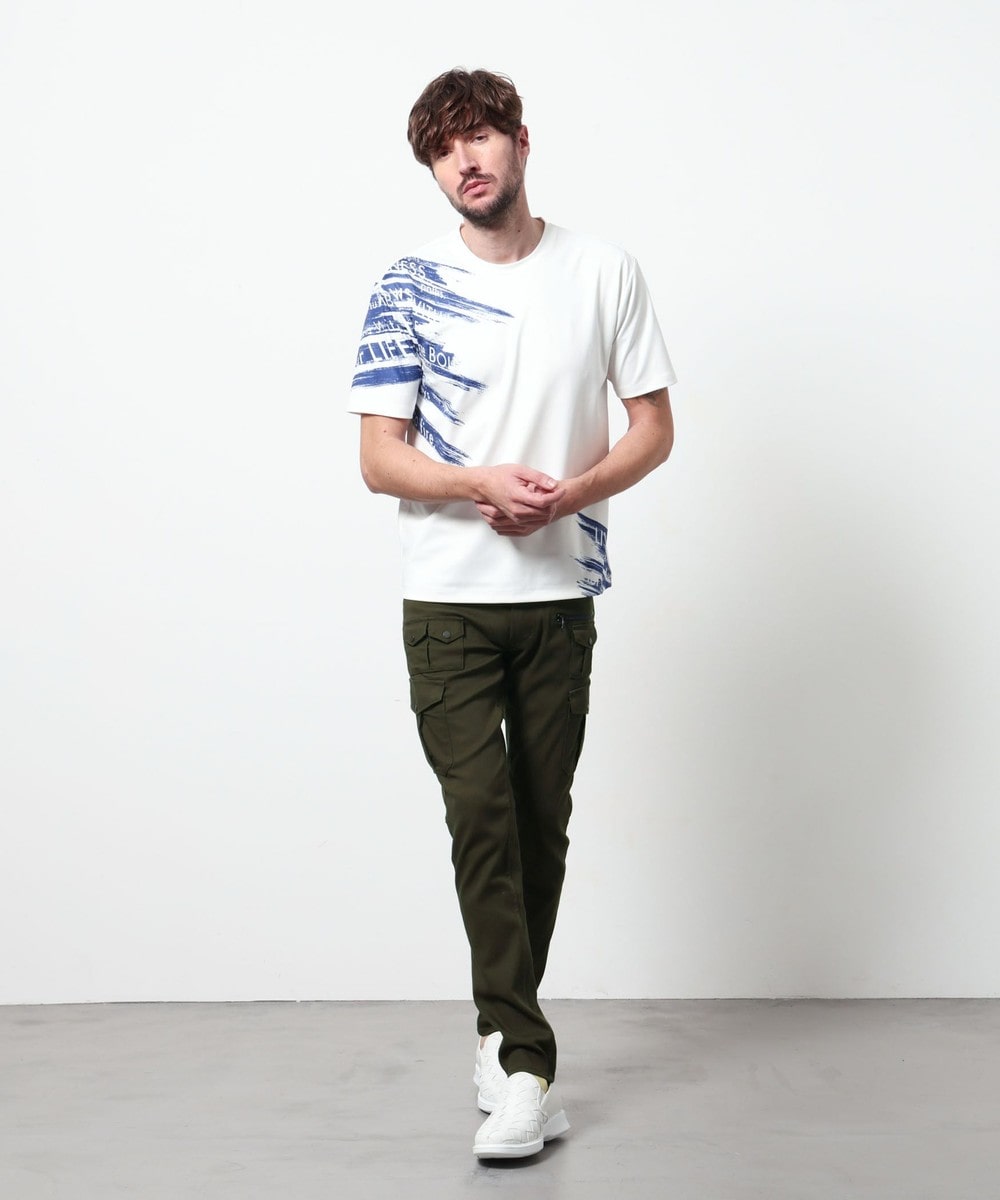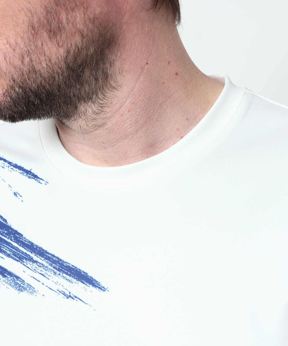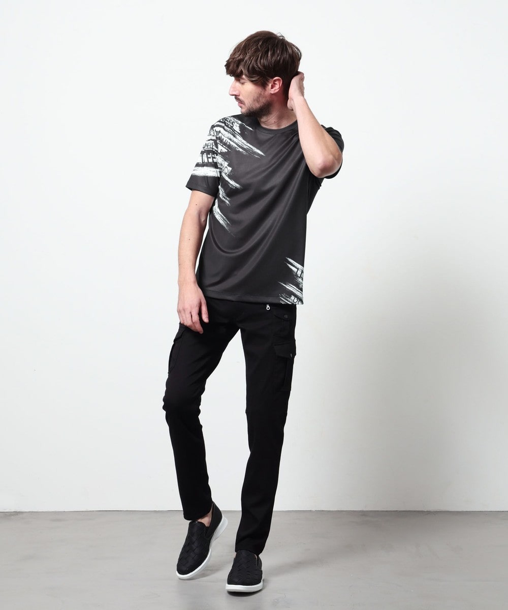 ポンチ素材にバイヤスハケメ×ロゴ柄を昇華転写でプリントした一際目を惹く、クルーネック半袖プルオーバーになります。