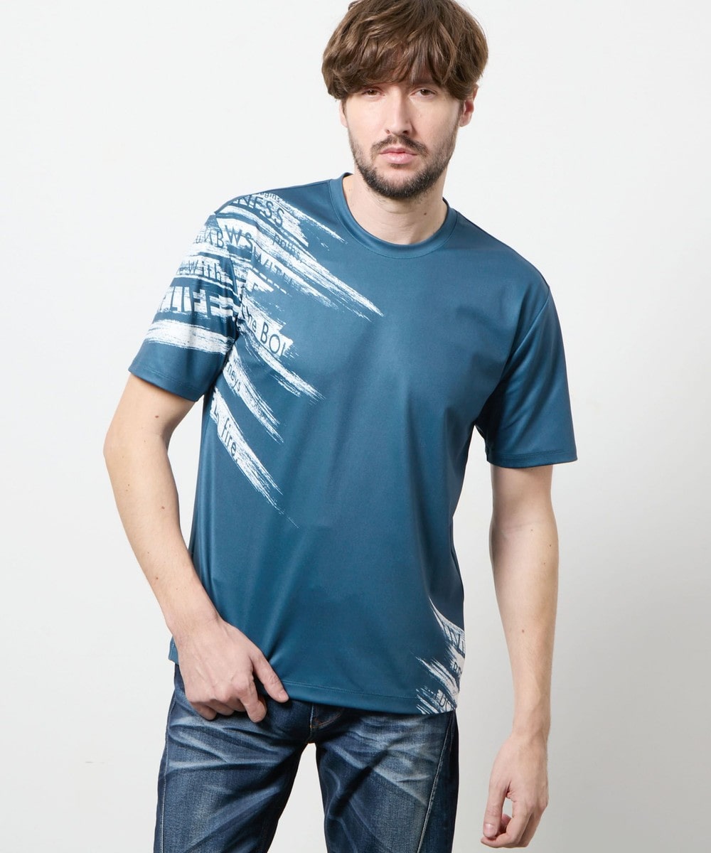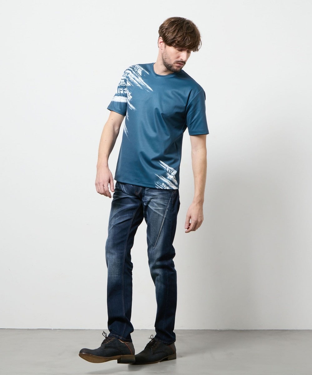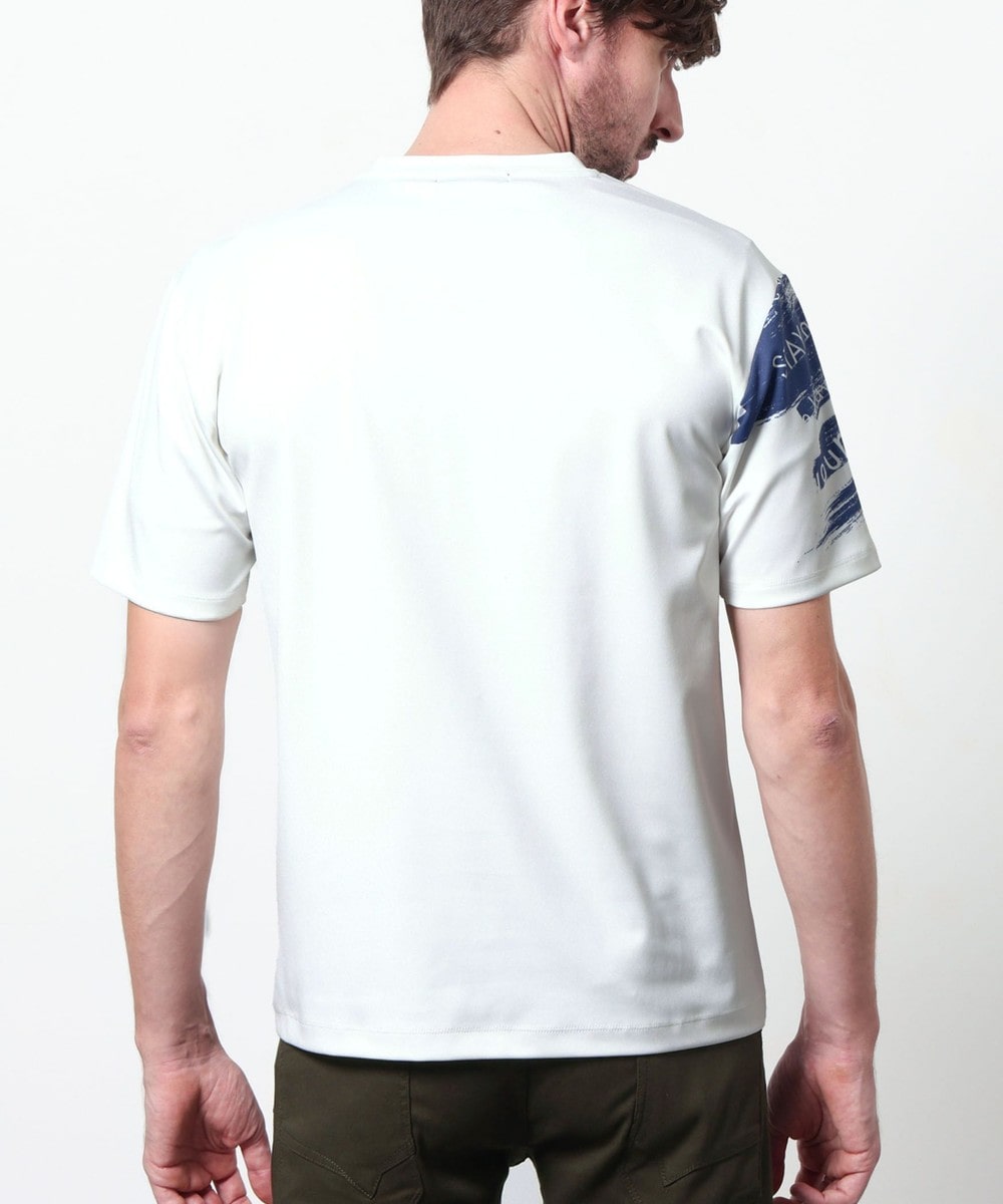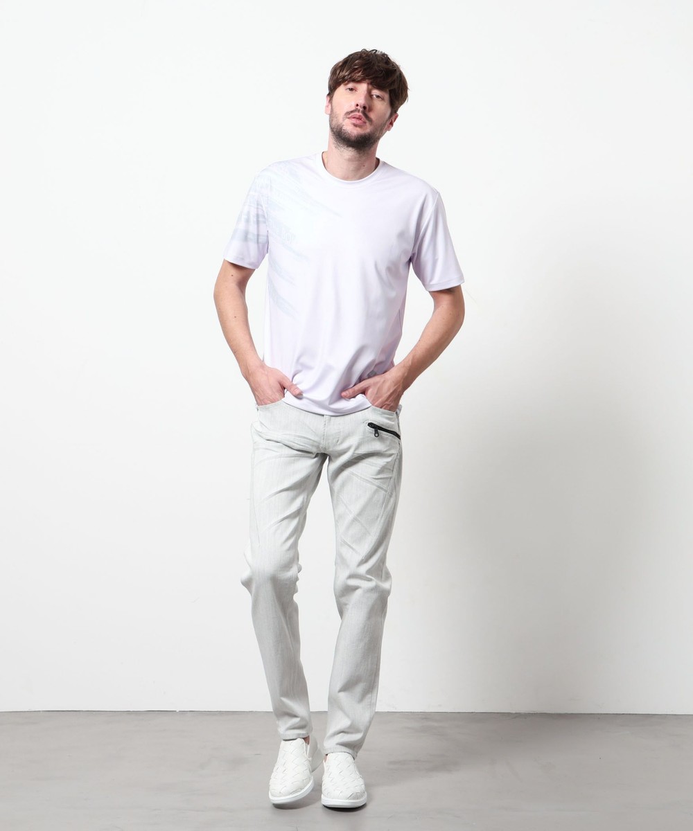 ポンチ素材にバイヤスハケメ×ロゴ柄を昇華転写でプリントした一際目を惹く、クルーネック半袖プルオーバーになります。