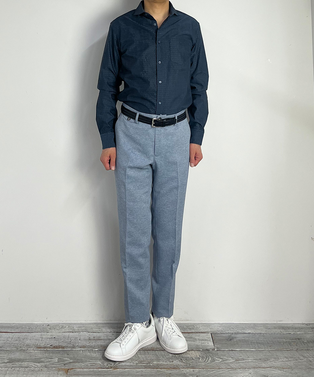 コットンとポリエステルを混紡し、程よい張り感と、肌触りの良い着用感を両立した、シーズンレスファブリック。