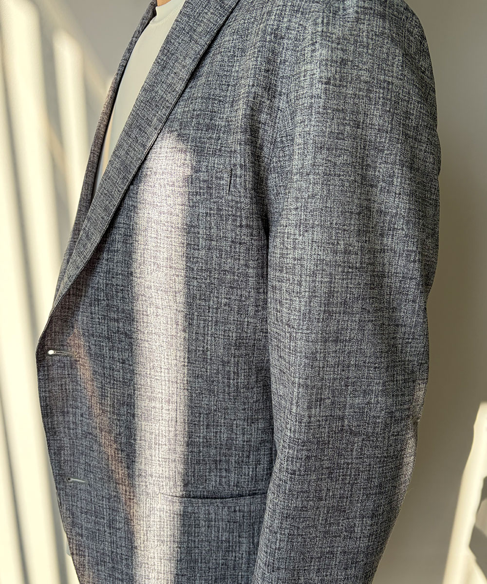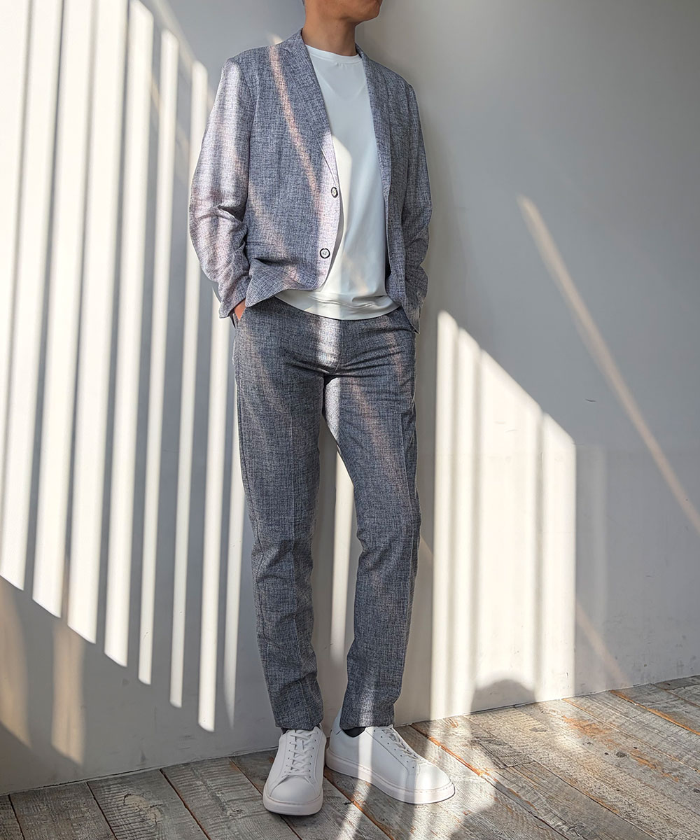 絶妙な凹凸感と、レーヨンの混紡により、ドライタッチ感と滑らかさを両立したテクニカル素材。