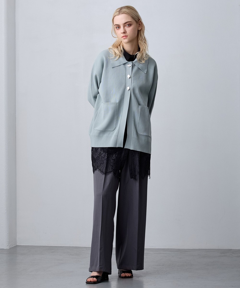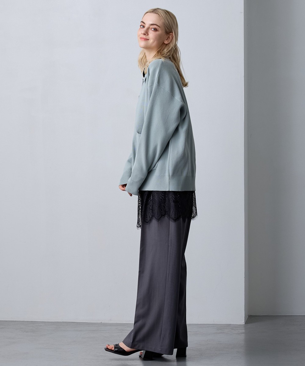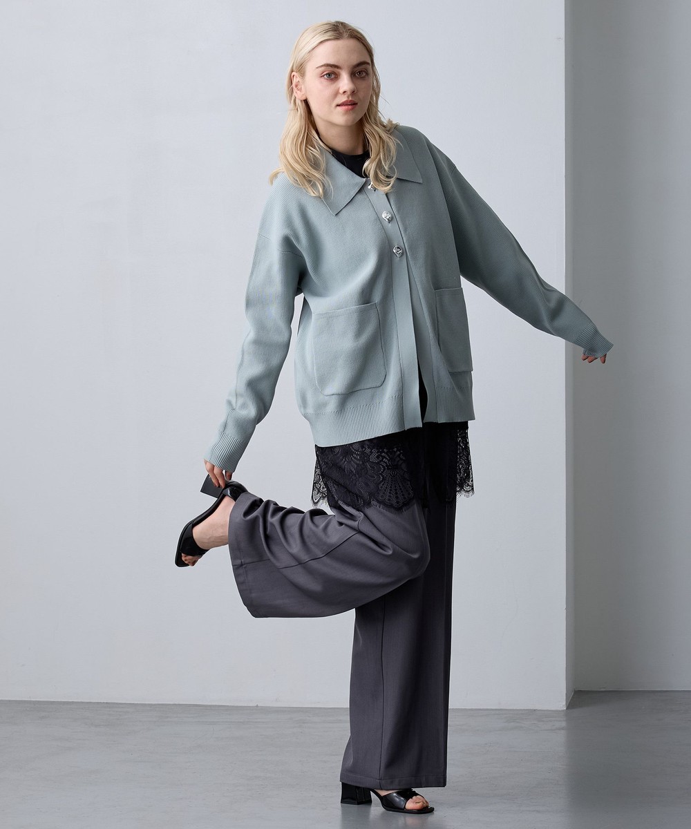釦は上部のみのためレースインナーとの合わせで裾から中のトップスを見せるスタイリングもおすすめです。