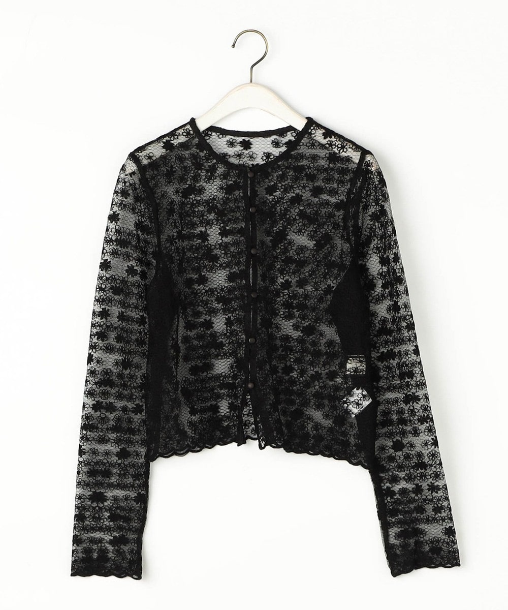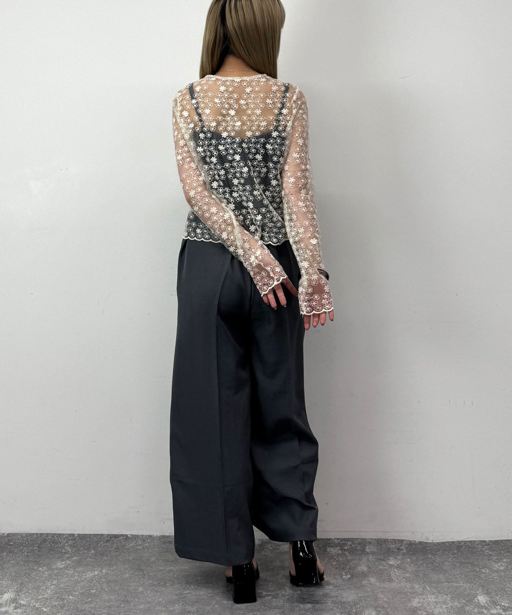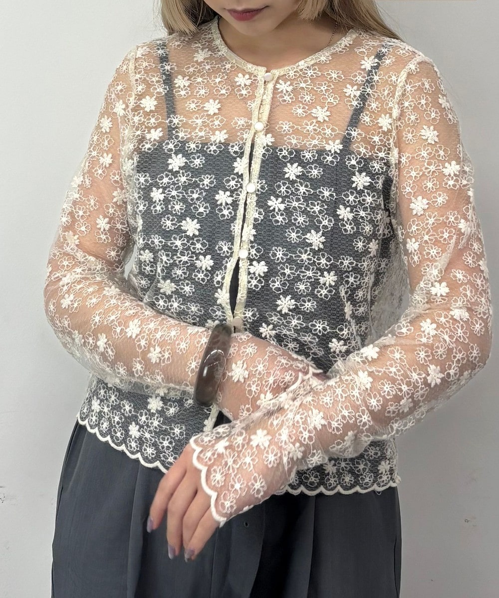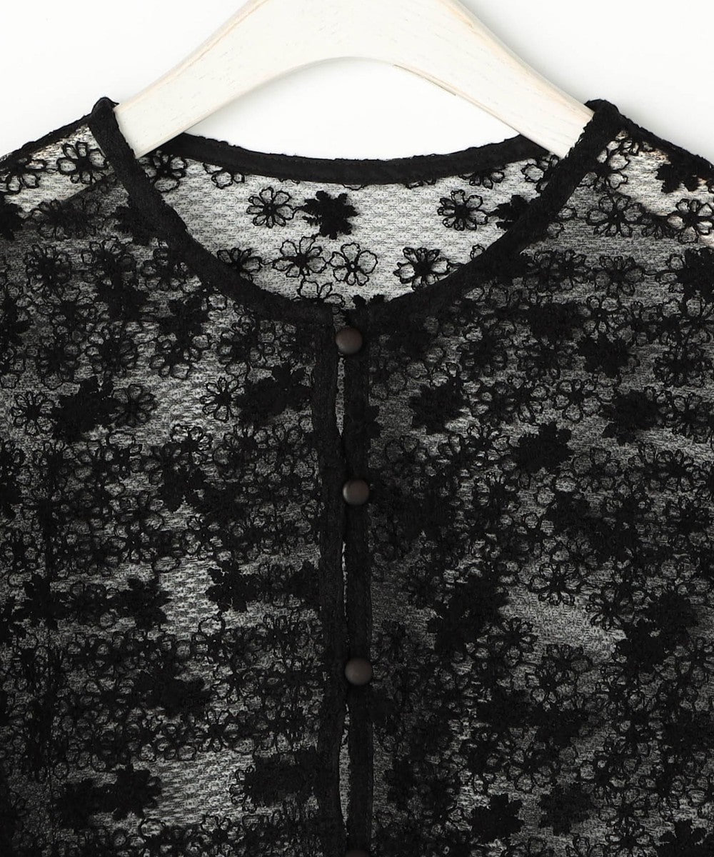 全体に施された花柄のレース刺繍が華やかなトップス。