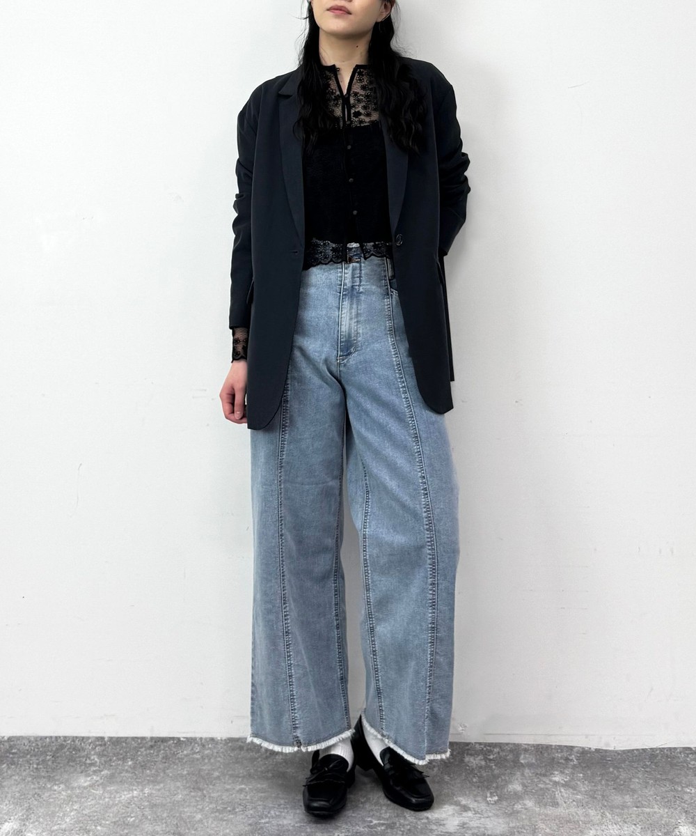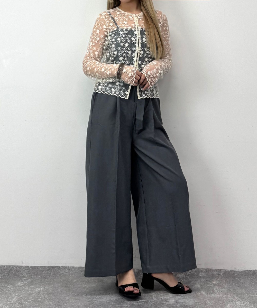 シアー感が強く、ベーシックなカラーリングなのでインナーで差し色を入れていただいたり上にプリントTシャツなどを合わせていただいたレイヤードスタイルがおすすめです。