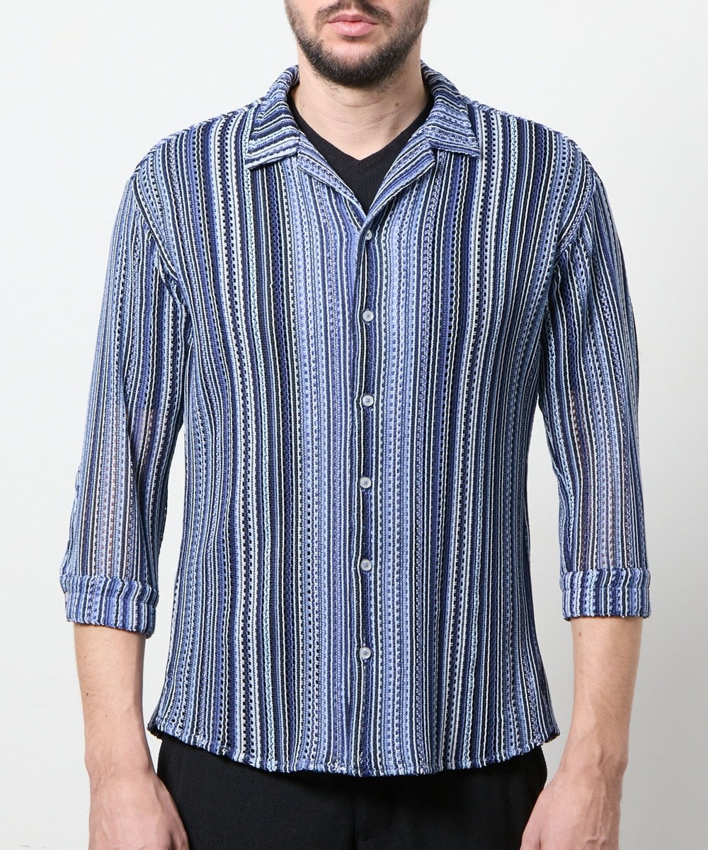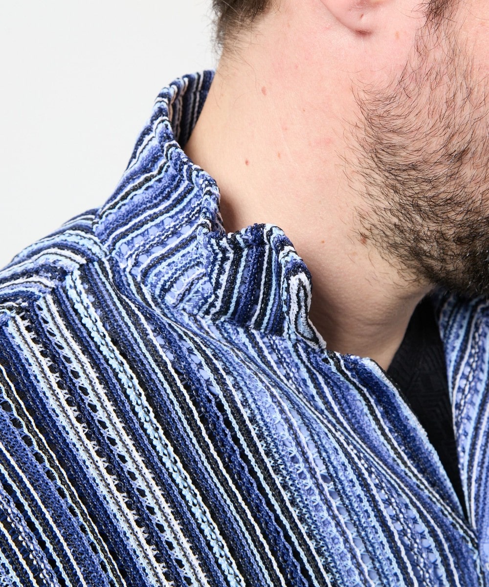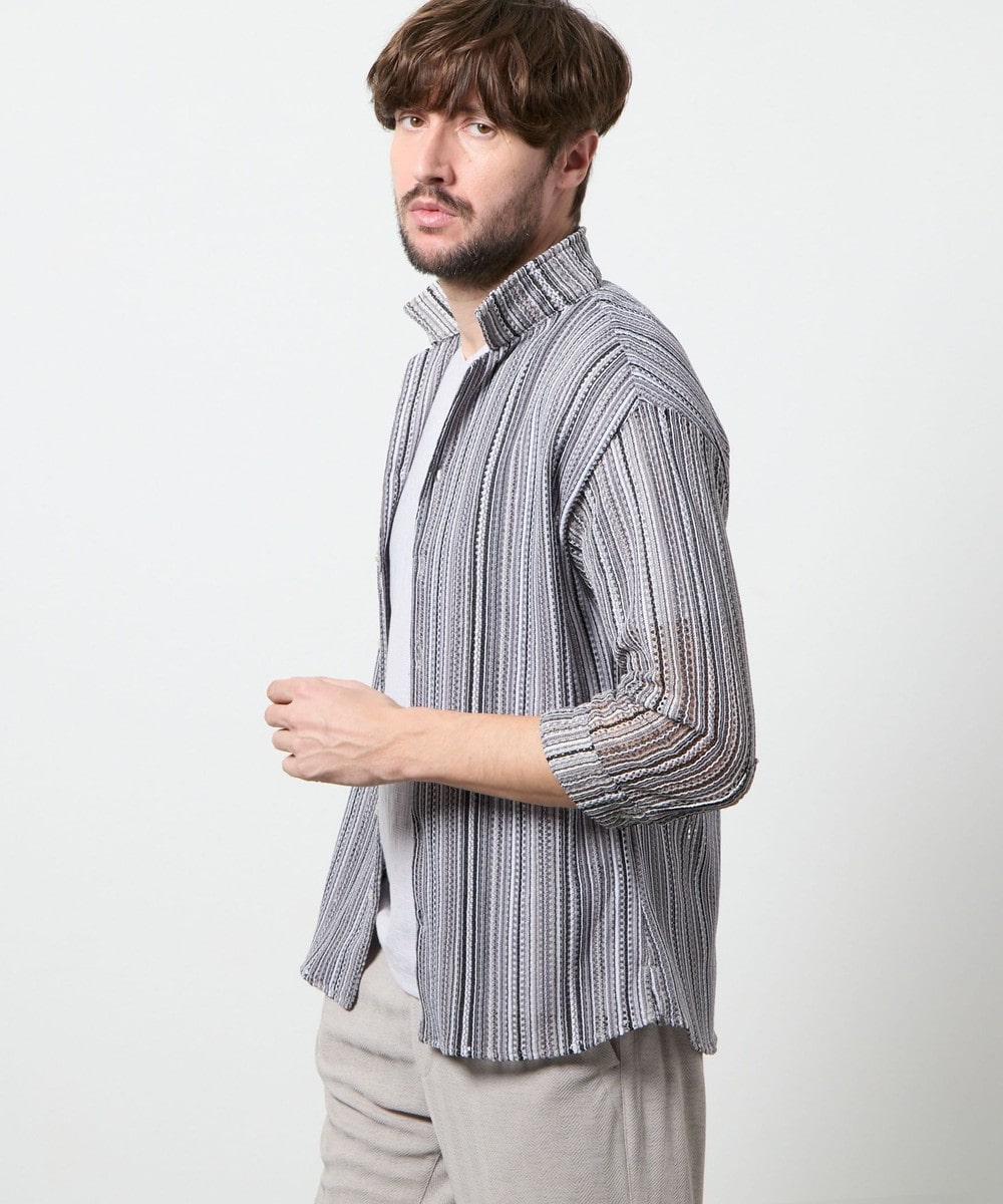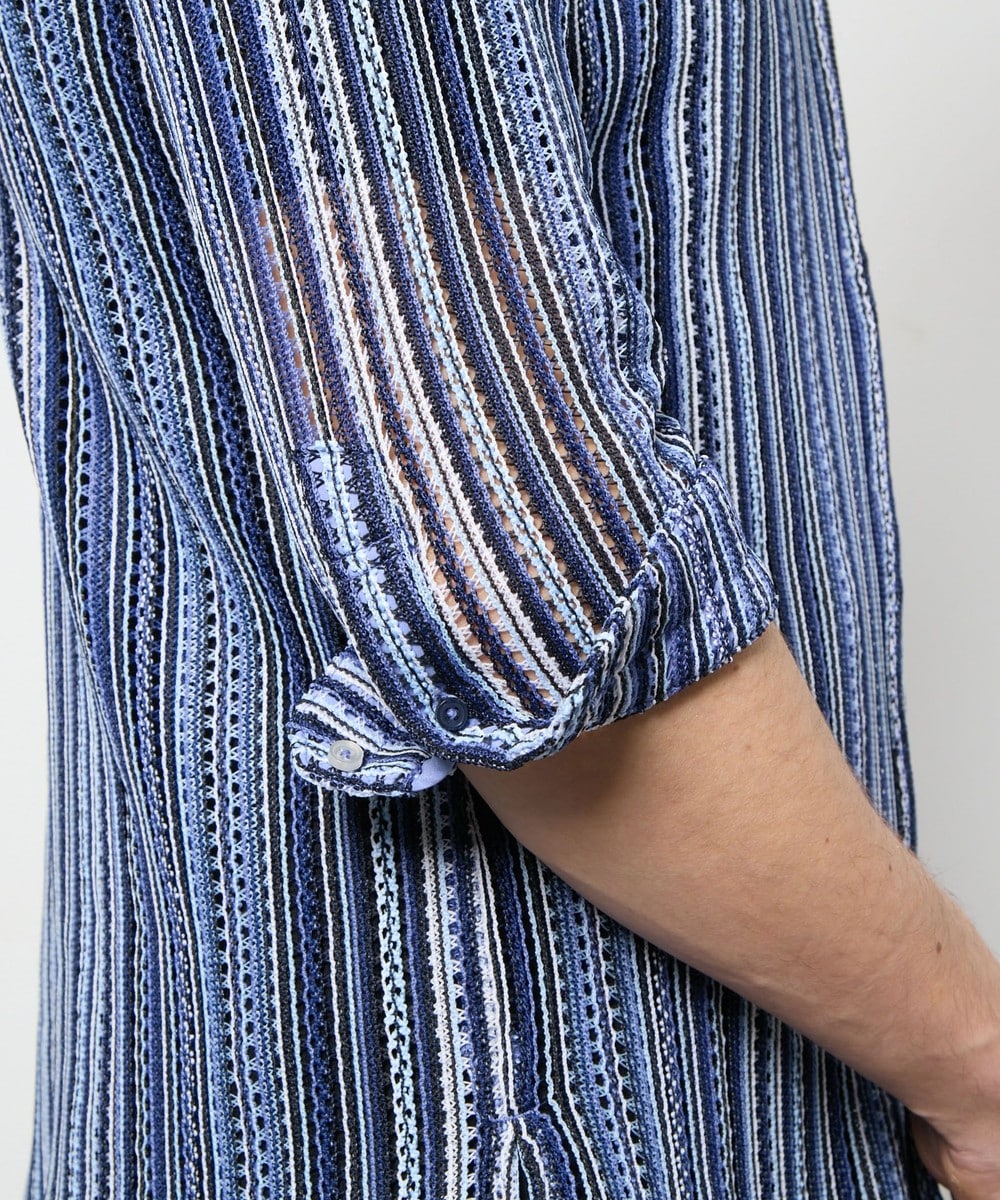 衿を立ててイタリアンカラーの様にも、寝かせてオープンカラーの様にも着用出来るようにしたスタンドオープンカラーデザインの7分袖デザイン。