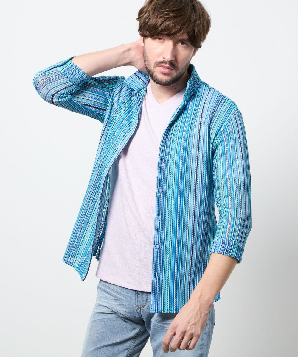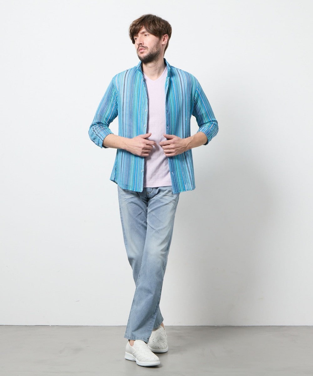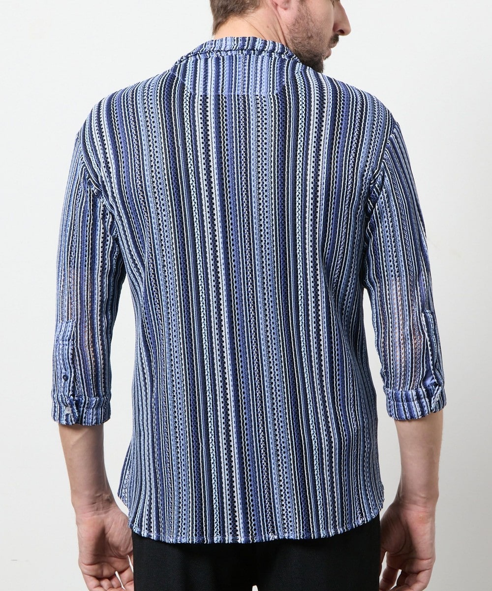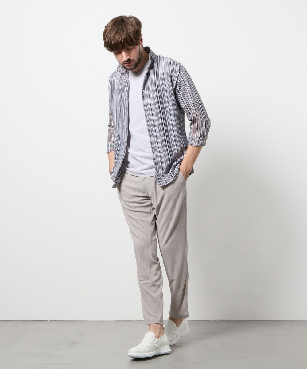 衿を立ててイタリアンカラーの様にも、寝かせてオープンカラーの様にも着用出来るようにしたスタンドオープンカラーデザインの7分袖デザイン。