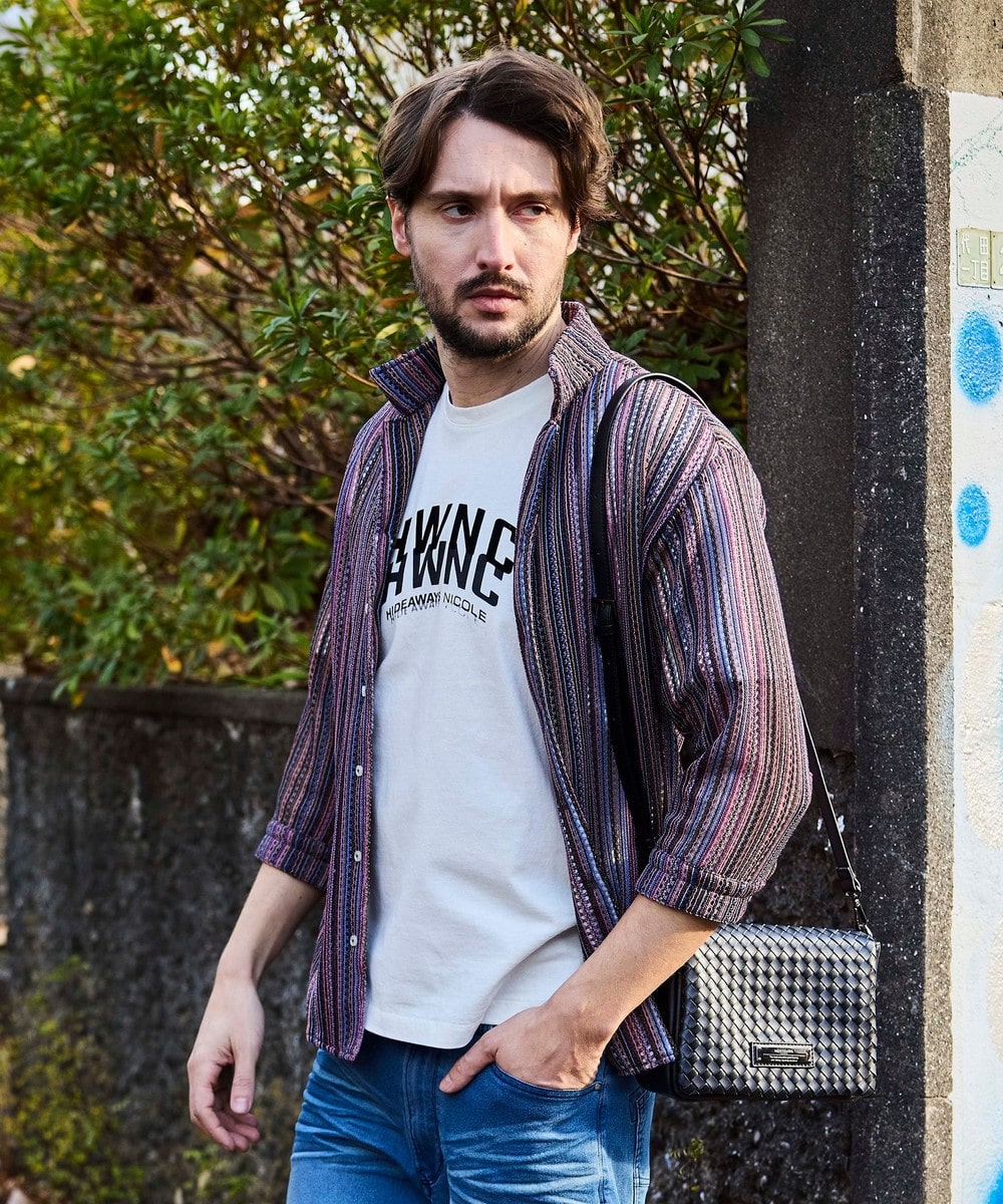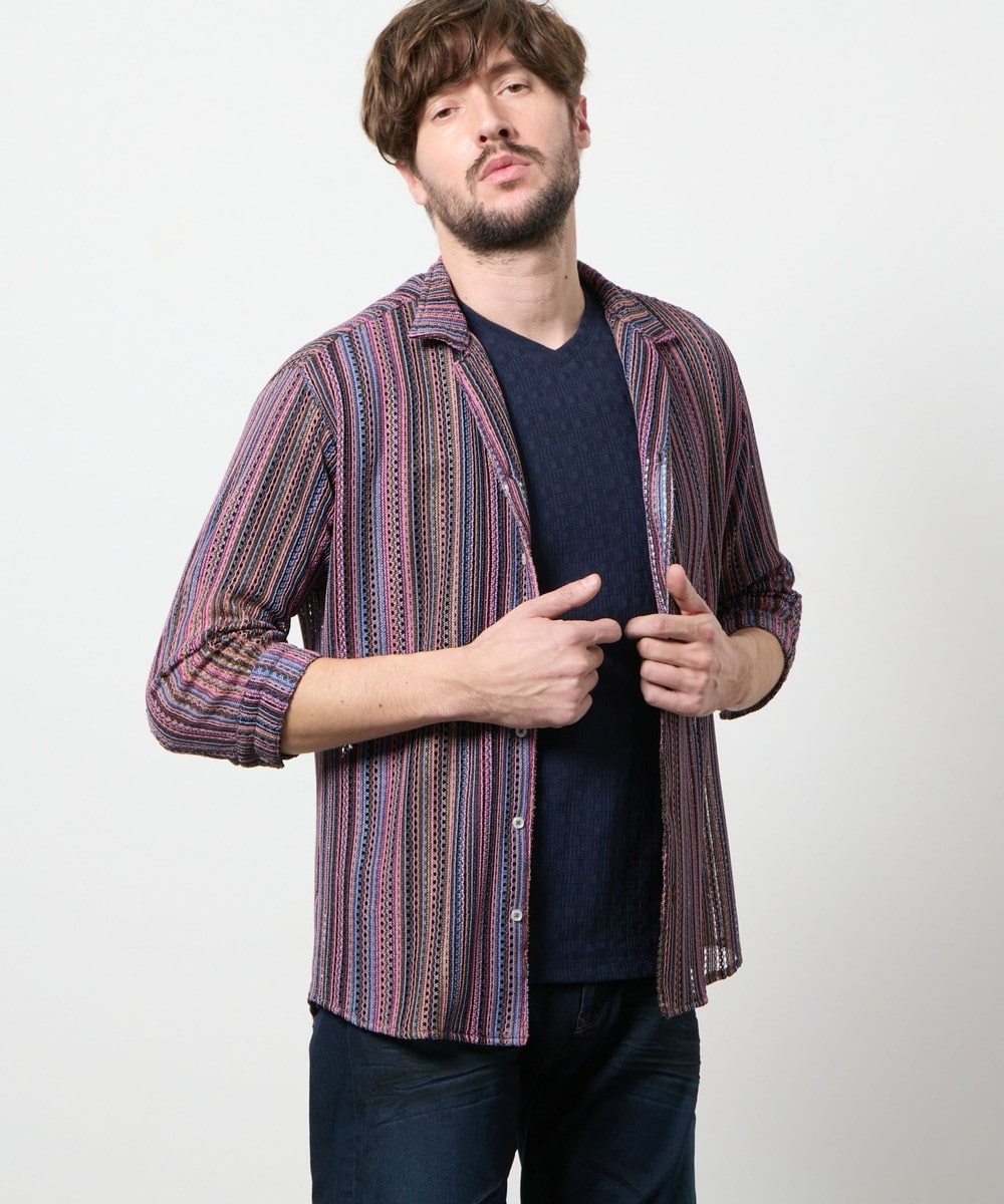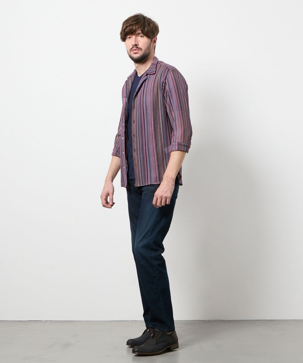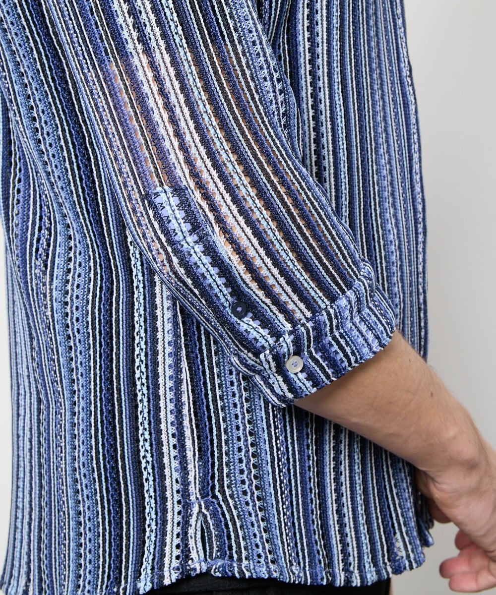 衿を立ててイタリアンカラーの様にも、寝かせてオープンカラーの様にも着用出来るようにしたスタンドオープンカラーデザインの7分袖デザイン。