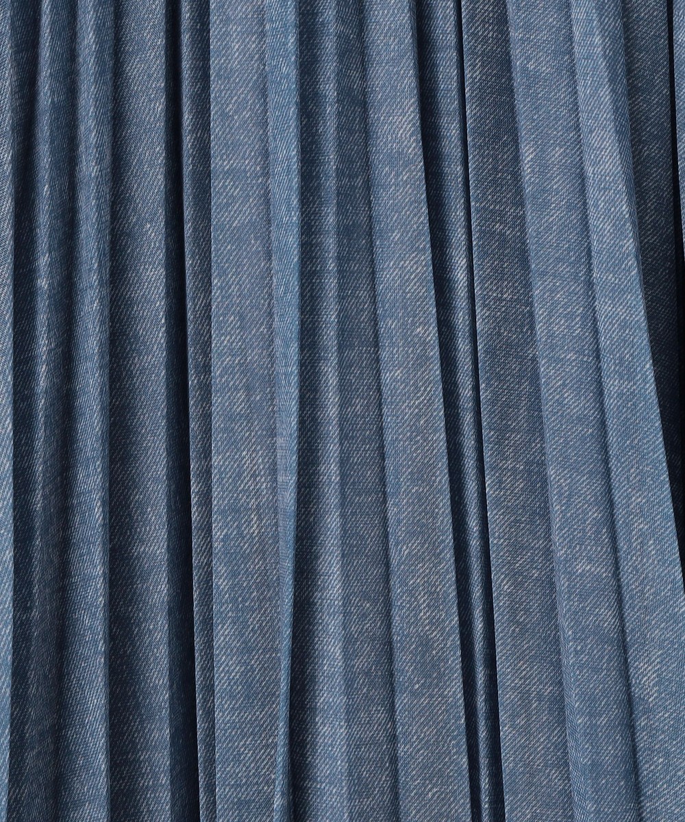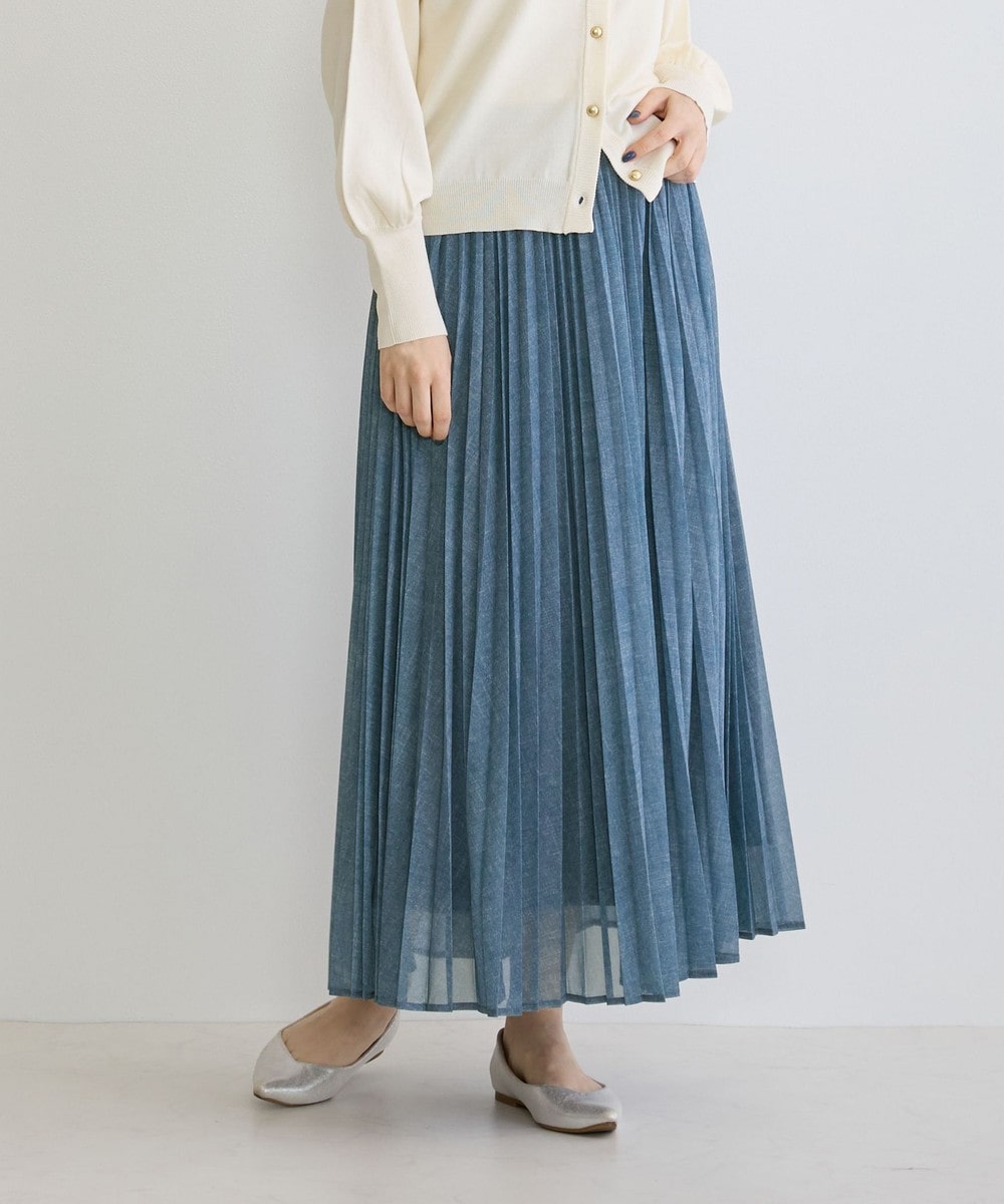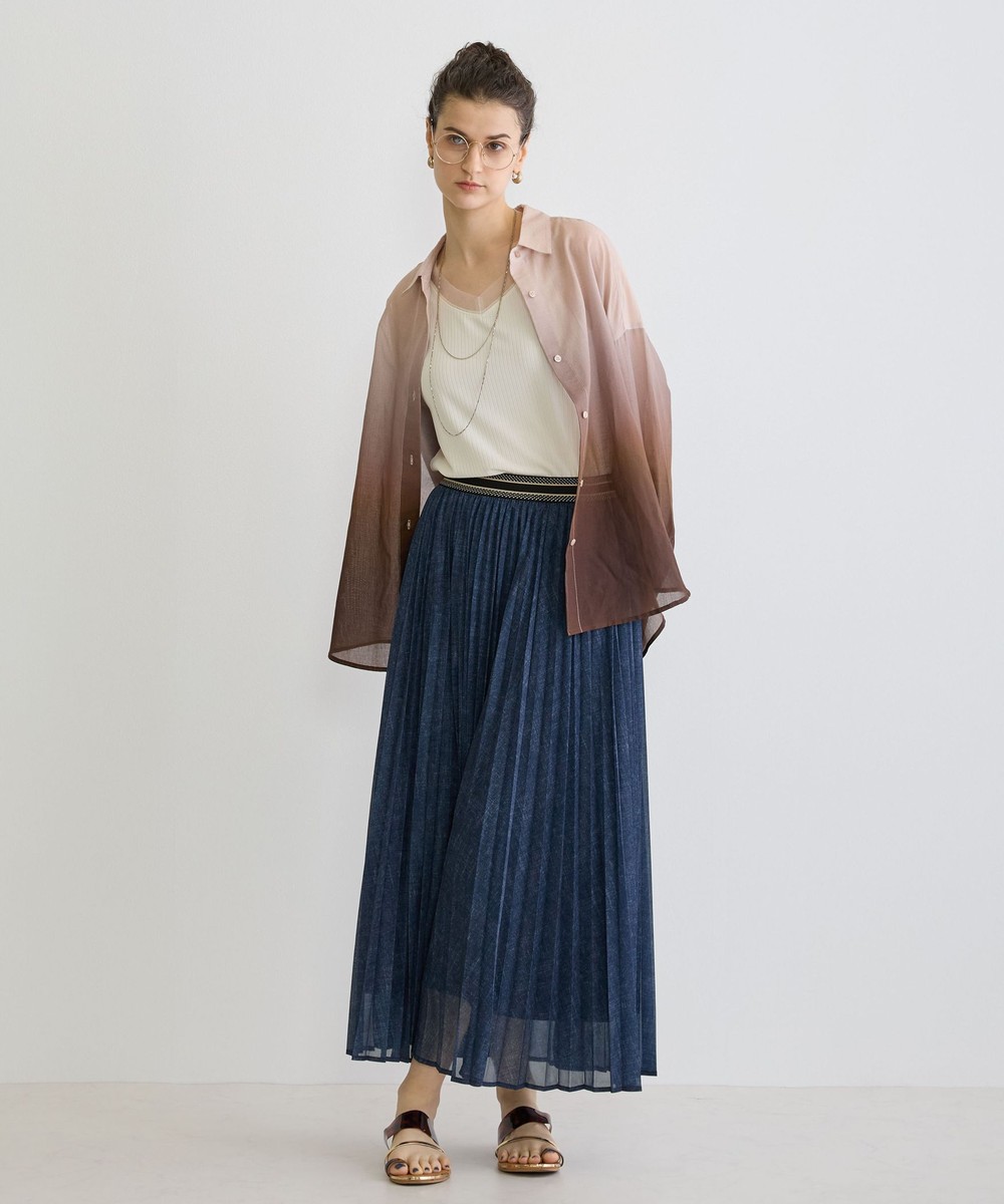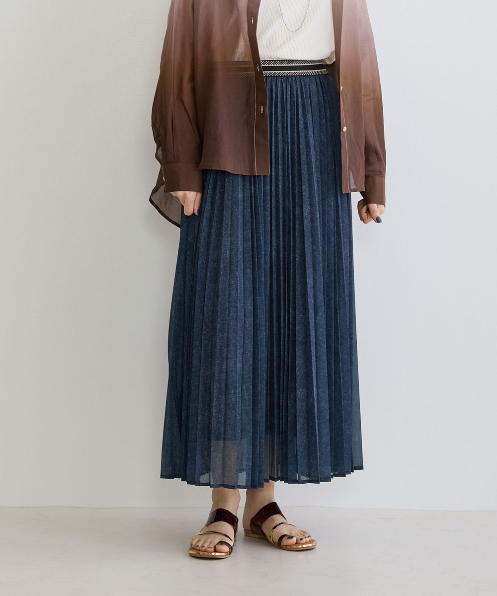 シアー感ある素材はデニム調でカジュアルダウン。ふんわりと揺れるプリーツ感が◎