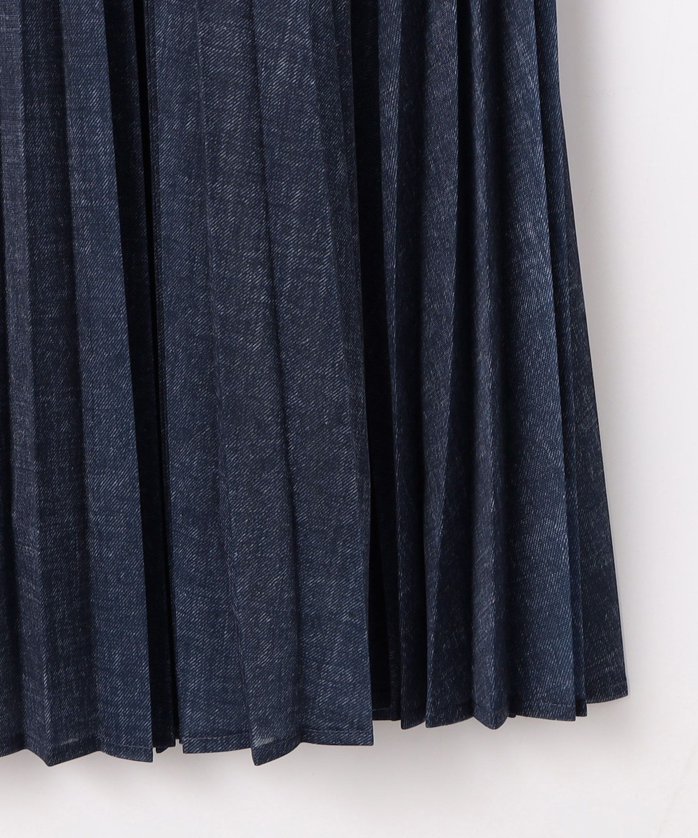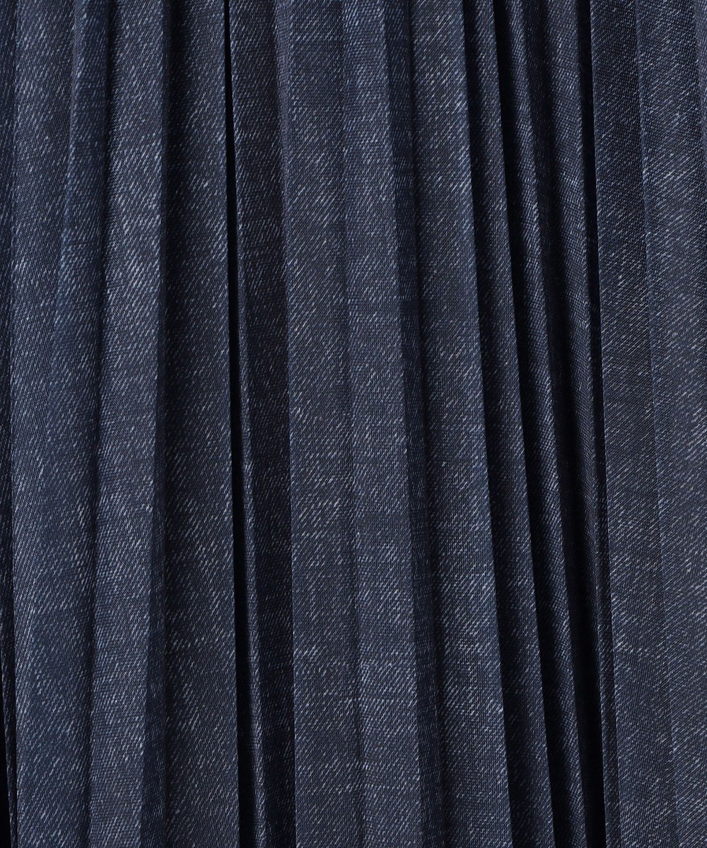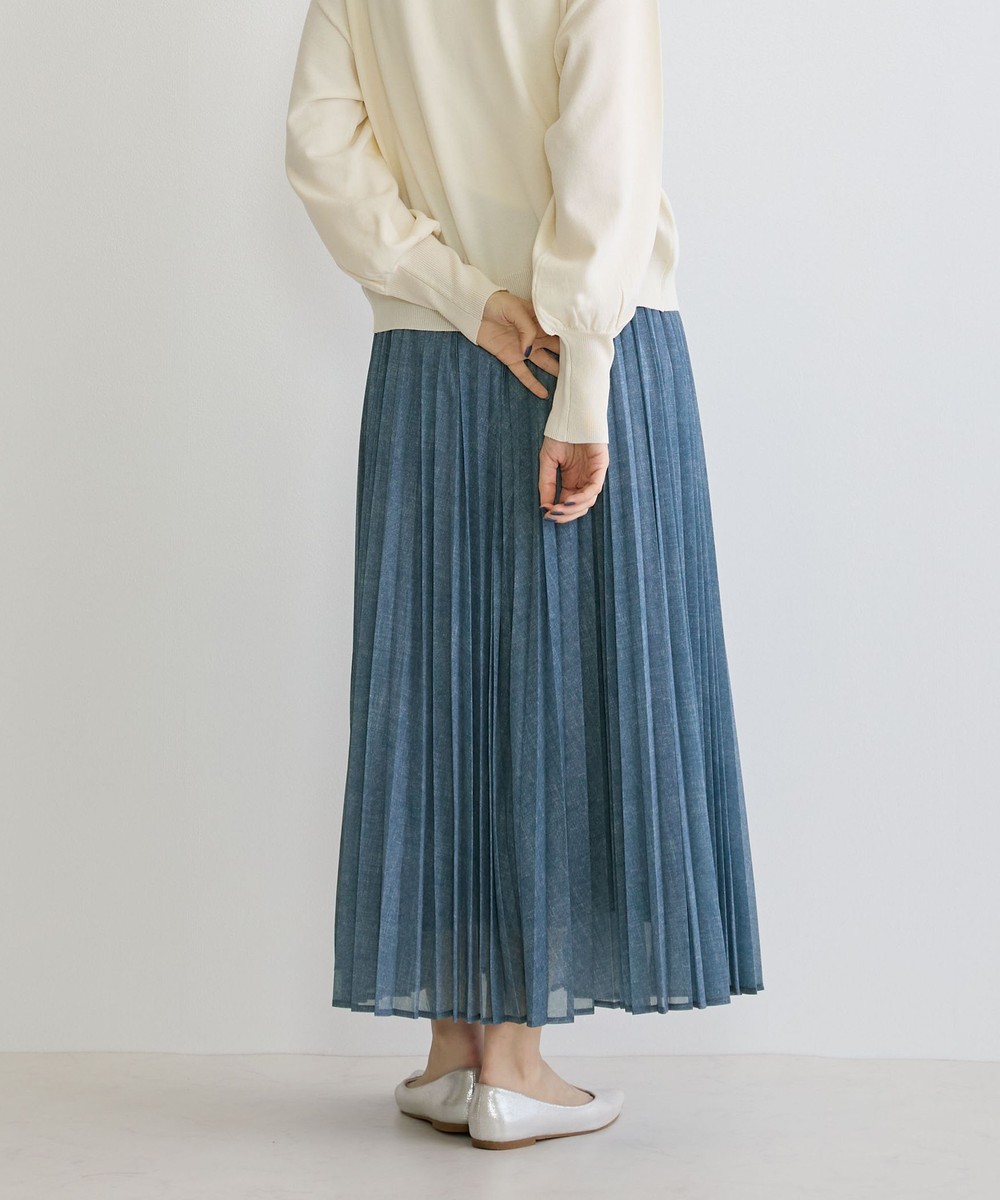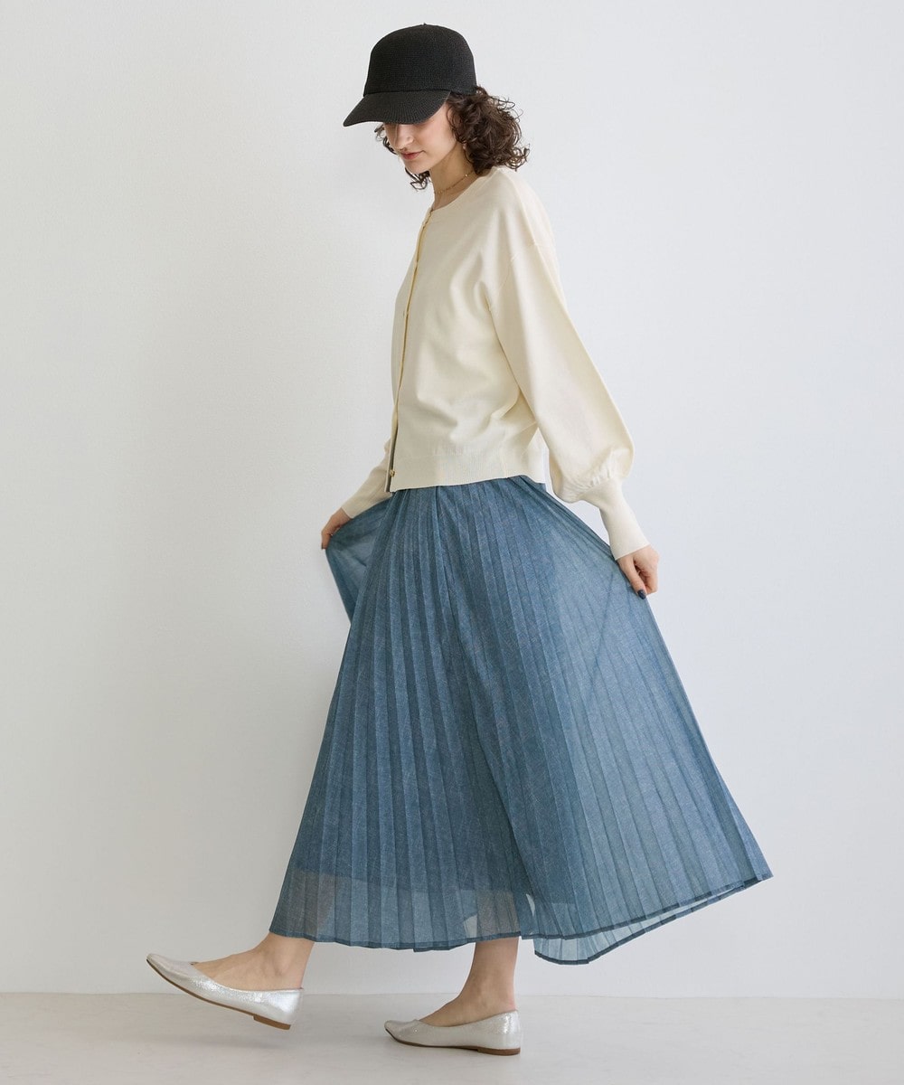 シアー感ある素材はデニム調でカジュアルダウン。ふんわりと揺れるプリーツ感が◎