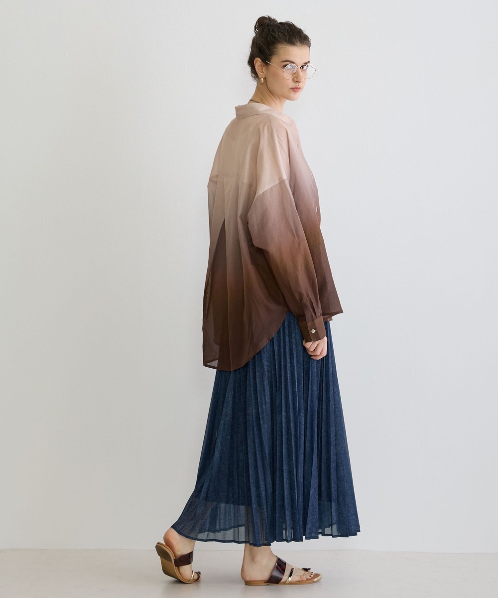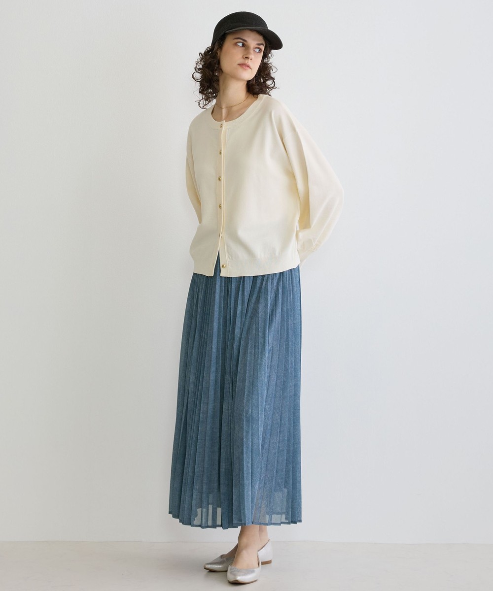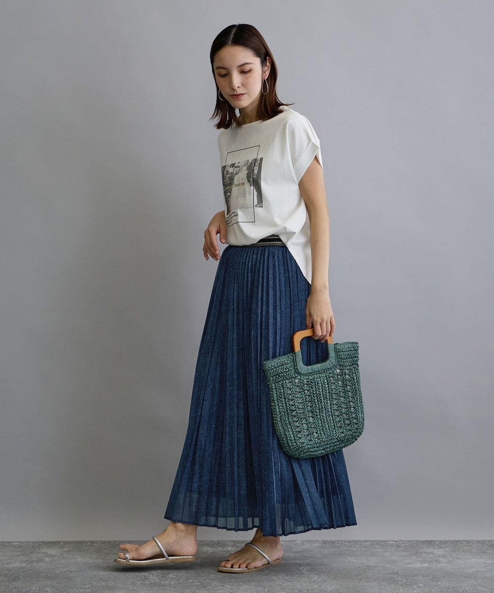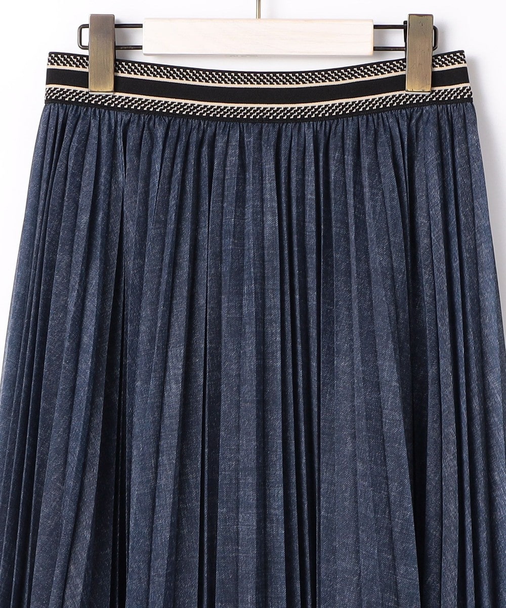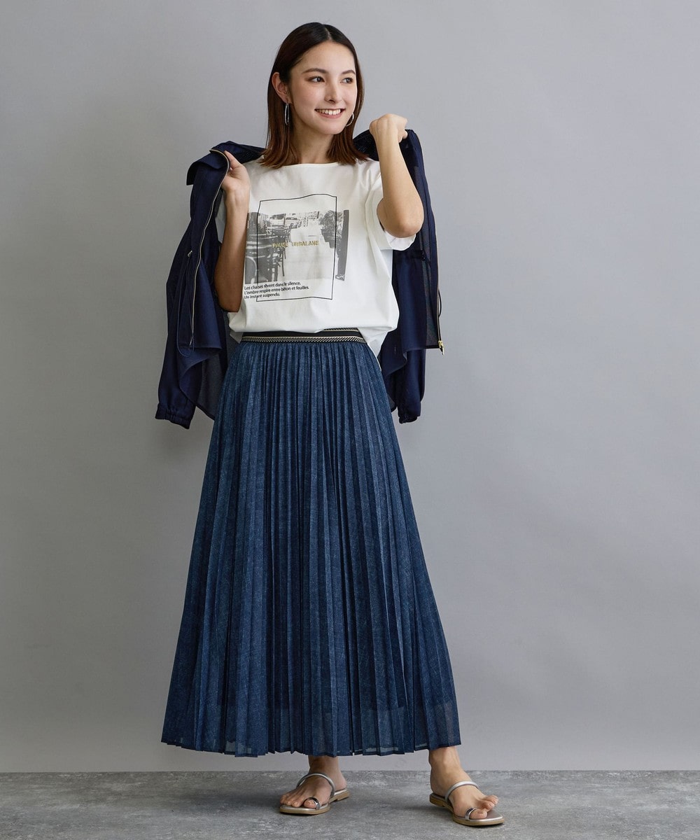 シアー感ある素材はデニム調でカジュアルダウン。ふんわりと揺れるプリーツ感が◎