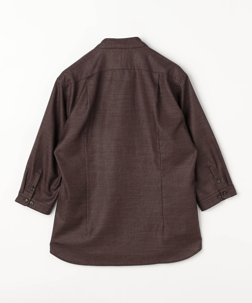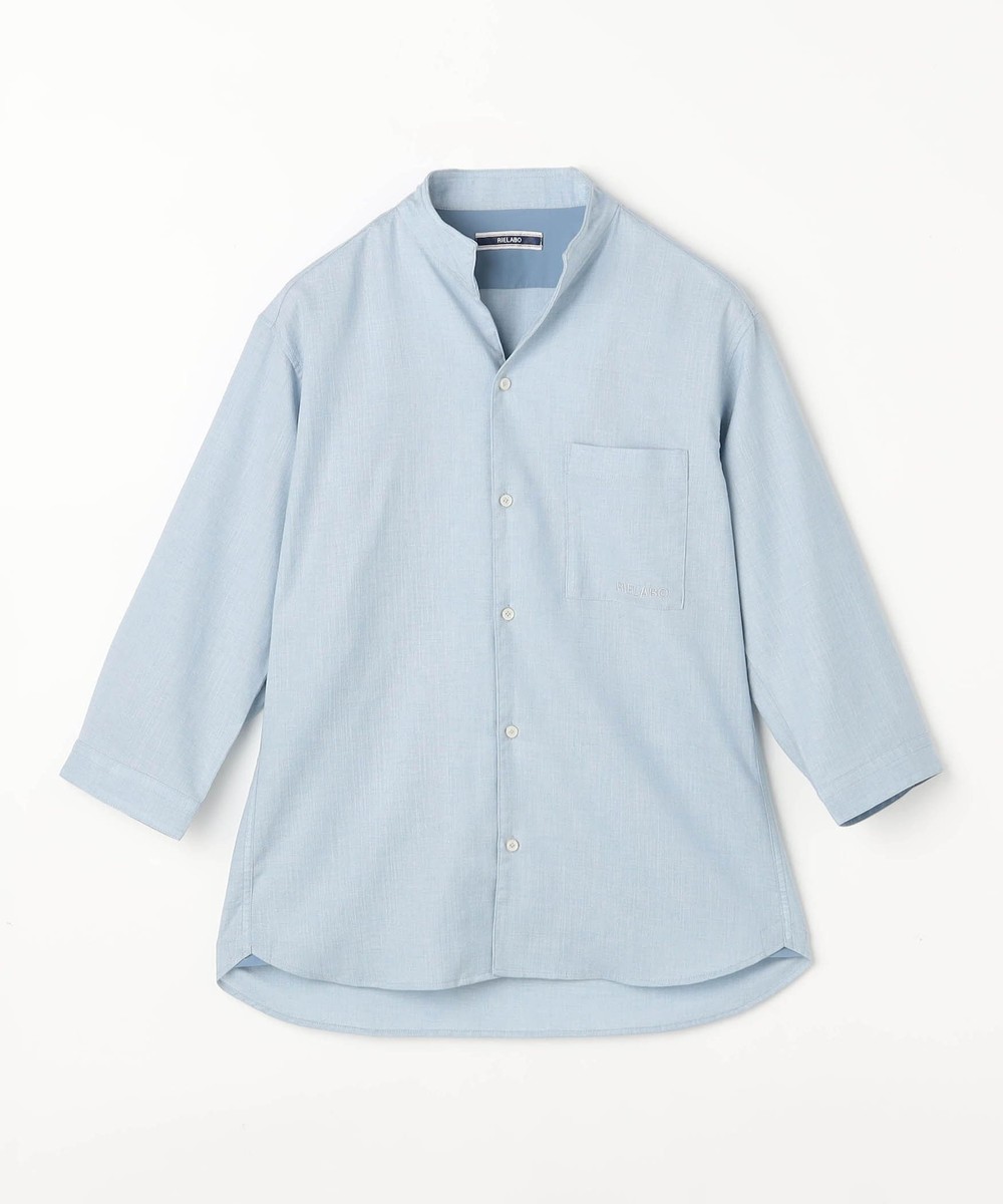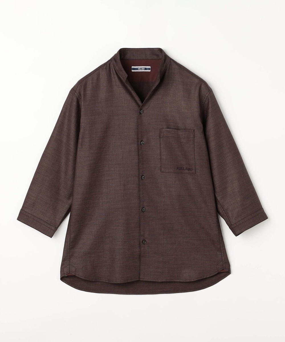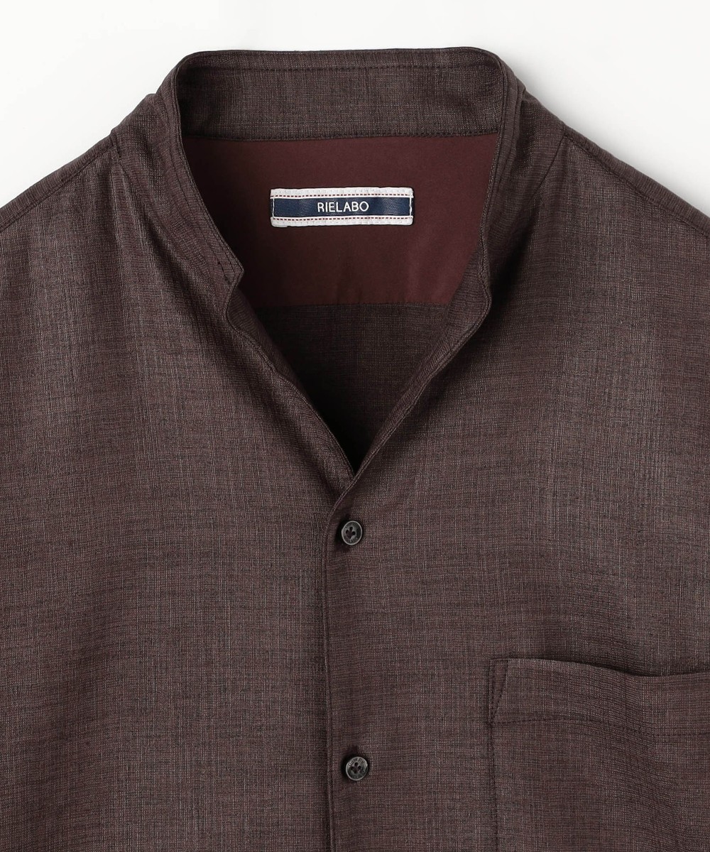 衿端にワイヤ-を仕込んだショートスタンドカラーシャツ。