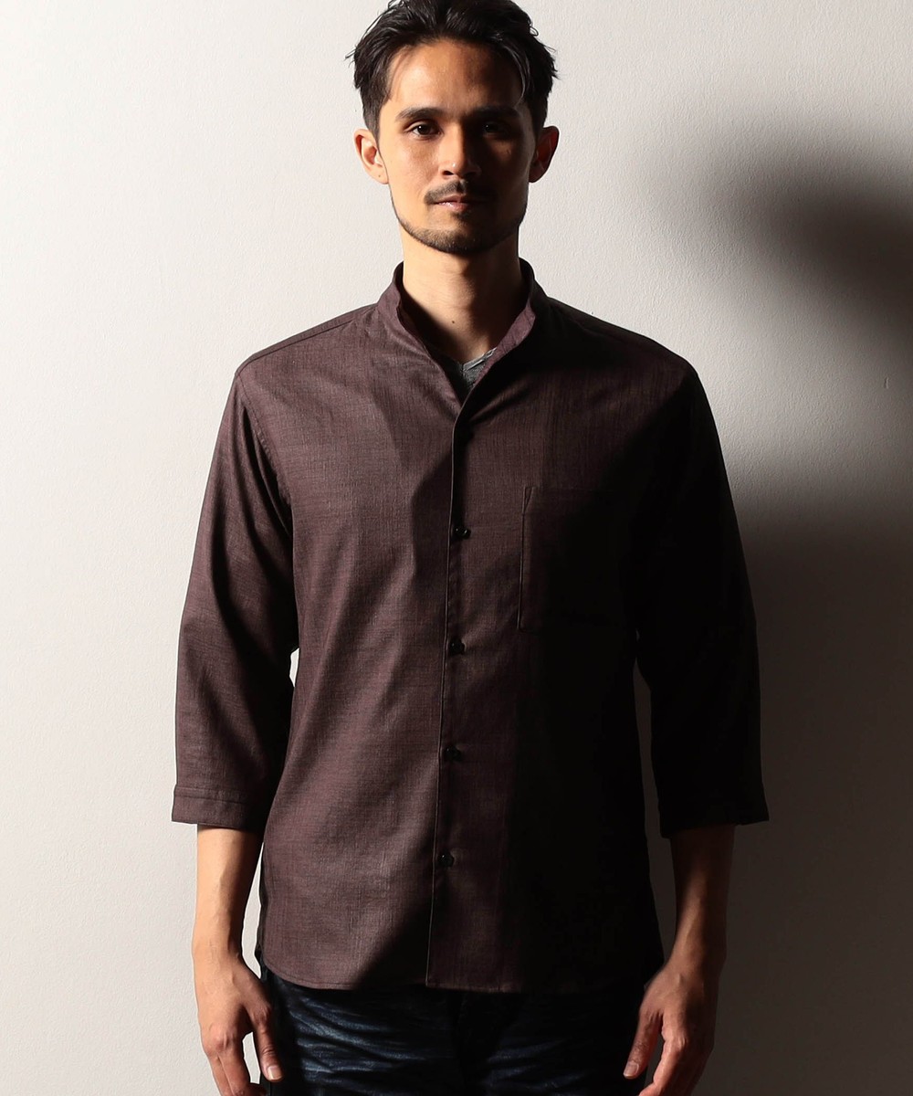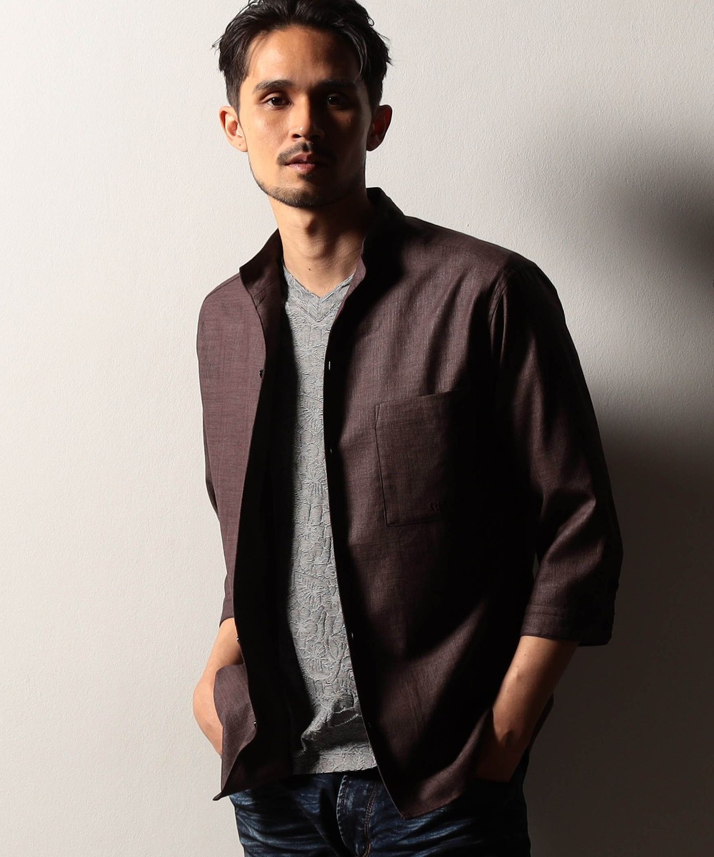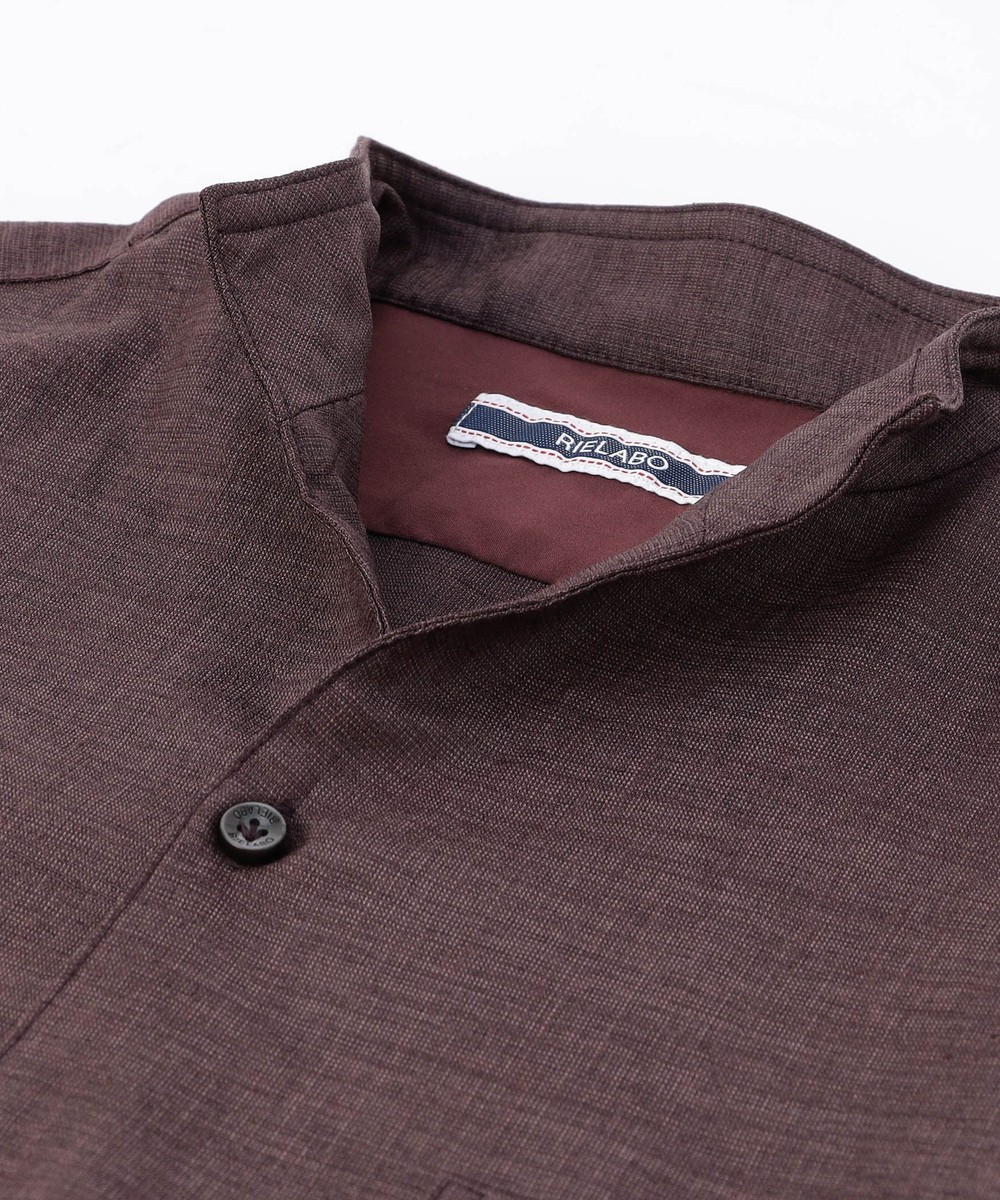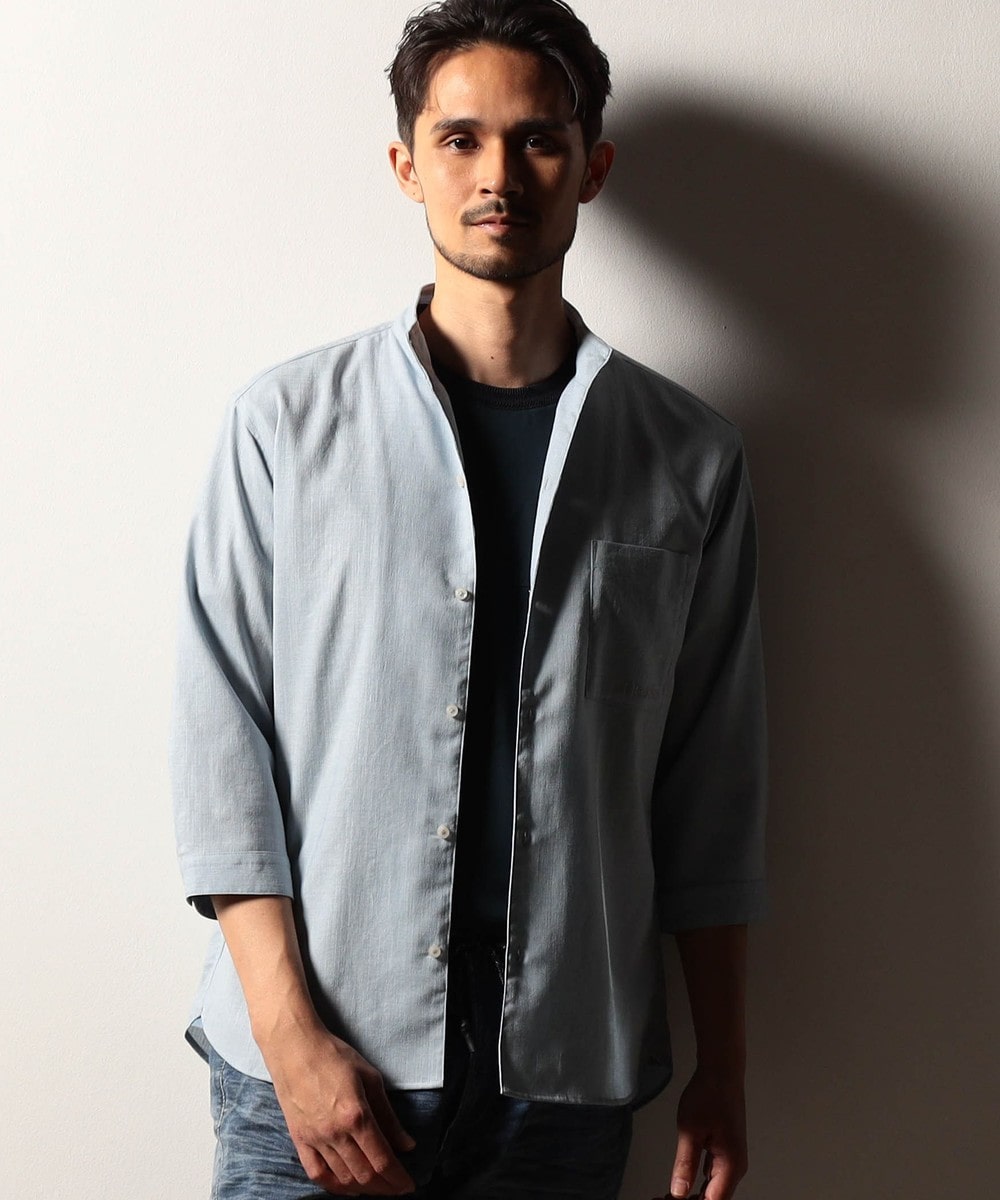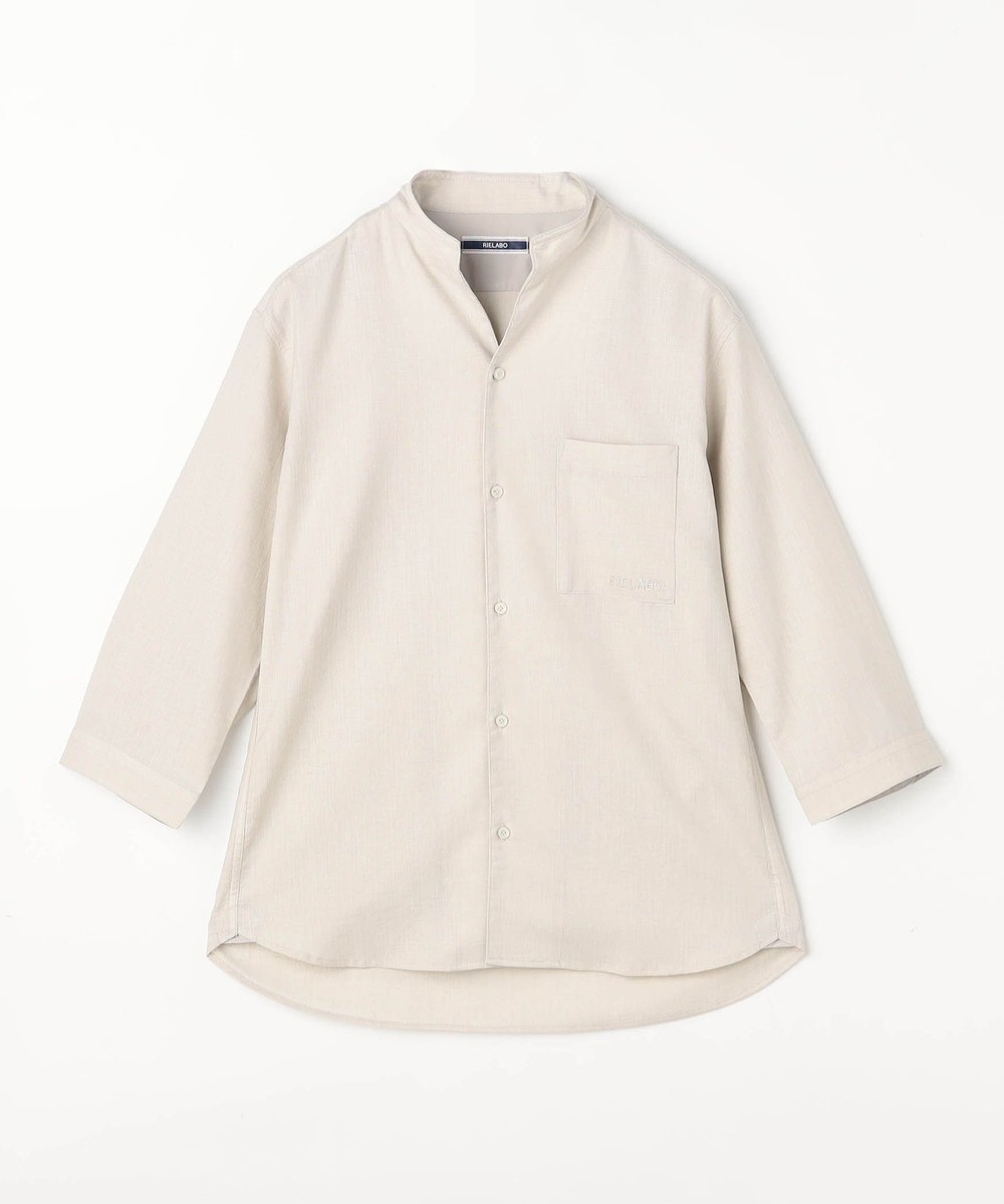 衿端にワイヤ-を仕込んだショートスタンドカラーシャツ。